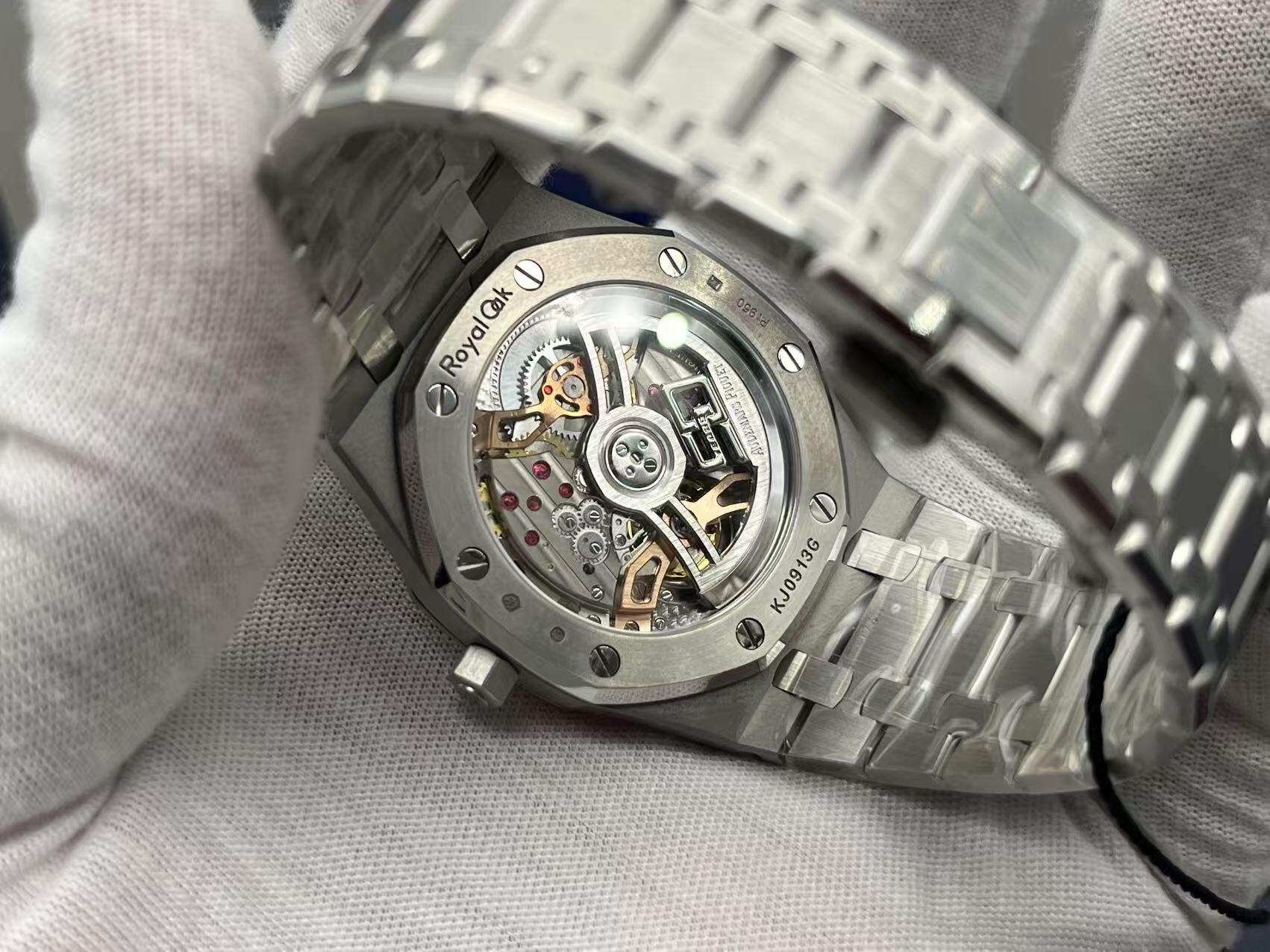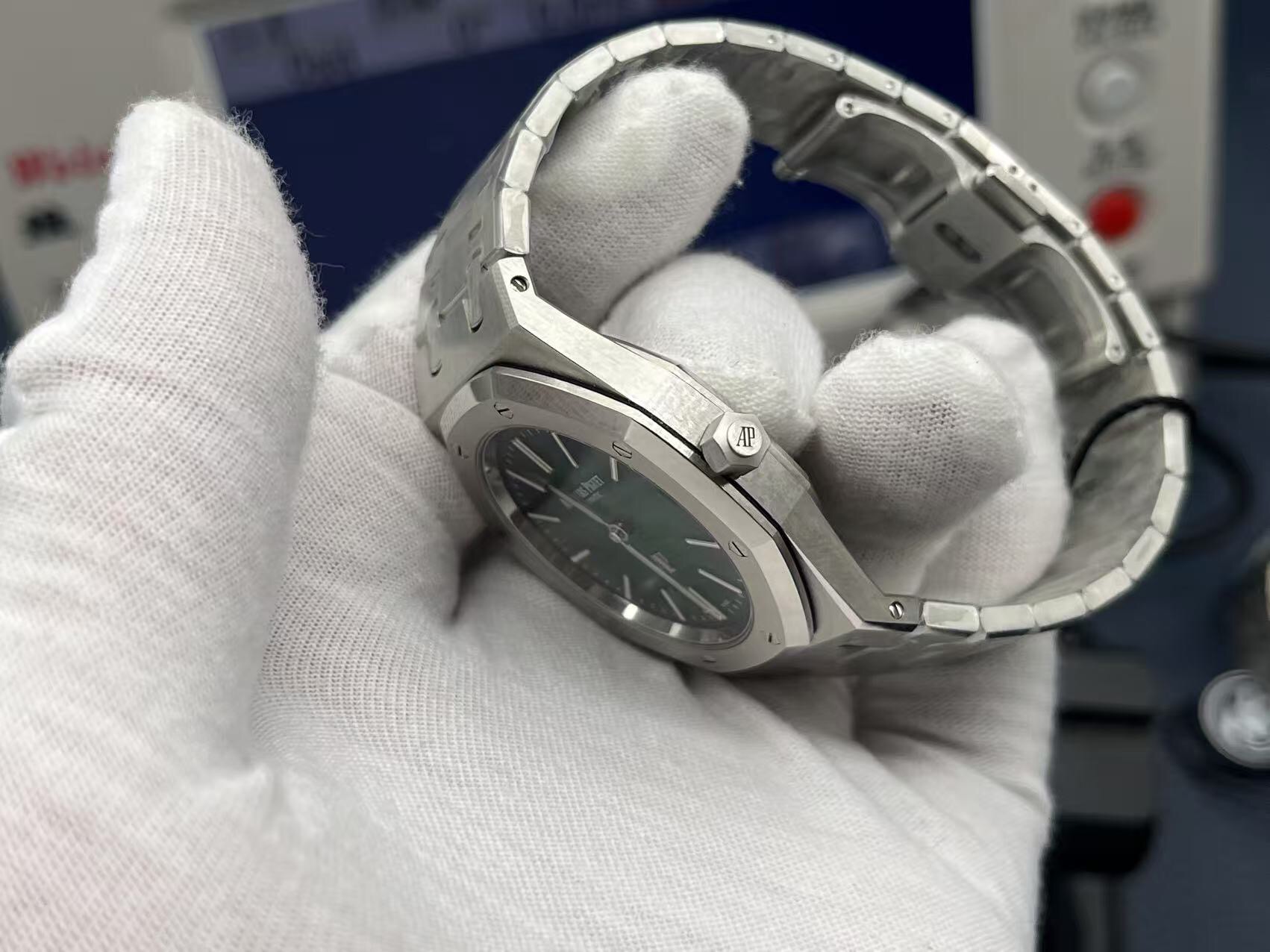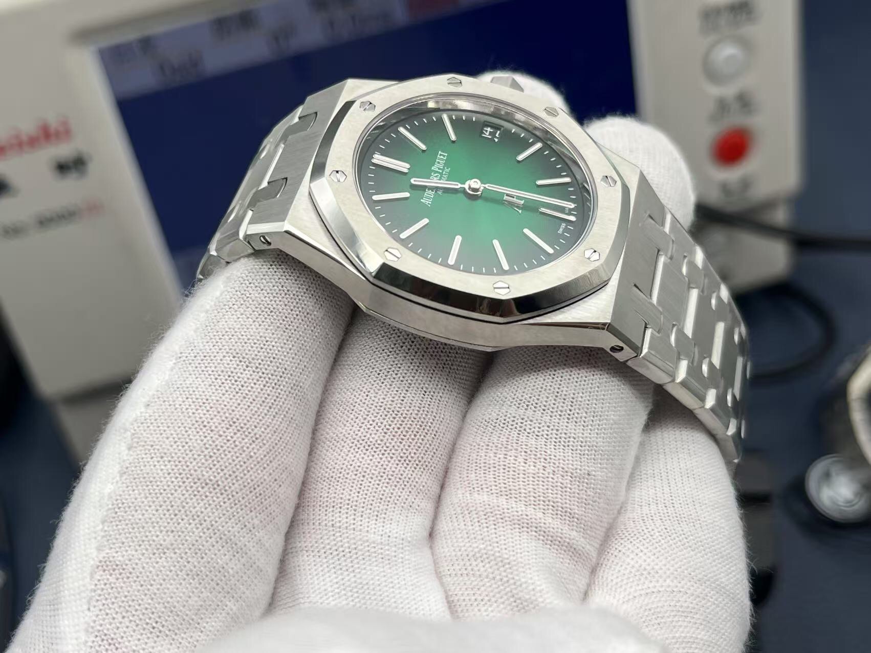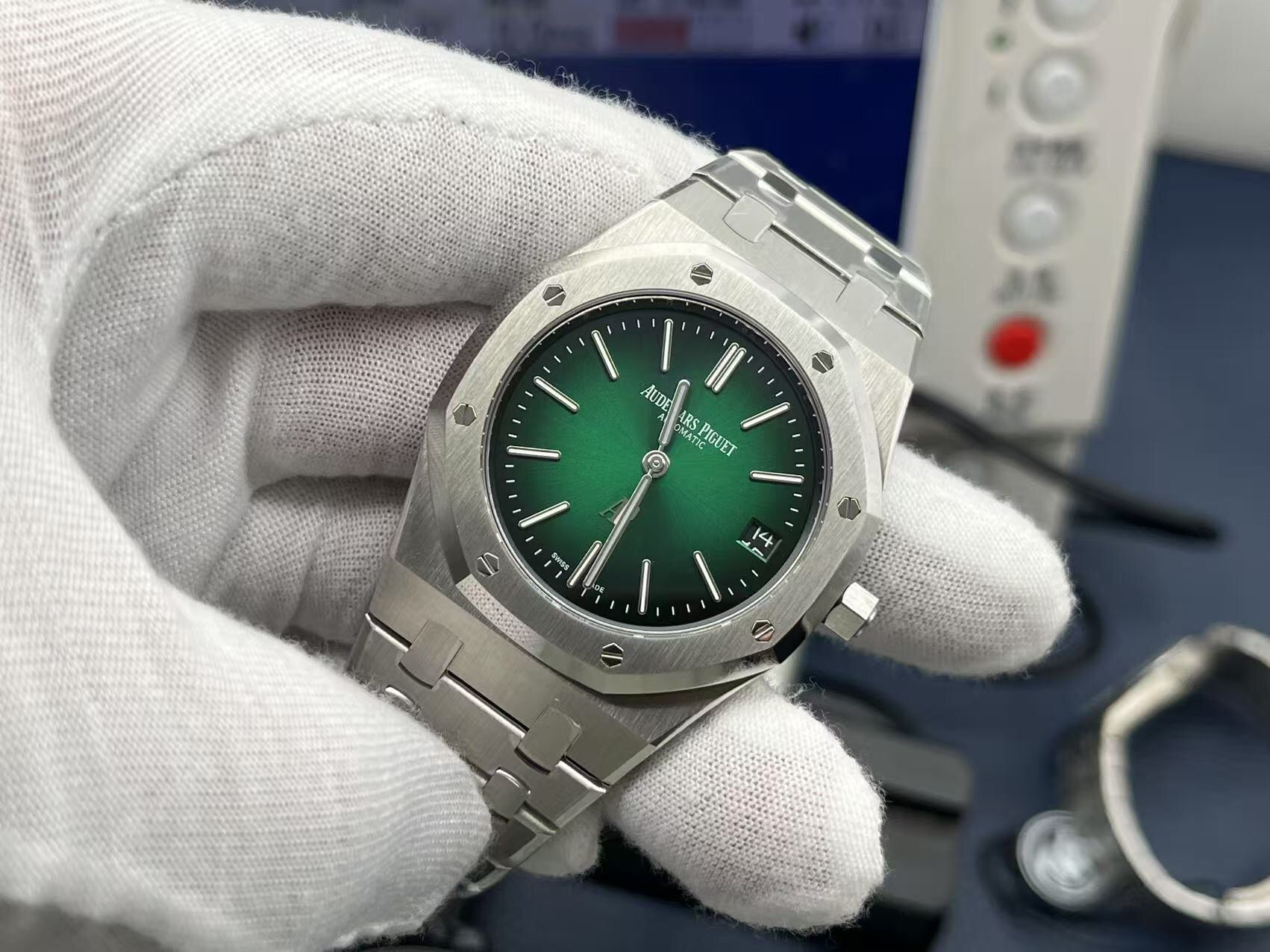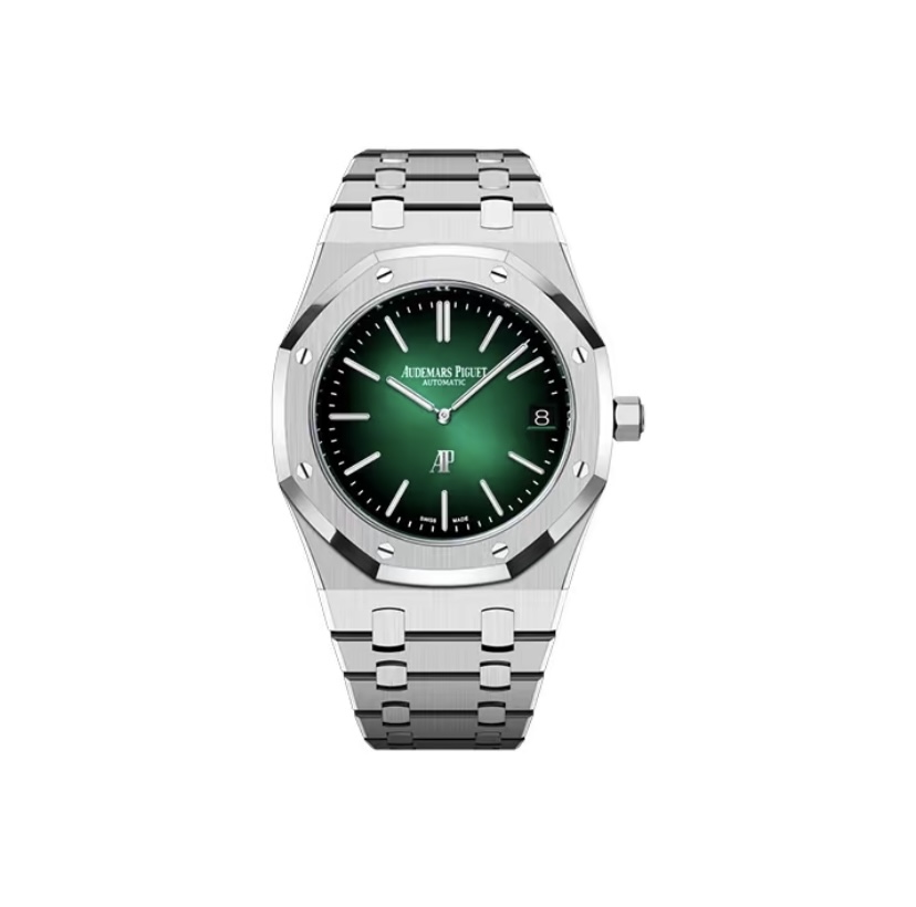 Royal Oak Jumbo 39mm, platinum case, green dial, Calibre 7121 automatic movement.