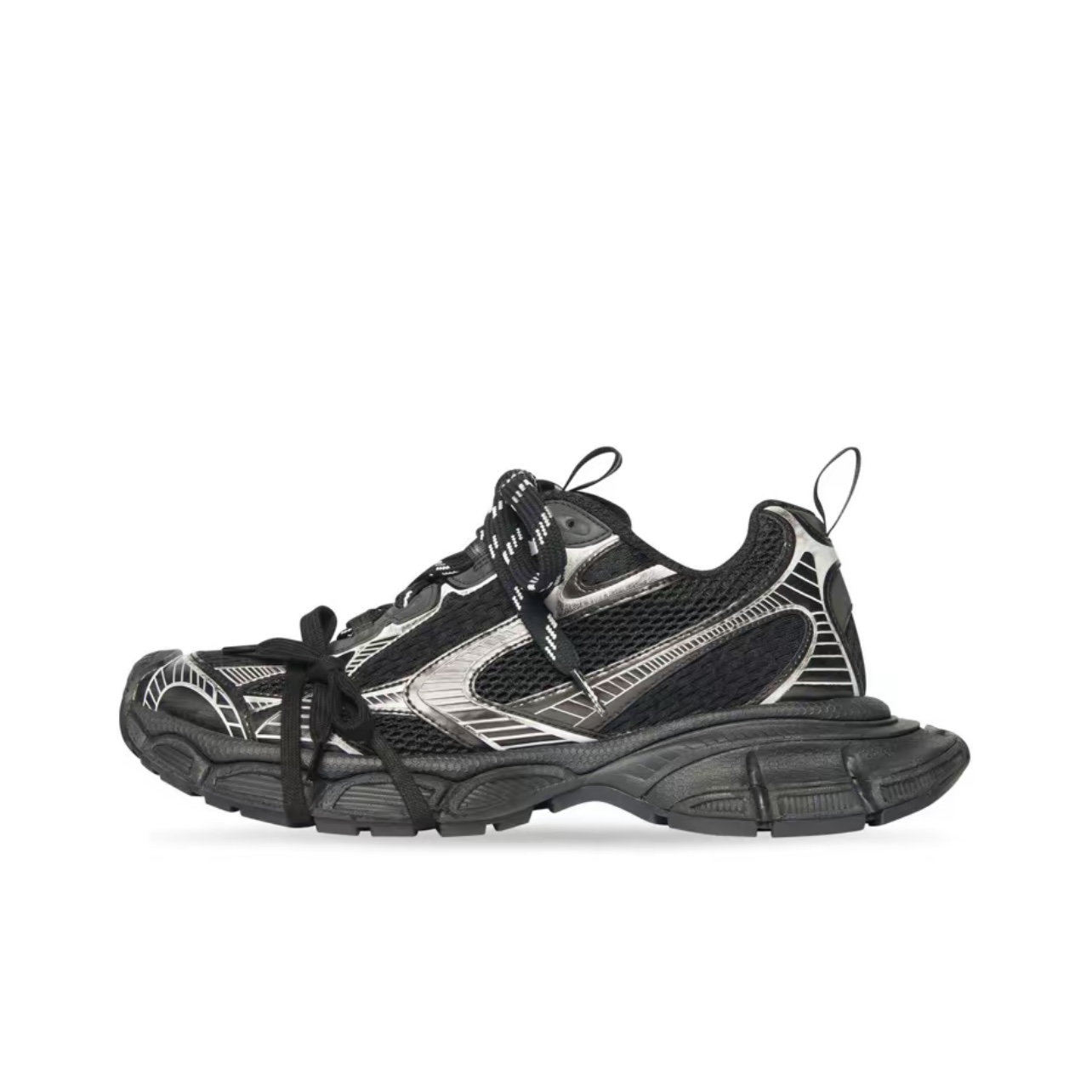 Sneakers with a mixed-material construction. Design features: Lace-Up, Thick-Soled, Low-Top, Distressed, Dad Sneakers. Primary color: Black Silver. Intended use: everyday wear and general lifestyle activities. Fit category: Unisex.