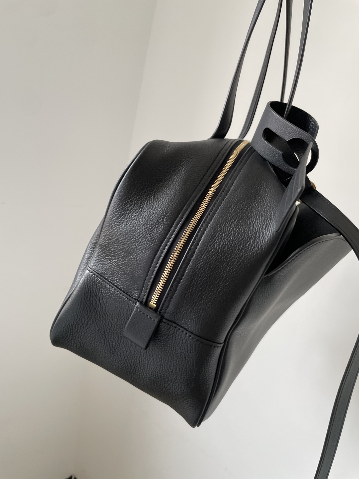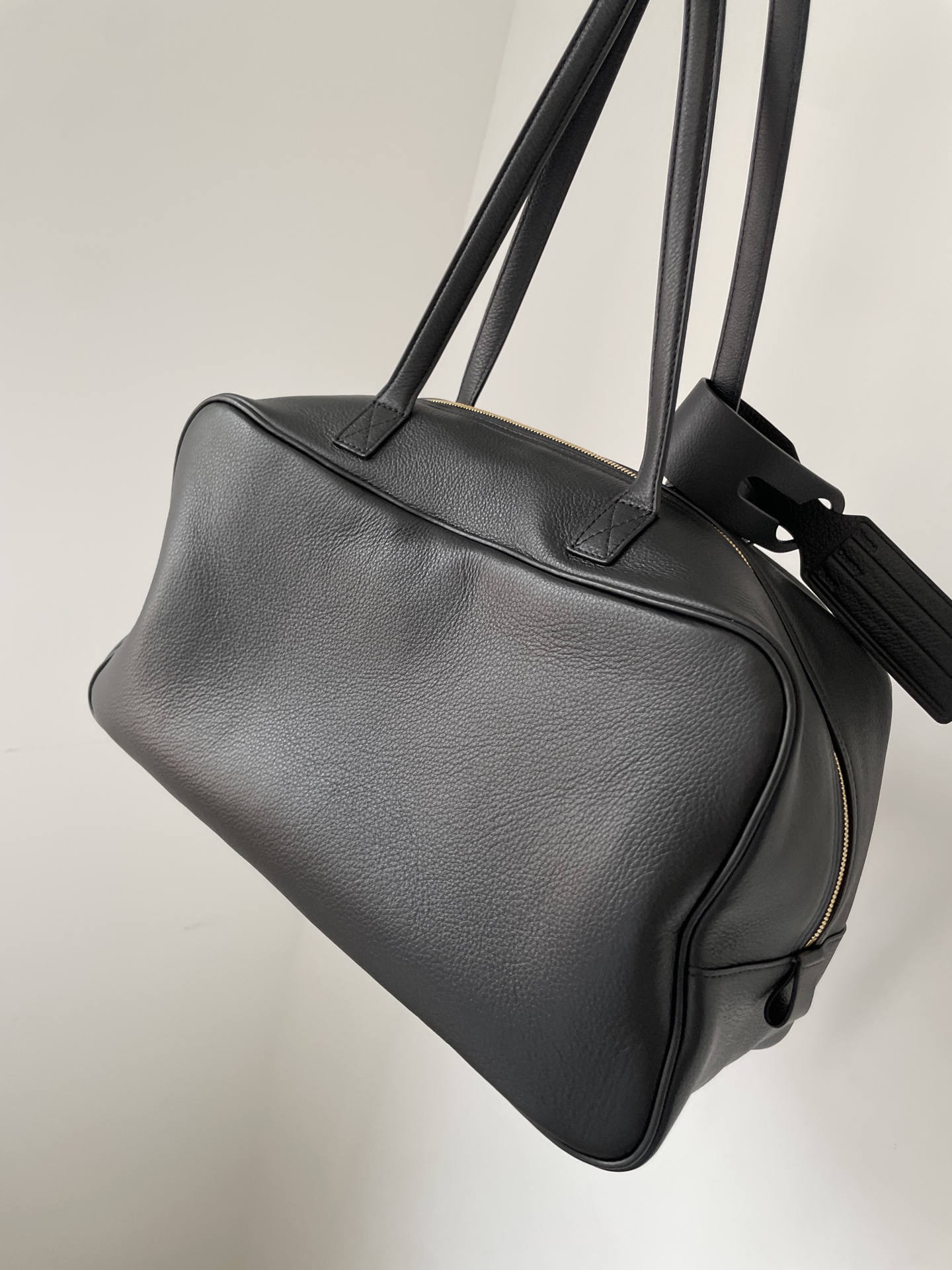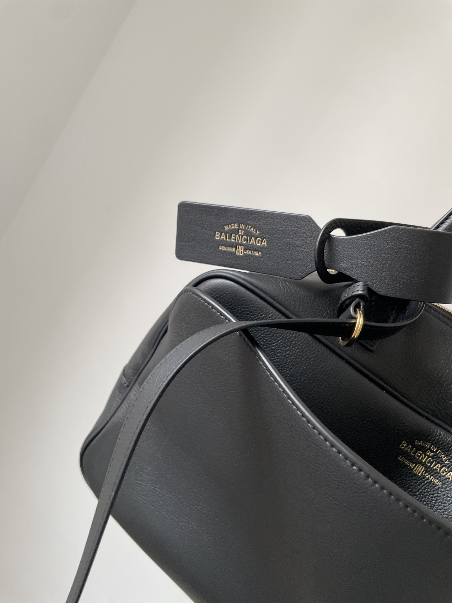 The Balenciaga Carrie Medium Bowling Bag is made from smooth black calfskin, featuring gold-foil logo embossing, vintage hardware, and zip closure. Size: 35.8×16.5×18.8cm.