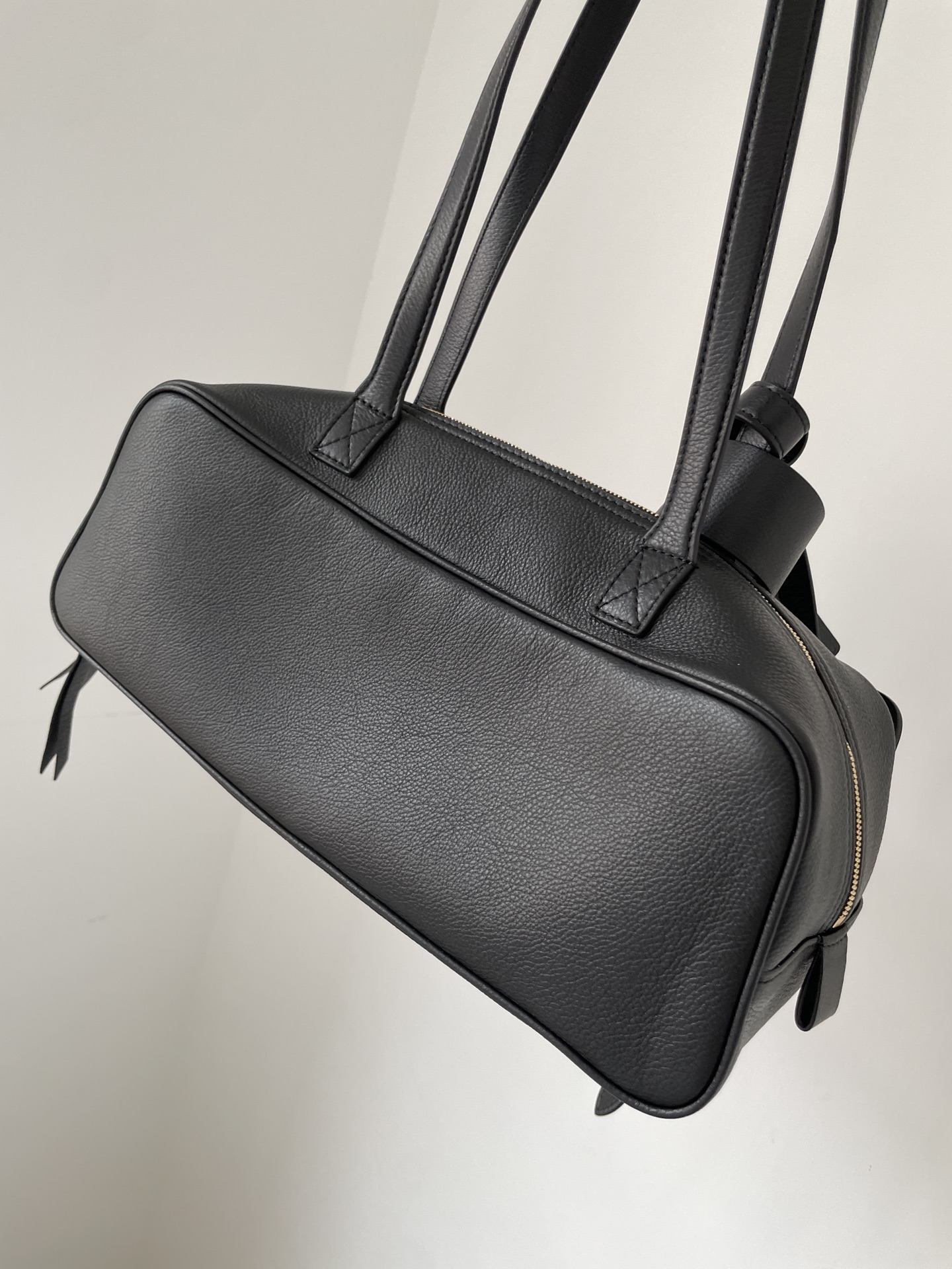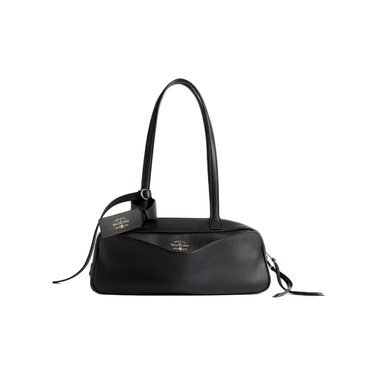 The Balenciaga Carrie Small Bowling Bag redefines everyday luxury with black calfskin leather, gold-foil logo, and Nappa lining. Size: 31×11.9×11.9cm.