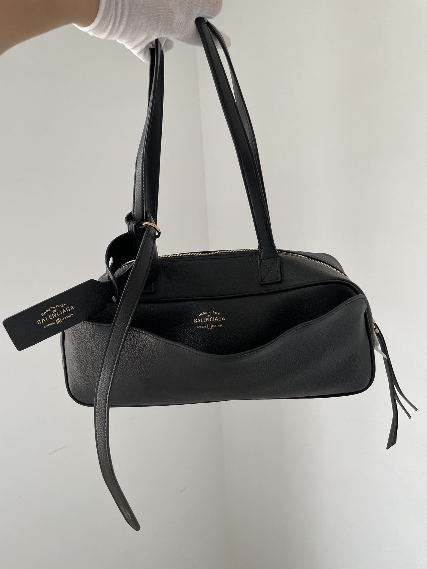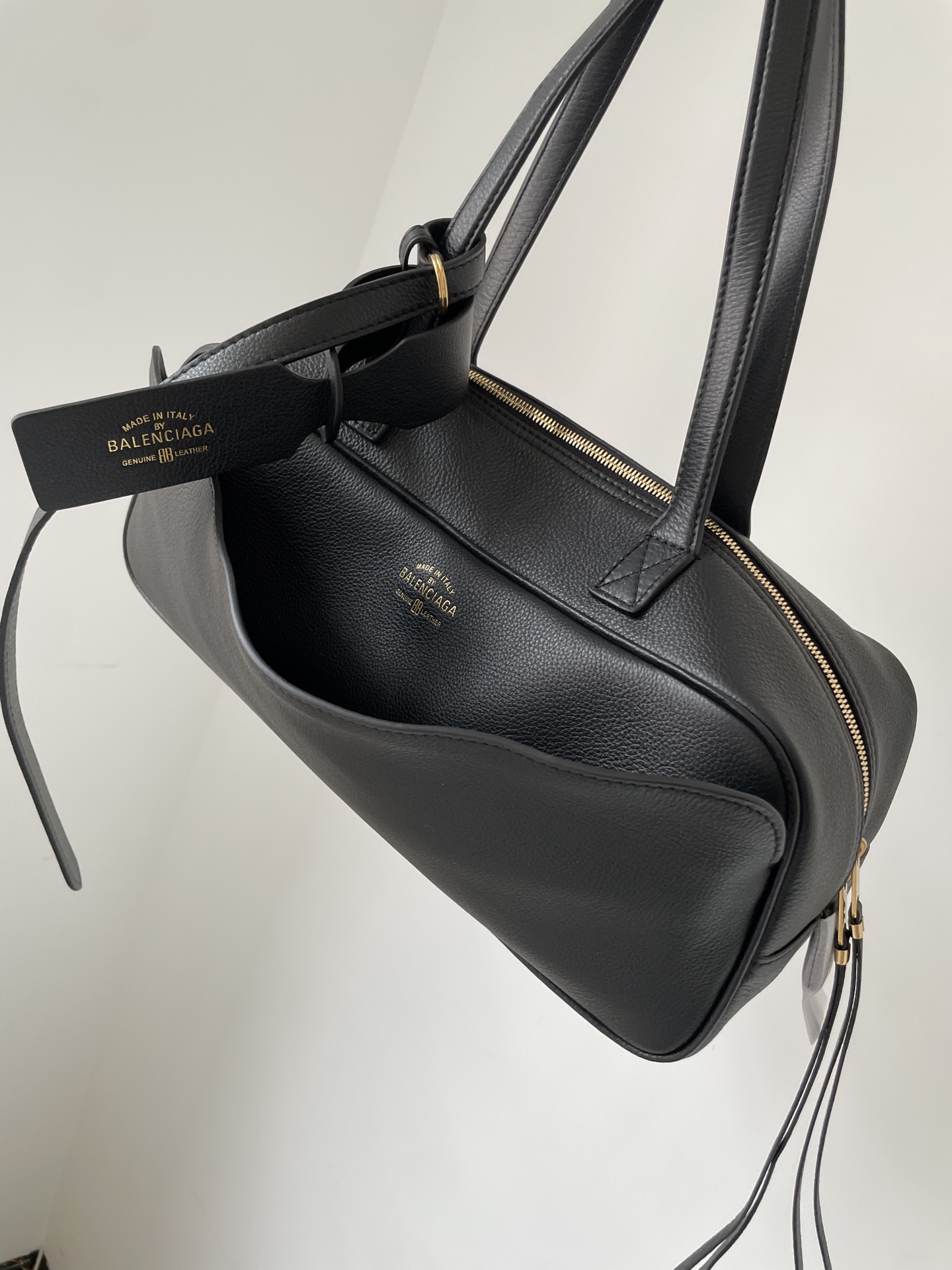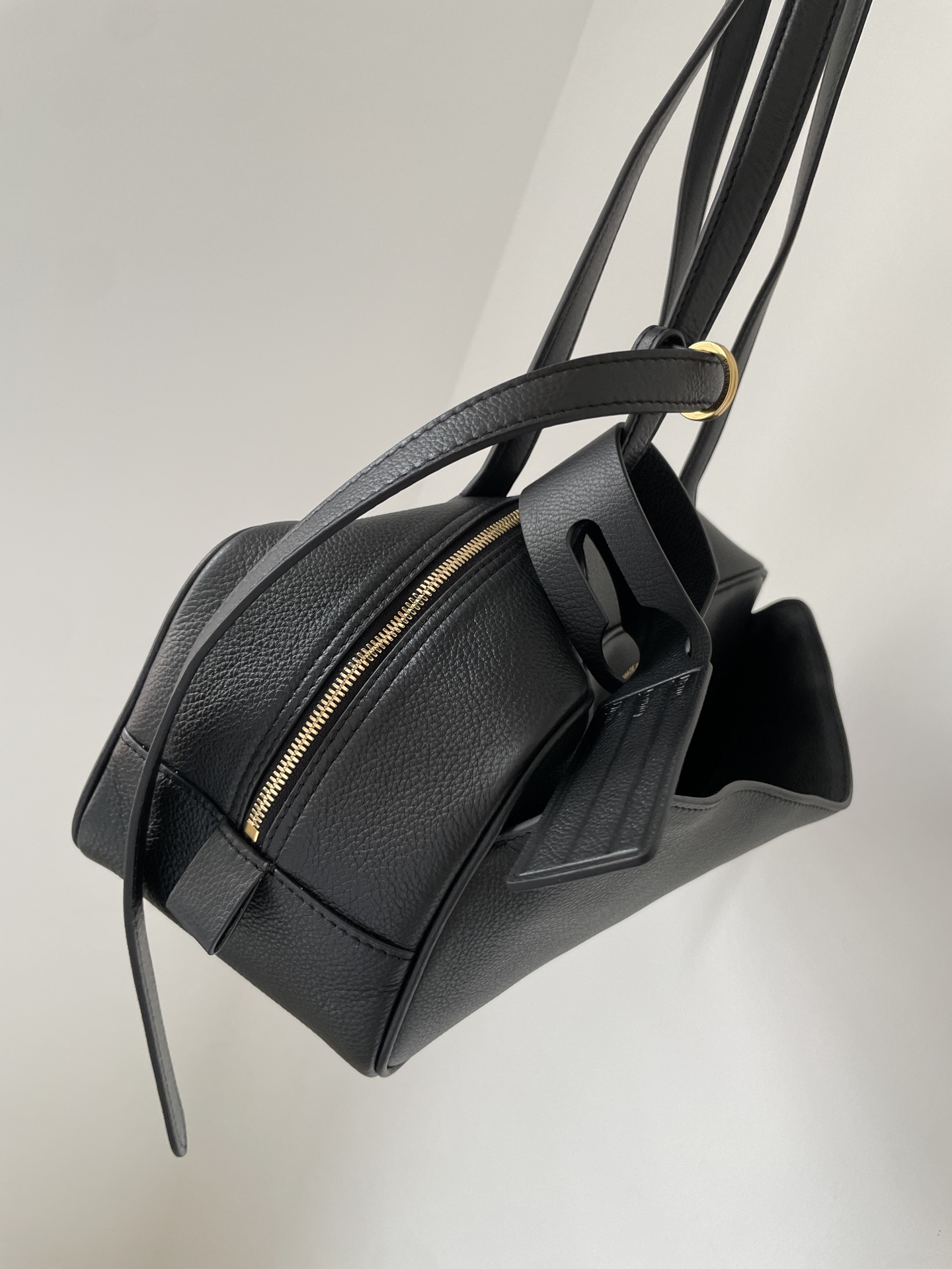 Small Balenciaga Carrie bowling bag in black calfskin with gold-foil logo embossing, featuring dual handles, detachable tag, and vintage gold-tone hardware.