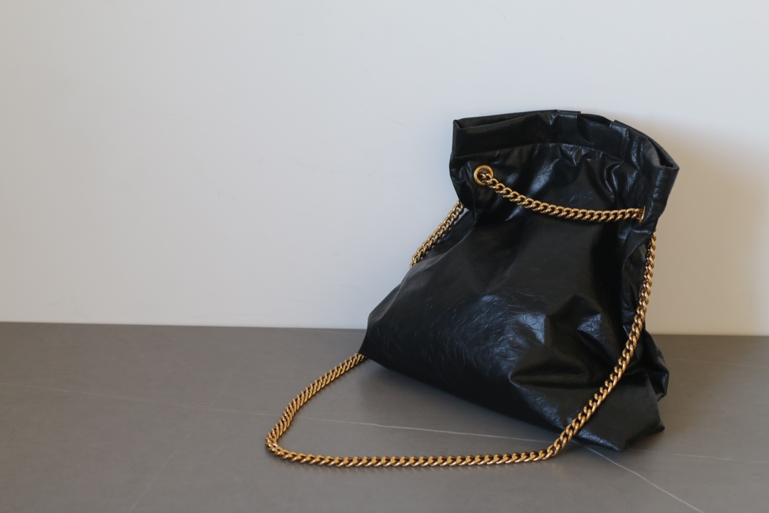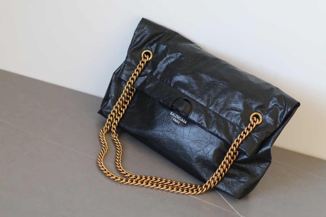 The Balenciaga Crush Medium Tote Bag in matte calfskin features chain straps, magnetic closure, and soft interior. Dimensions: 39×14×46cm.