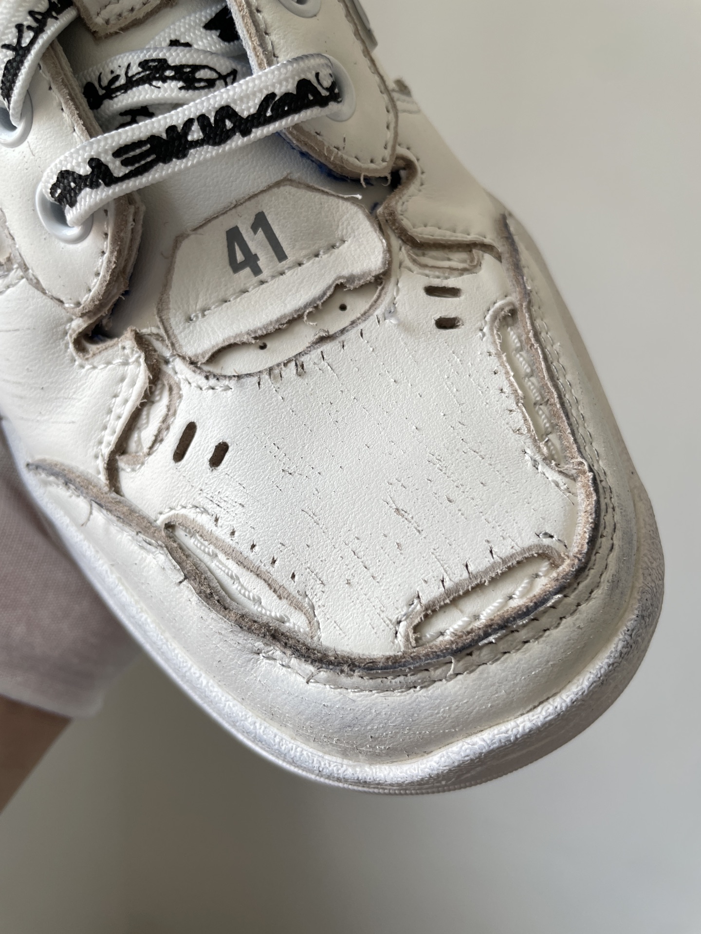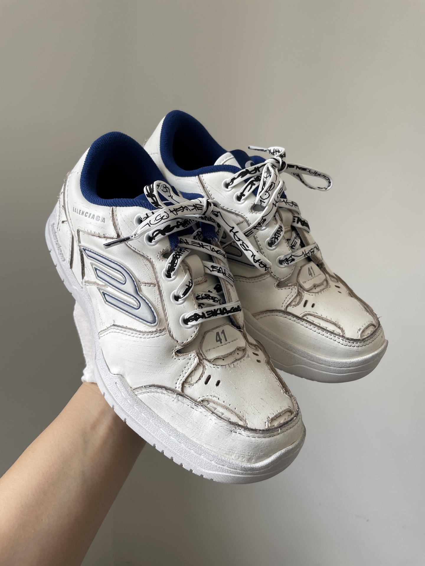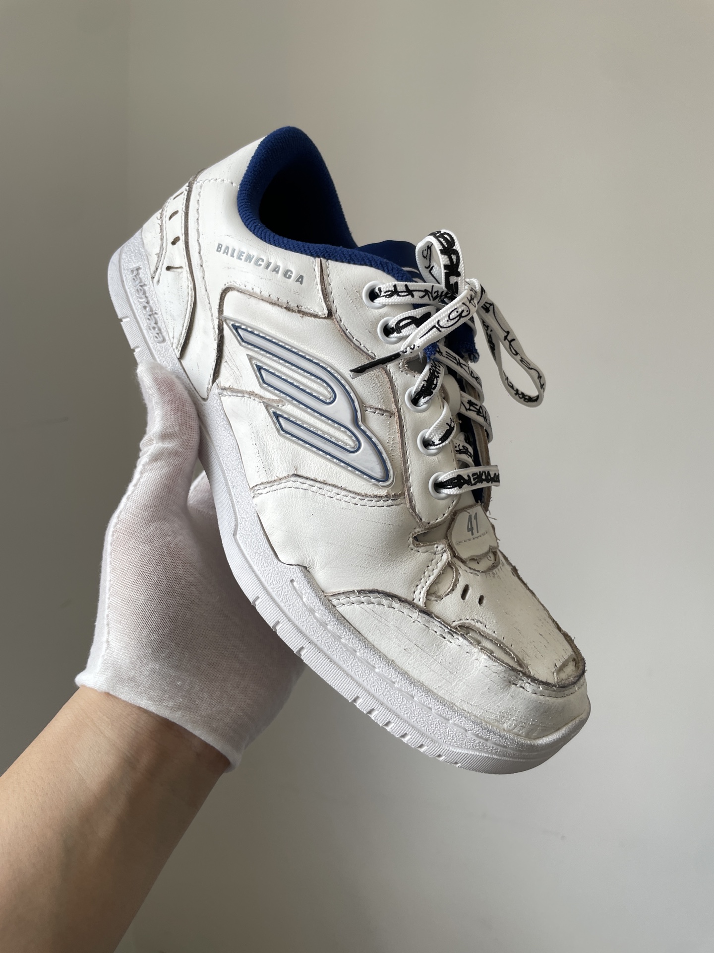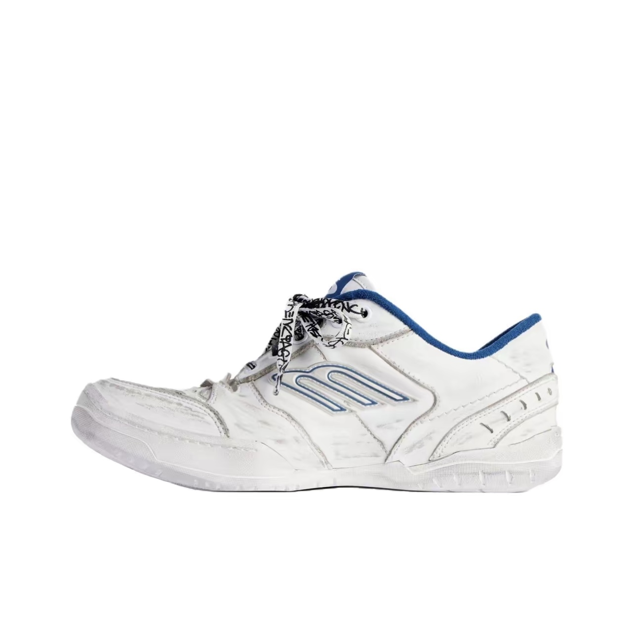 Sneakers with a mixed-material construction. Design features: Round-Toe, Lace-Up, Low-Top, Distressed, Embossed Logo, Casual Sneakers. Primary color: White. Intended use: everyday wear and general lifestyle activities. Fit category: Men.