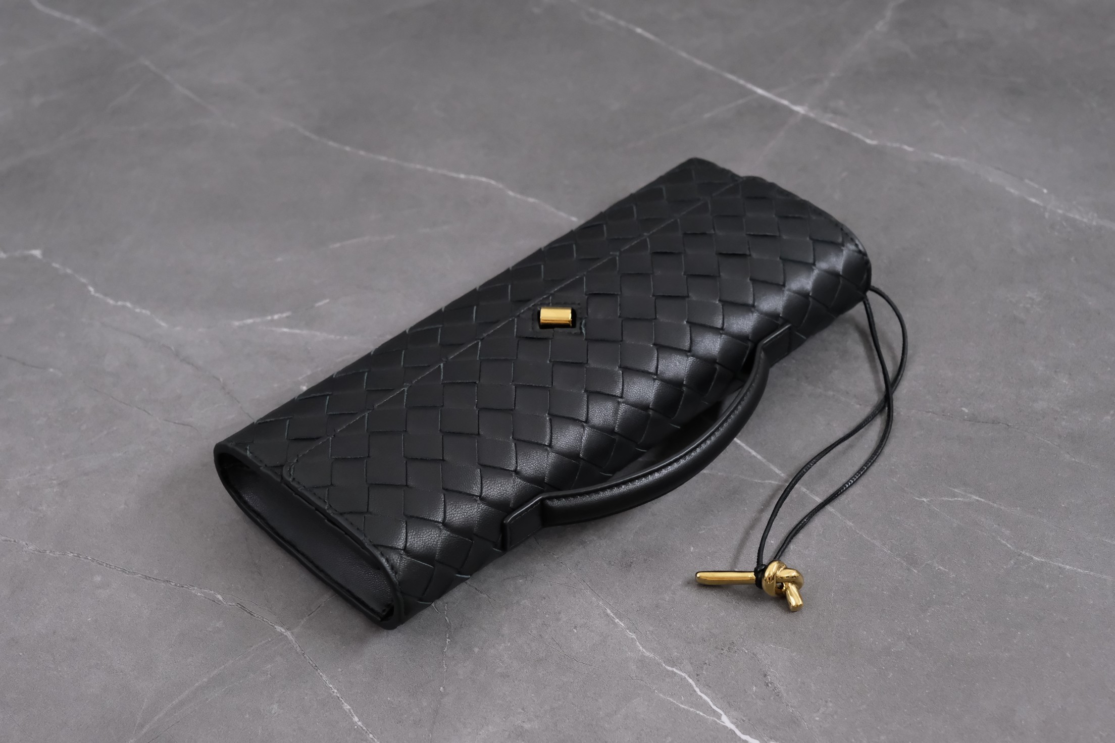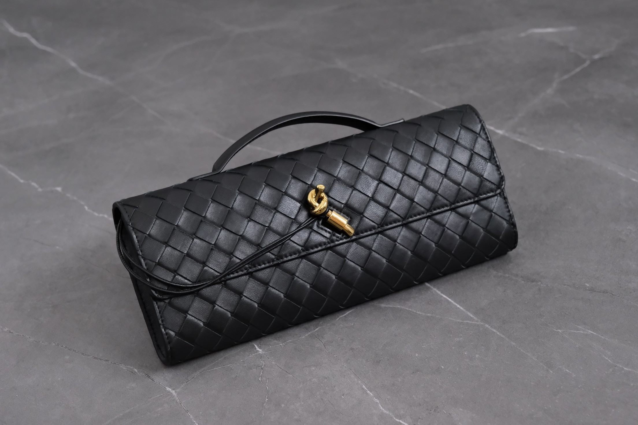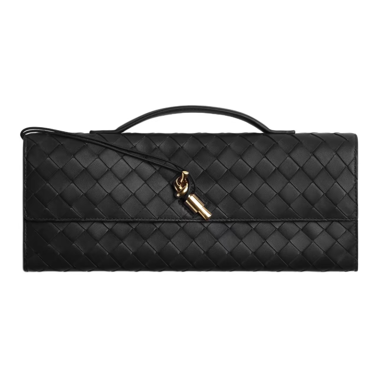 Bottega Veneta clutch in black lambskin with Intrecciato weave and metal knot clasp — timeless elegance.
