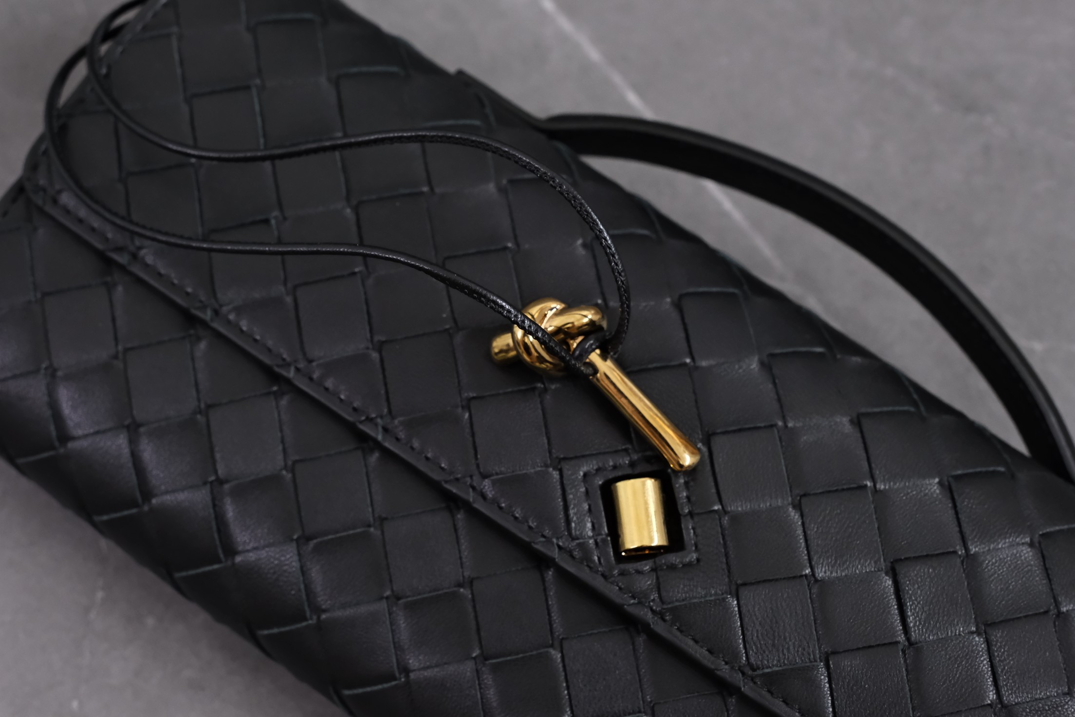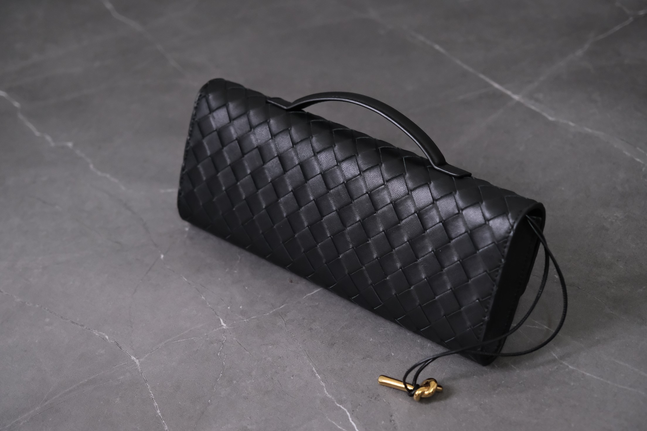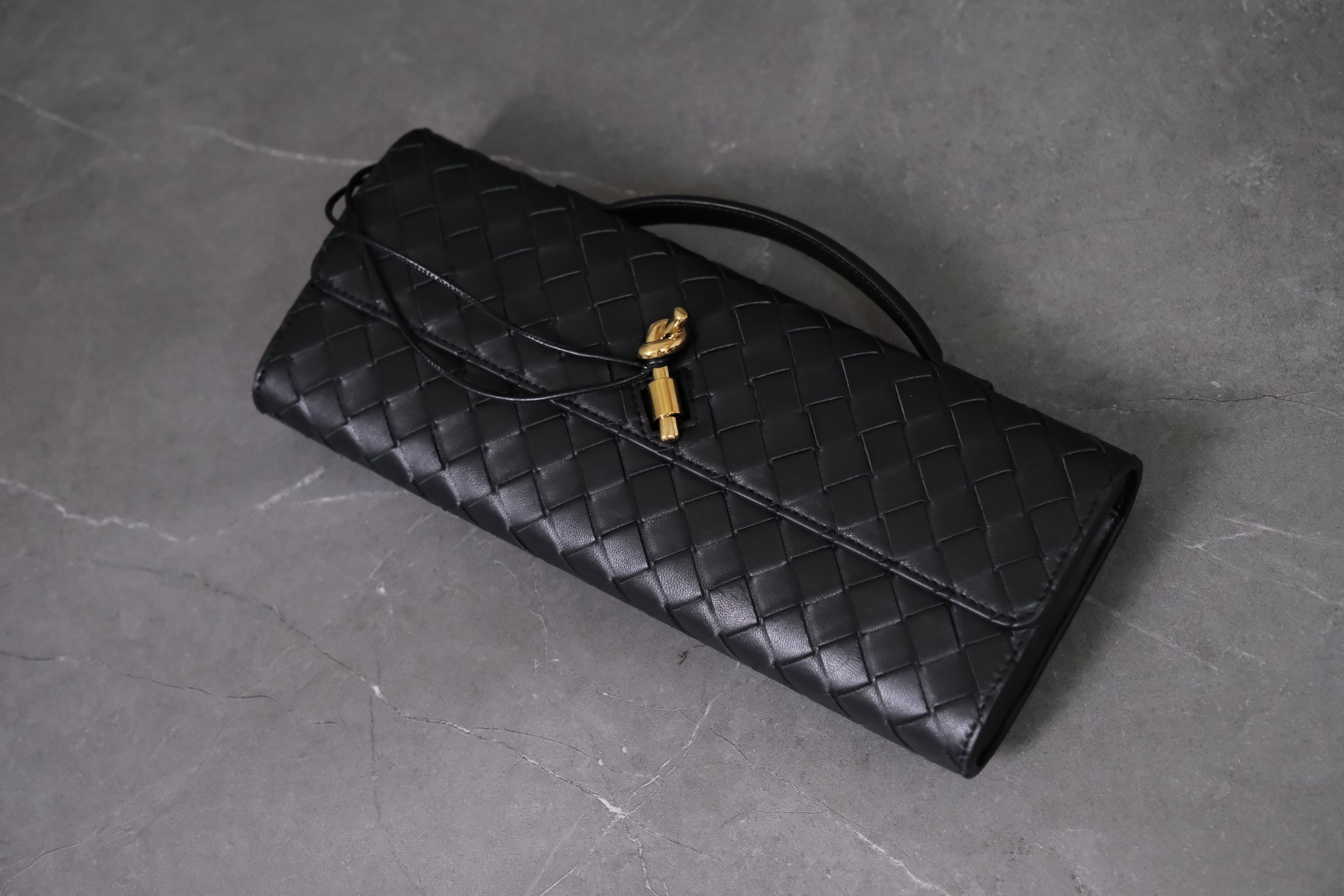 Bottega Veneta clutch in black lambskin with Intrecciato weave and metal knot clasp — timeless elegance.