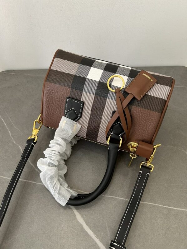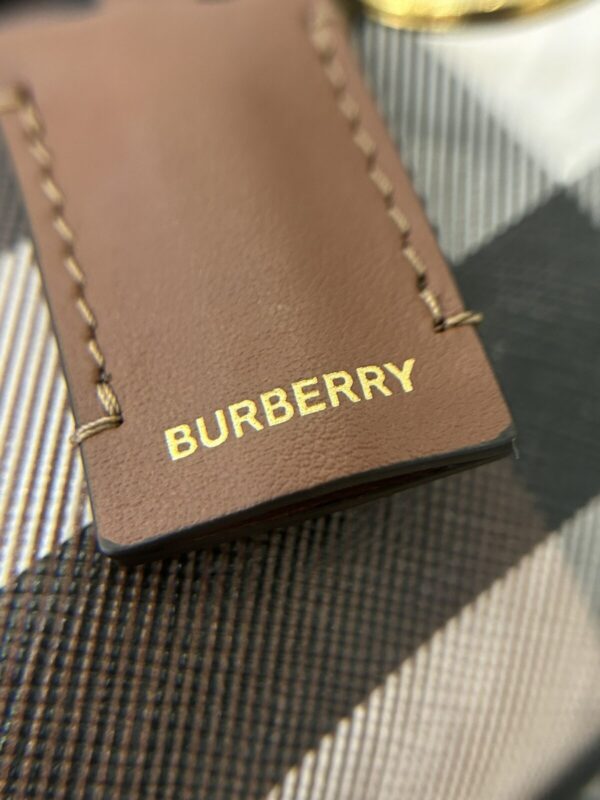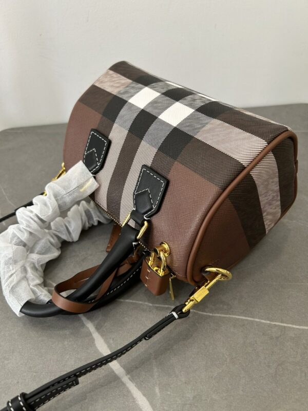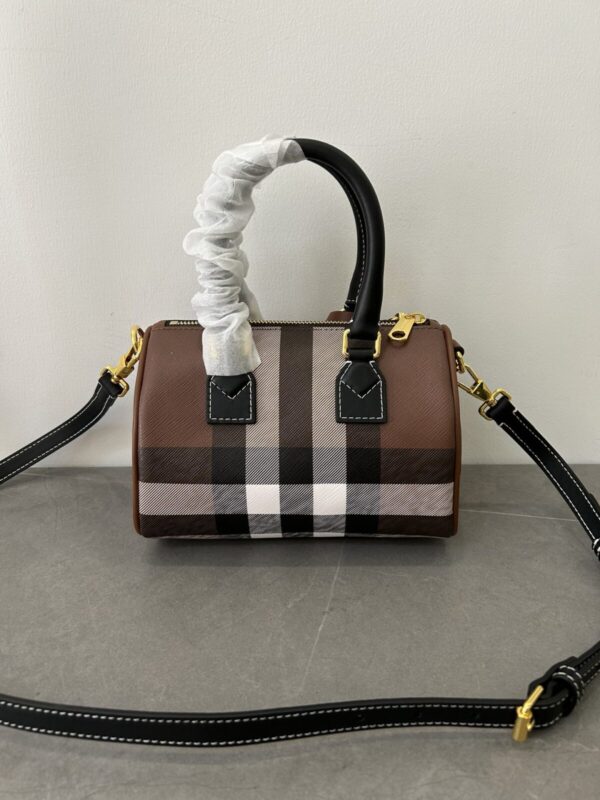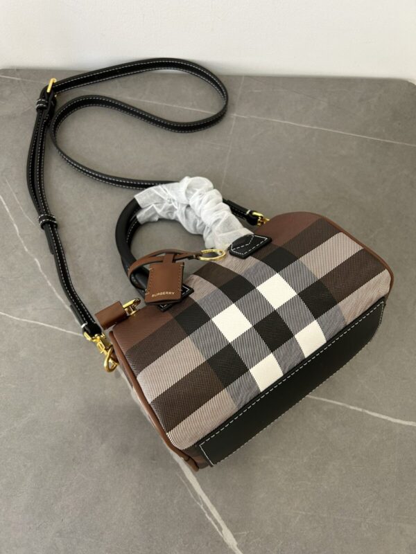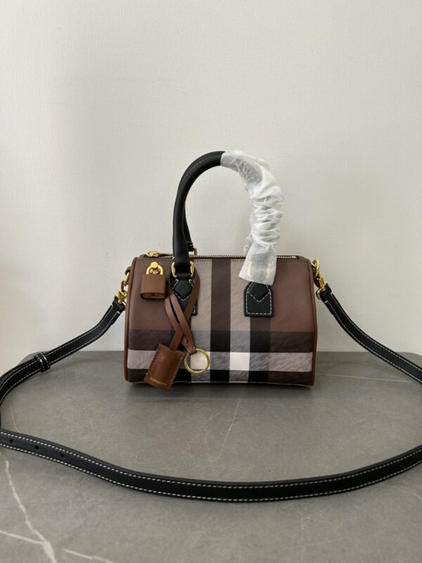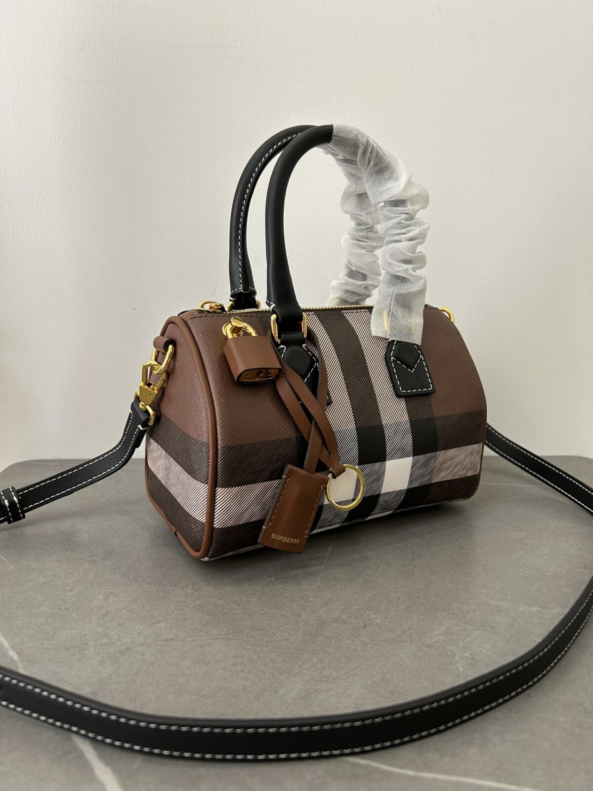 The Burberry Check Print Mini Bowling Bag is made from coated polyurethane in brown check with a zip closure, top handles, and detachable strap. Dimensions: 18.5×11×12cm.