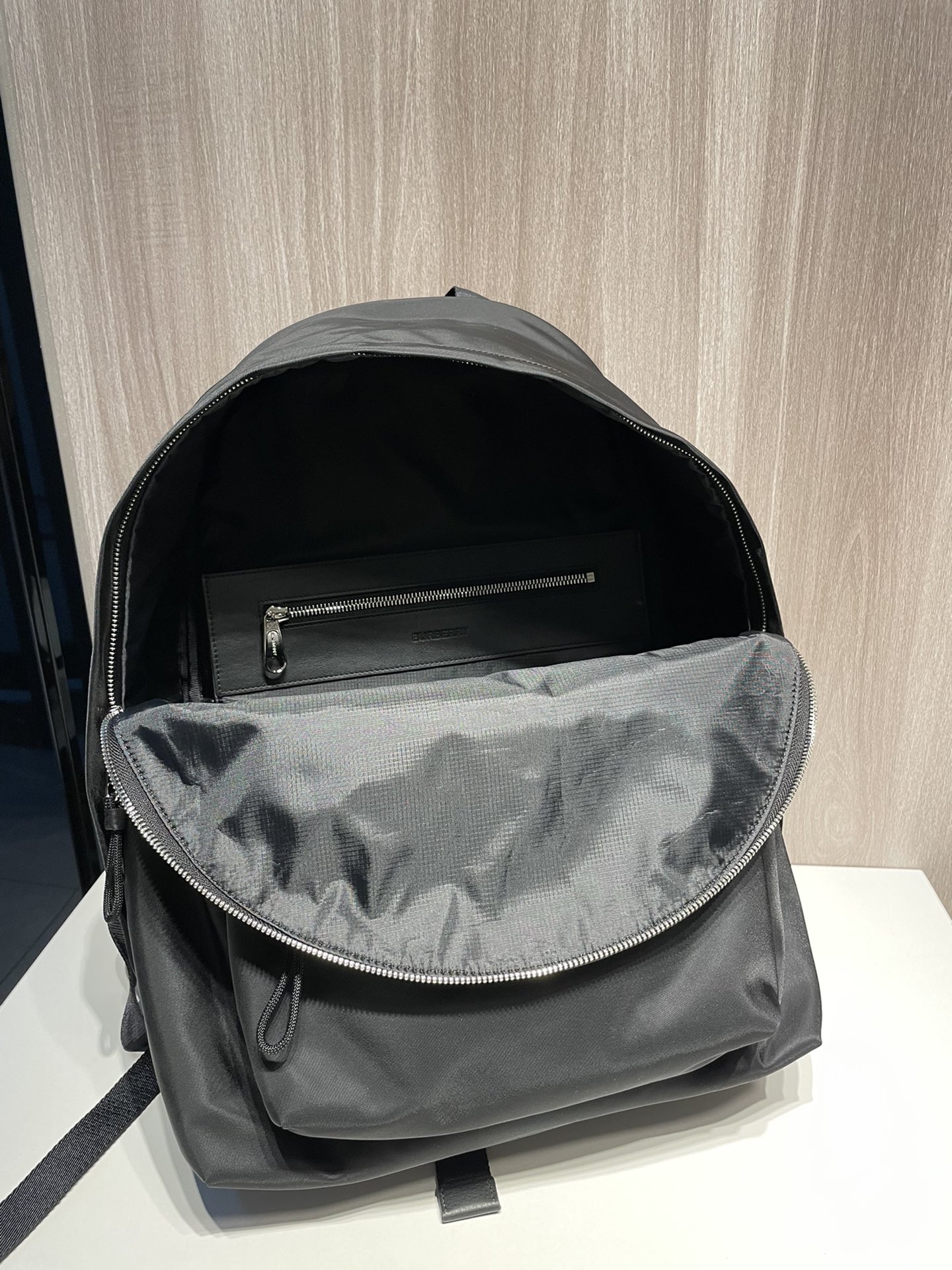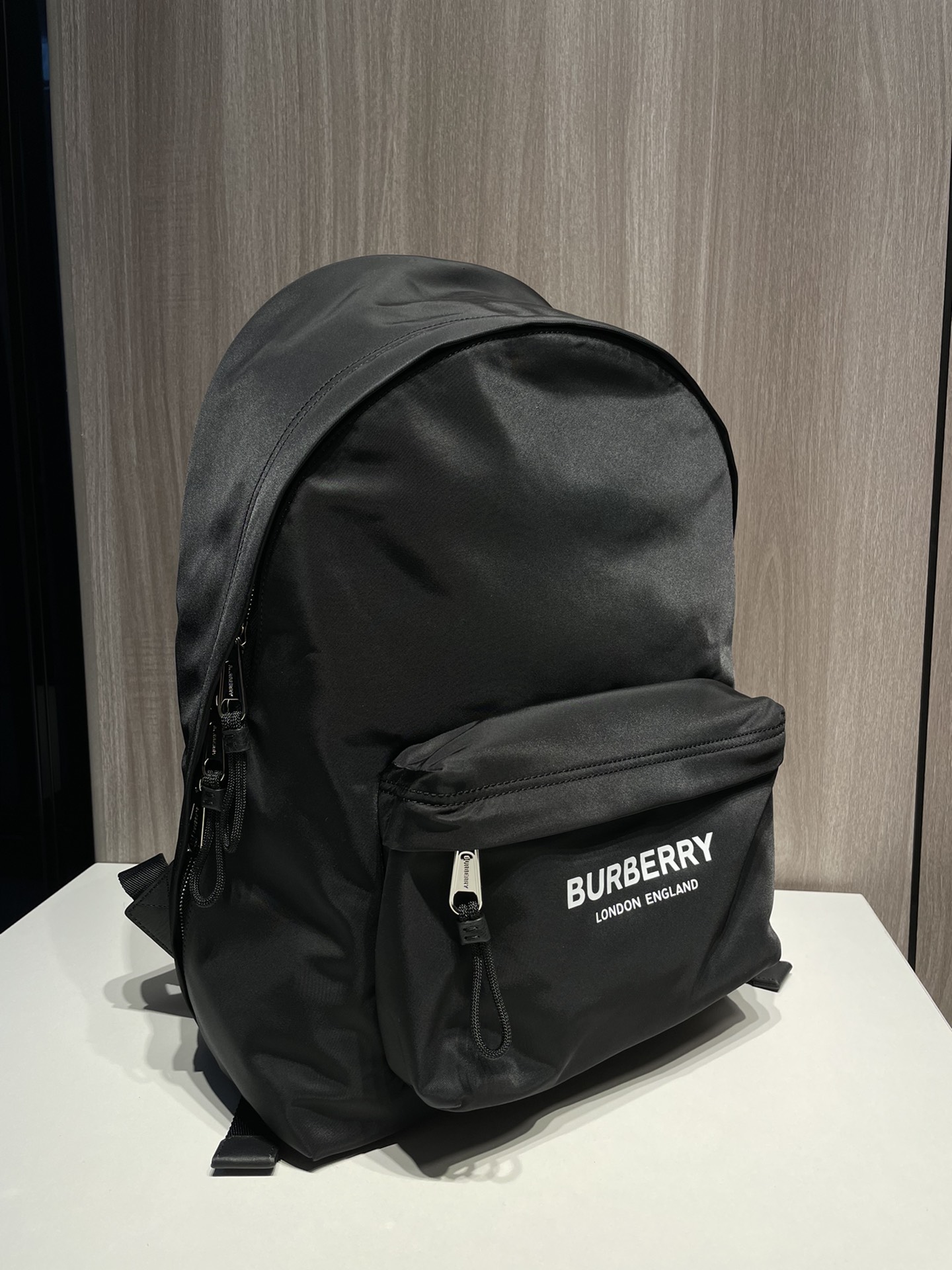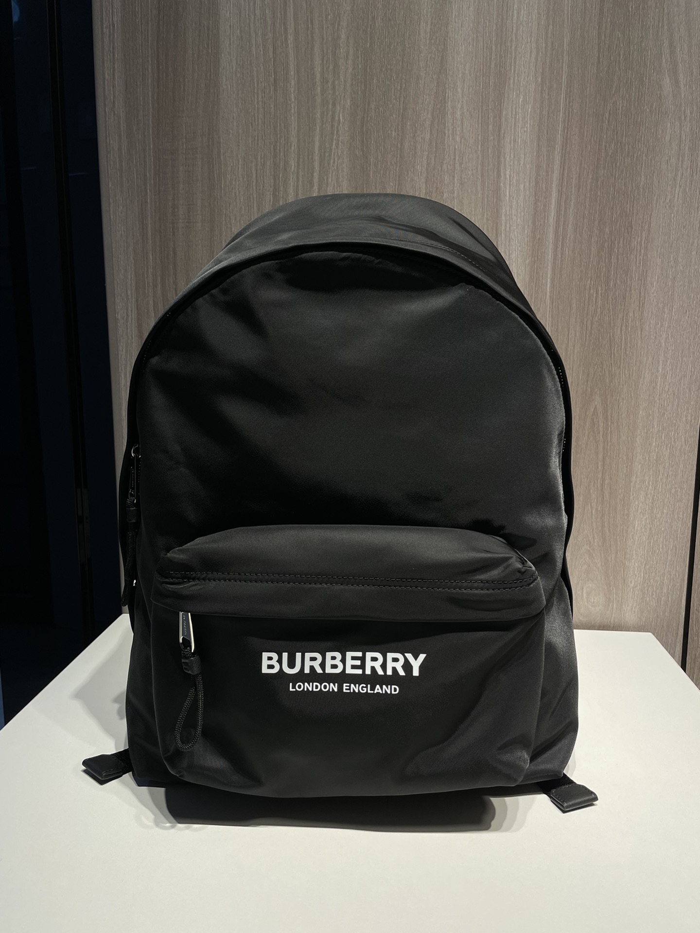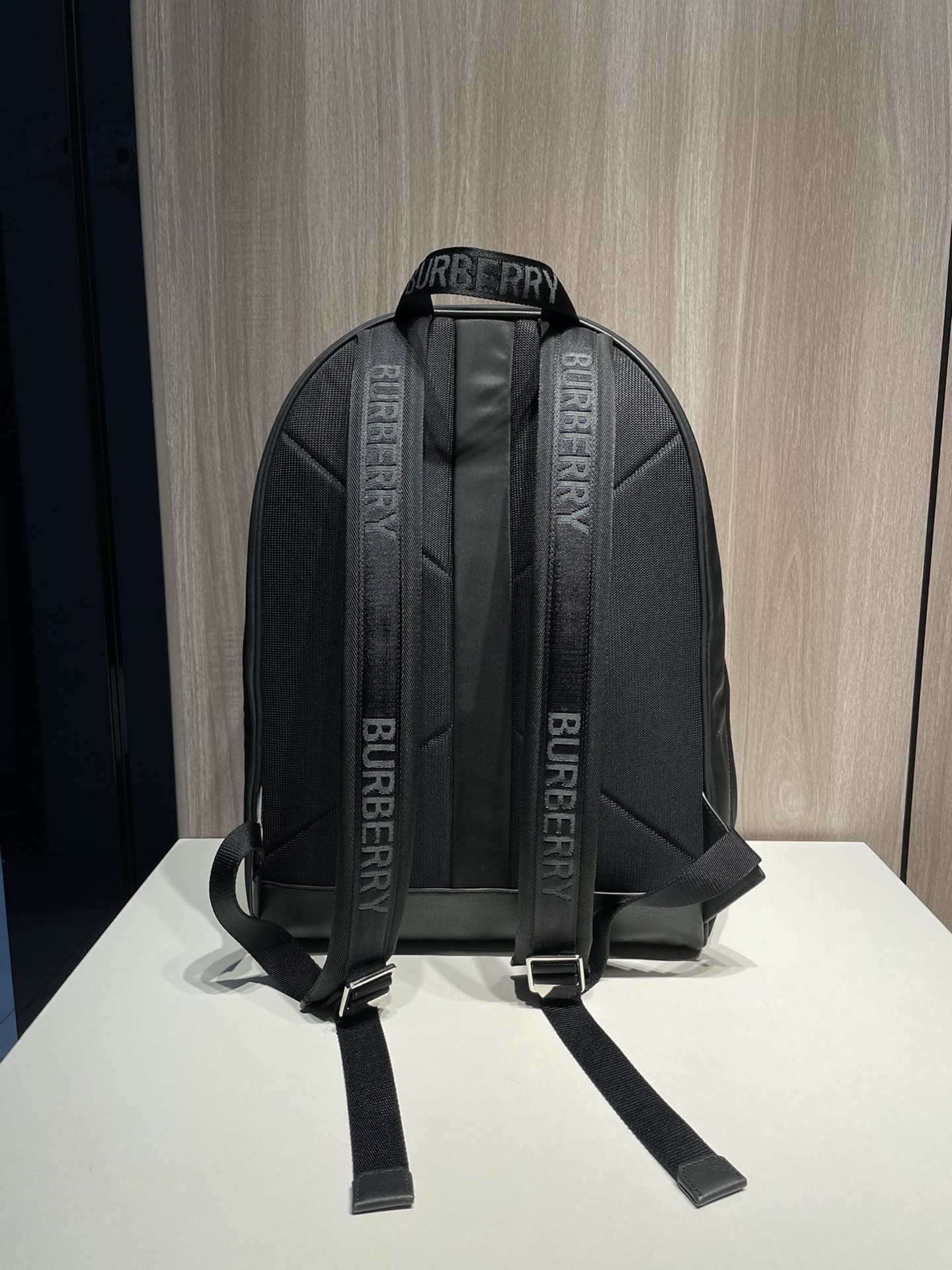 Large Burberry backpack in black nylon with logo print, leather trim, and adjustable straps.