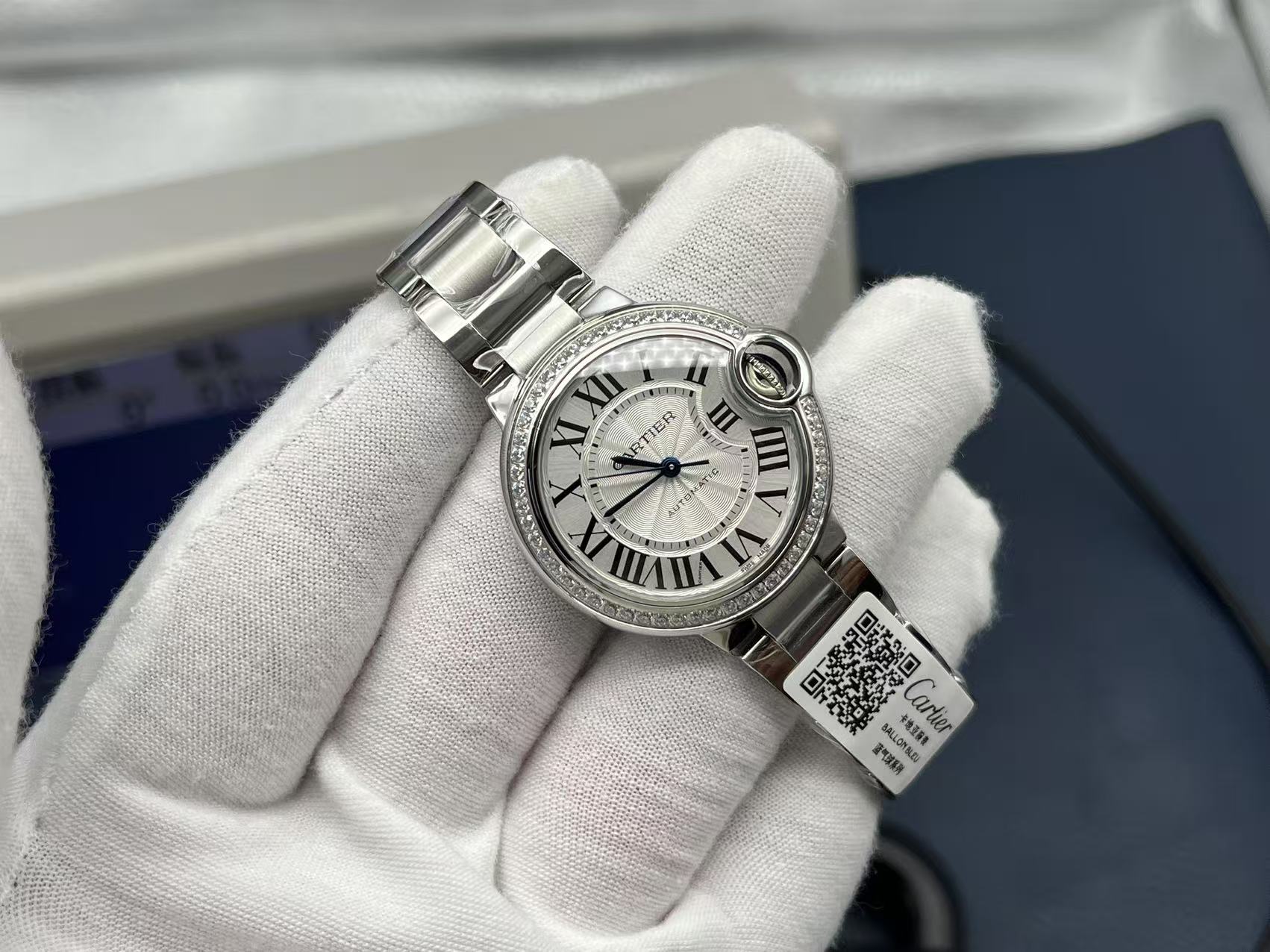 33mm Cartier Ballon Bleu unisex automatic watch with diamond-set bezel, white dial, sapphire crystal, and quick-release stainless-steel bracelet.