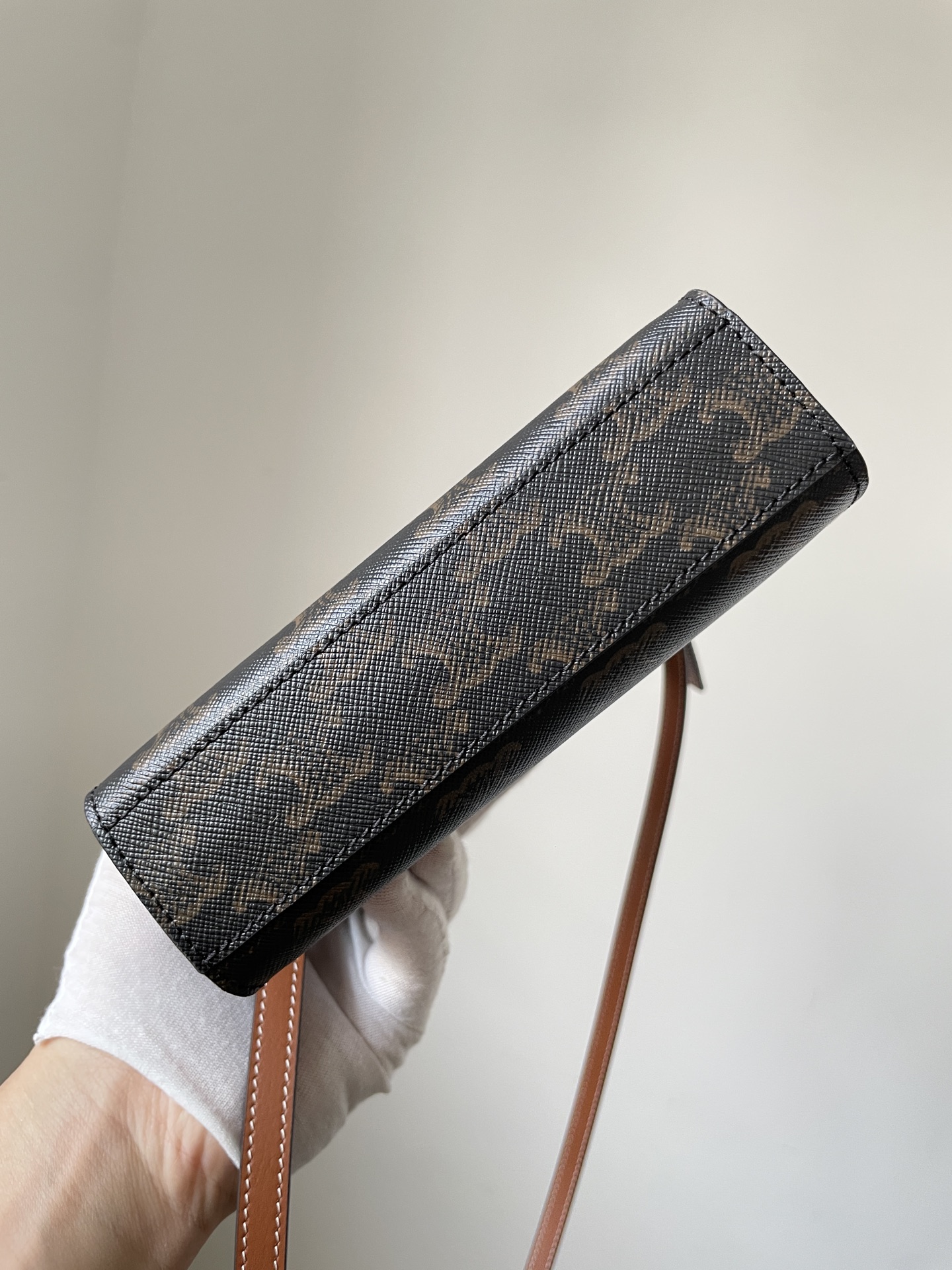 Mini Cabas tote in Triomphe canvas with leather handles and detachable/adjustable strap—fits larger smartphones.