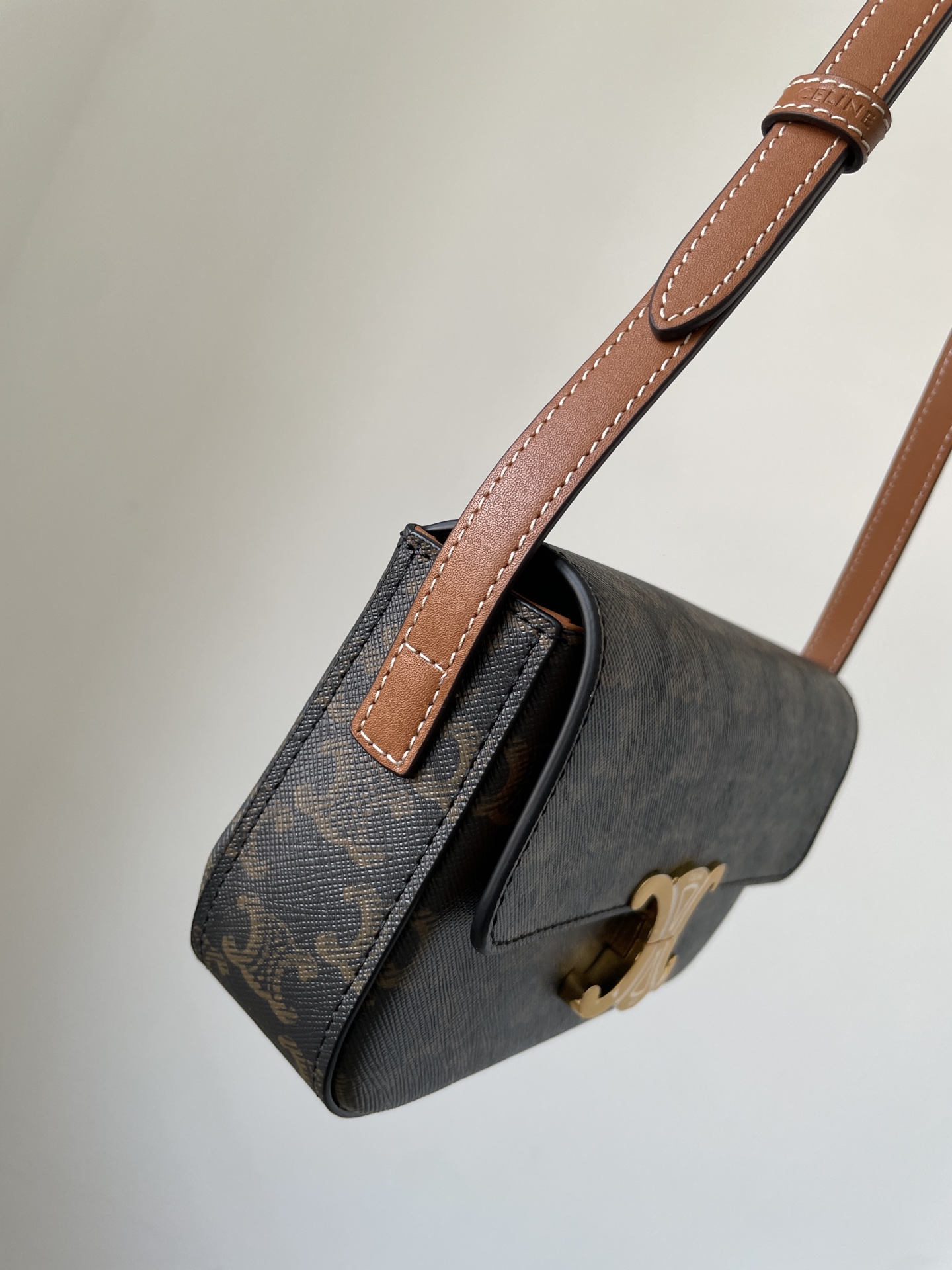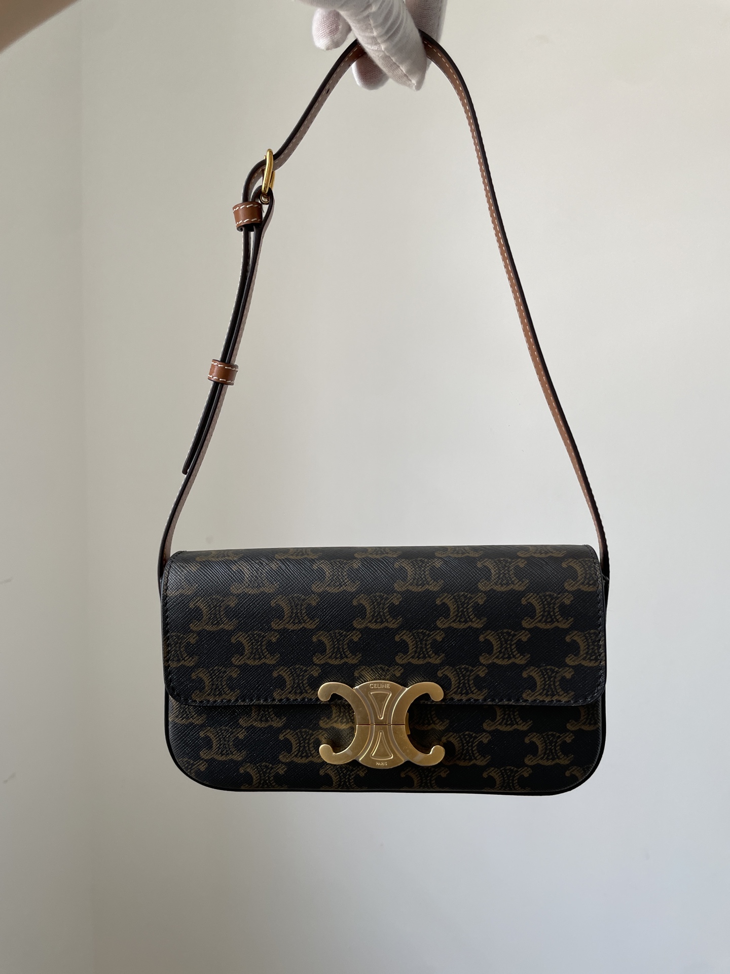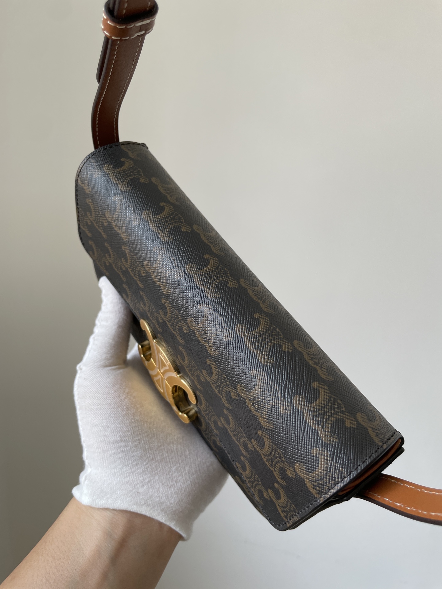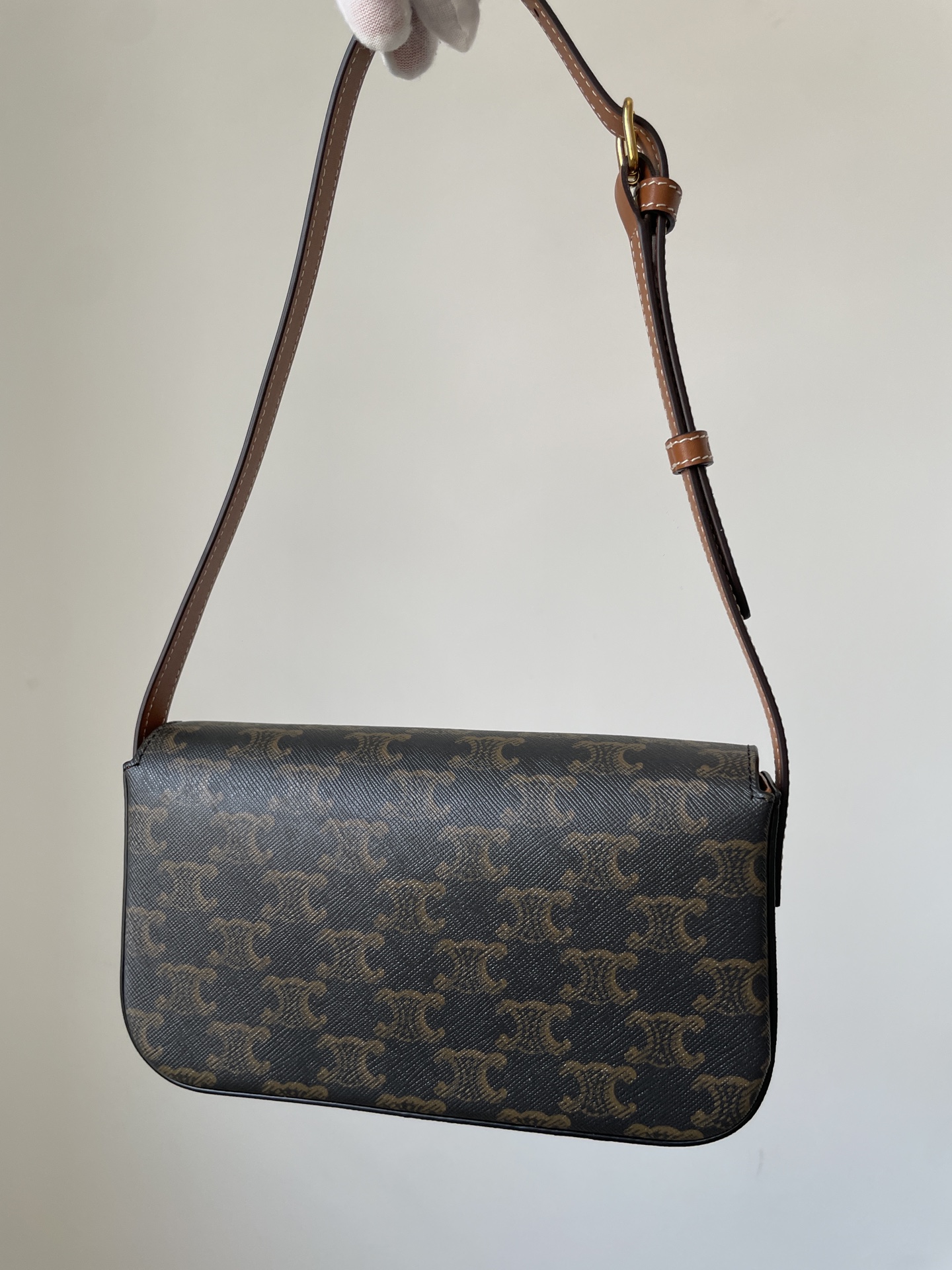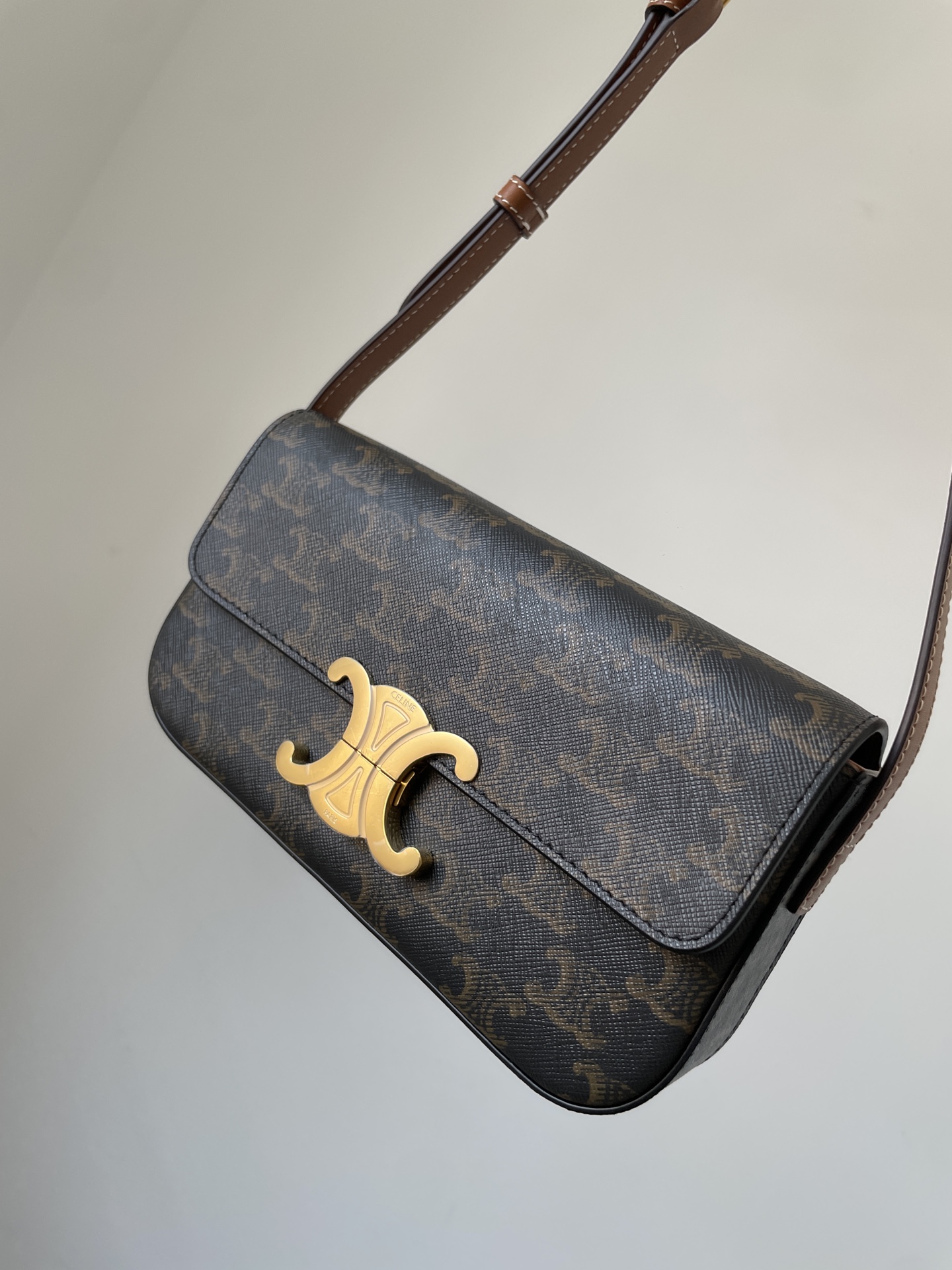 The CELINE Claude Shoulder Bag celebrates house heritage with all-over Triomphe canvas and the signature gold-tone clasp. Its compact structure and lambskin lining embody modern refinement.