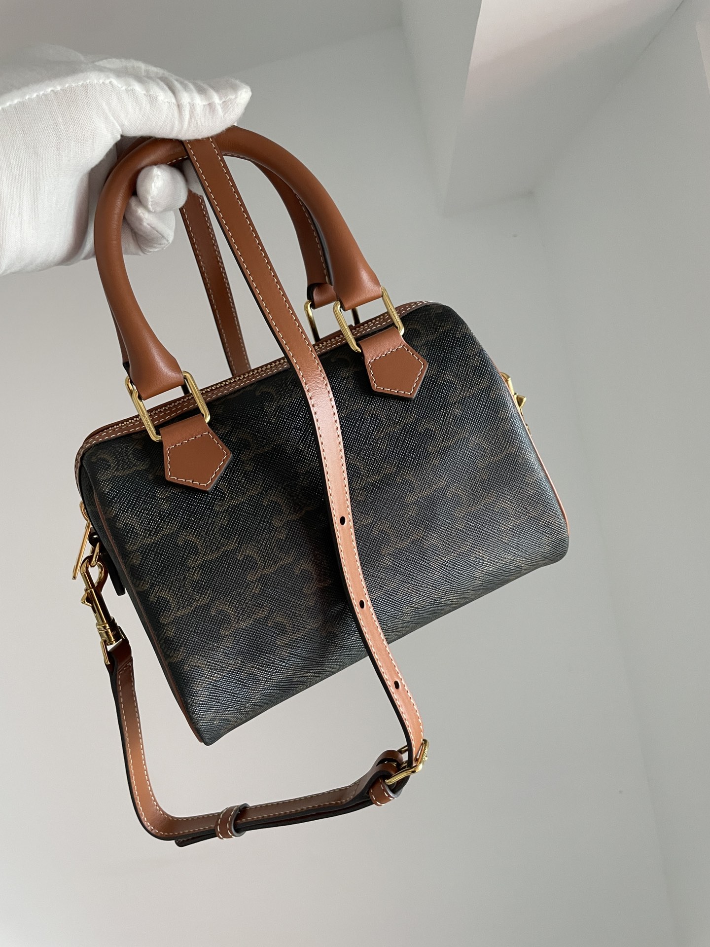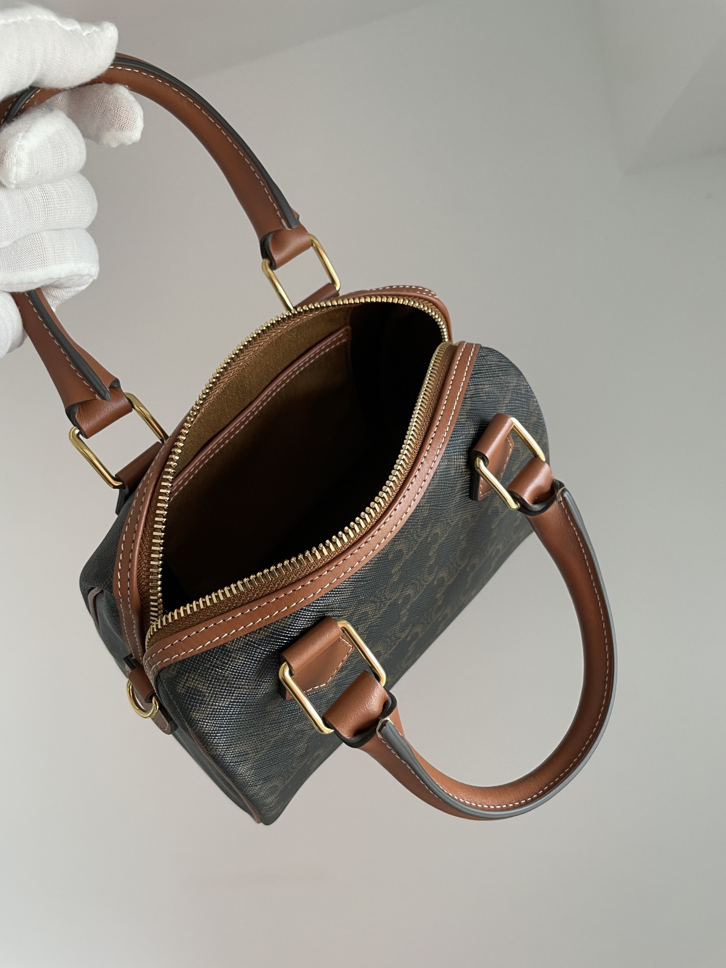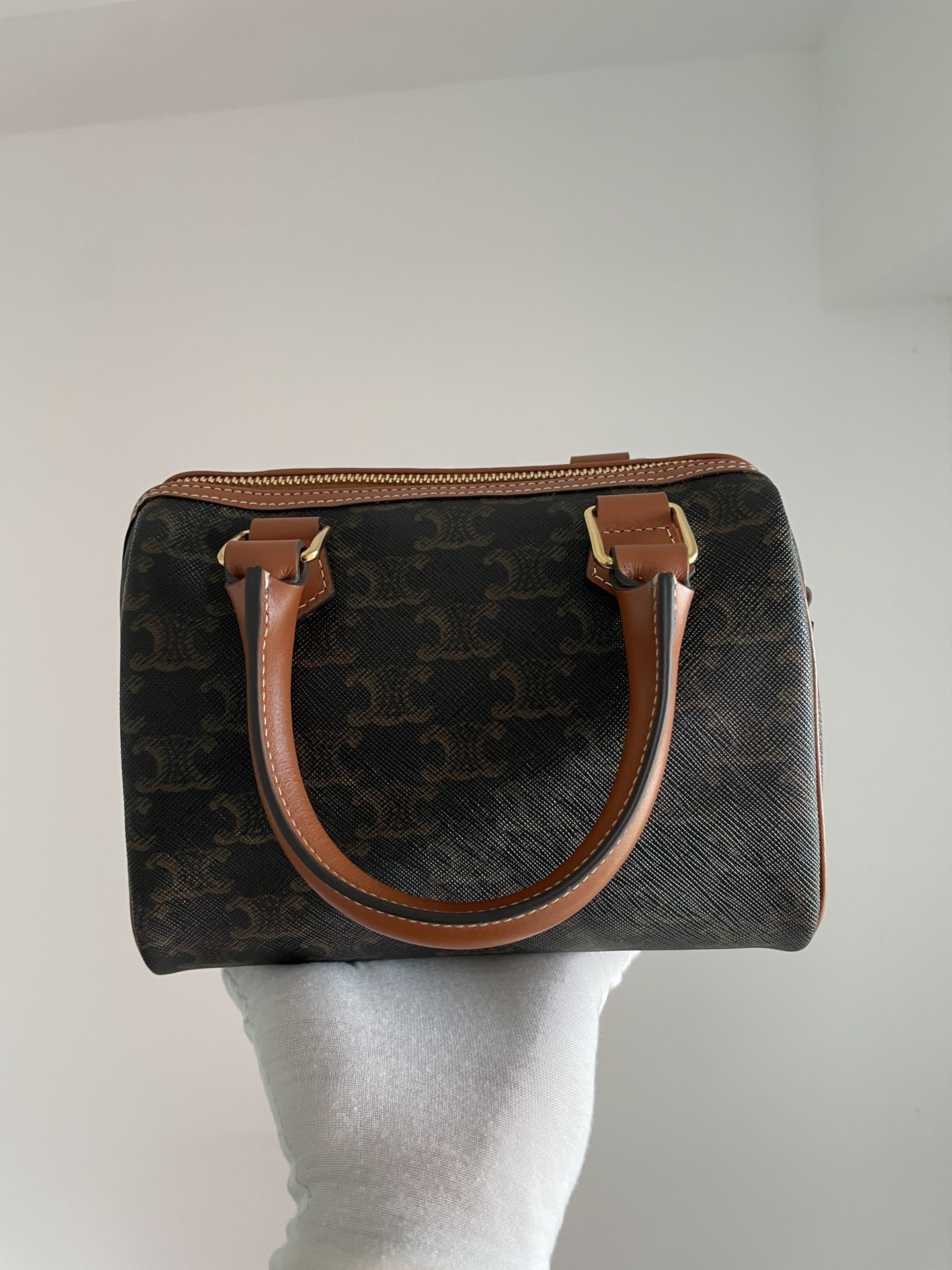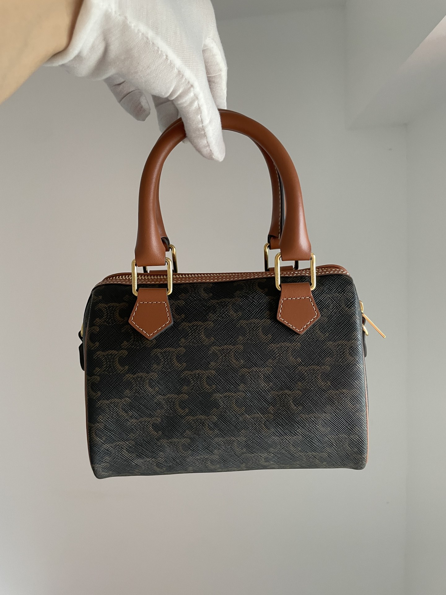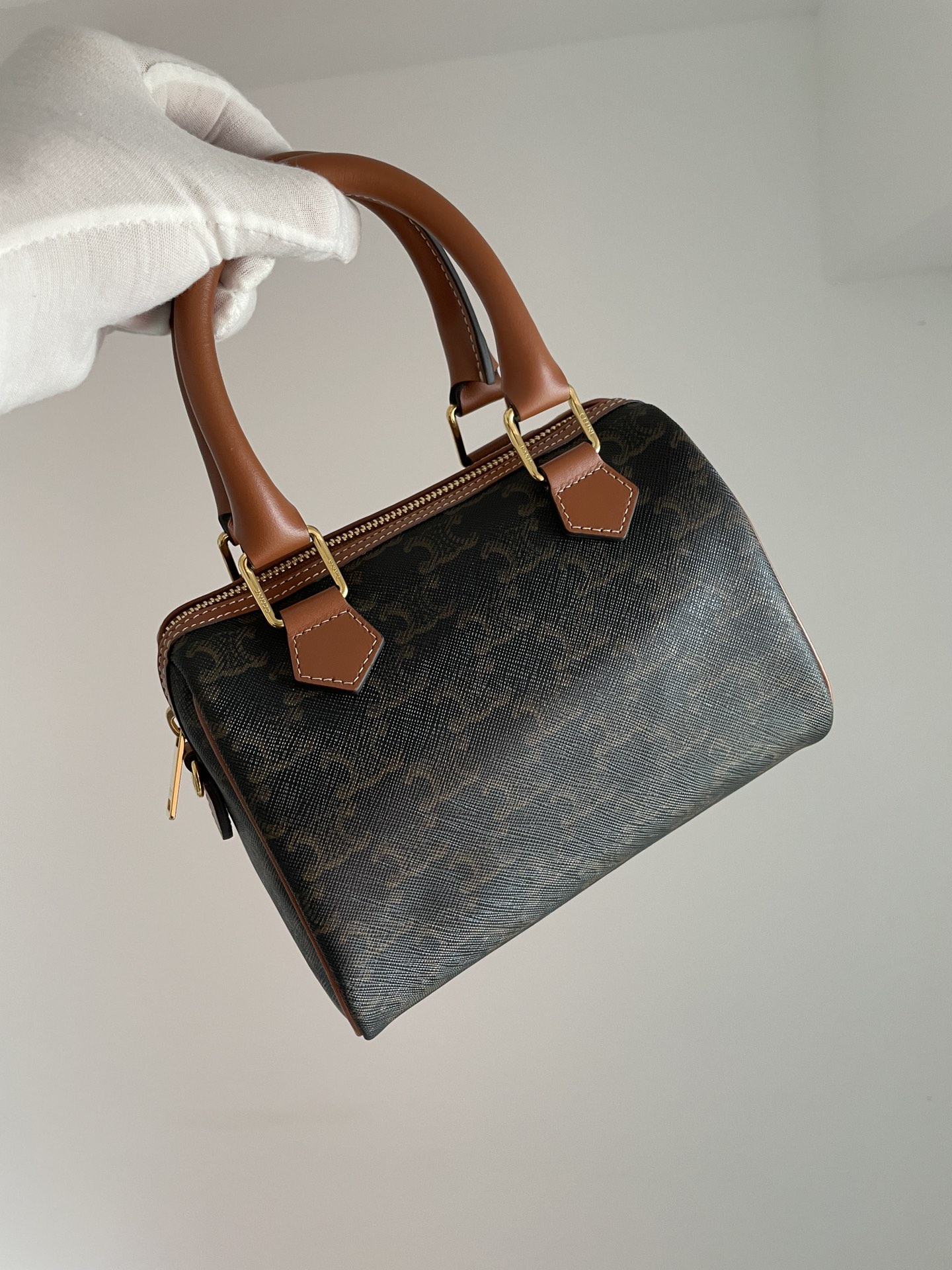 CELINE’s Small Boston Bag revisits an archival silhouette in Triomphe canvas for a refined heritage look. The zipped main compartment and fabric-lined interior keep essentials secure and organized.