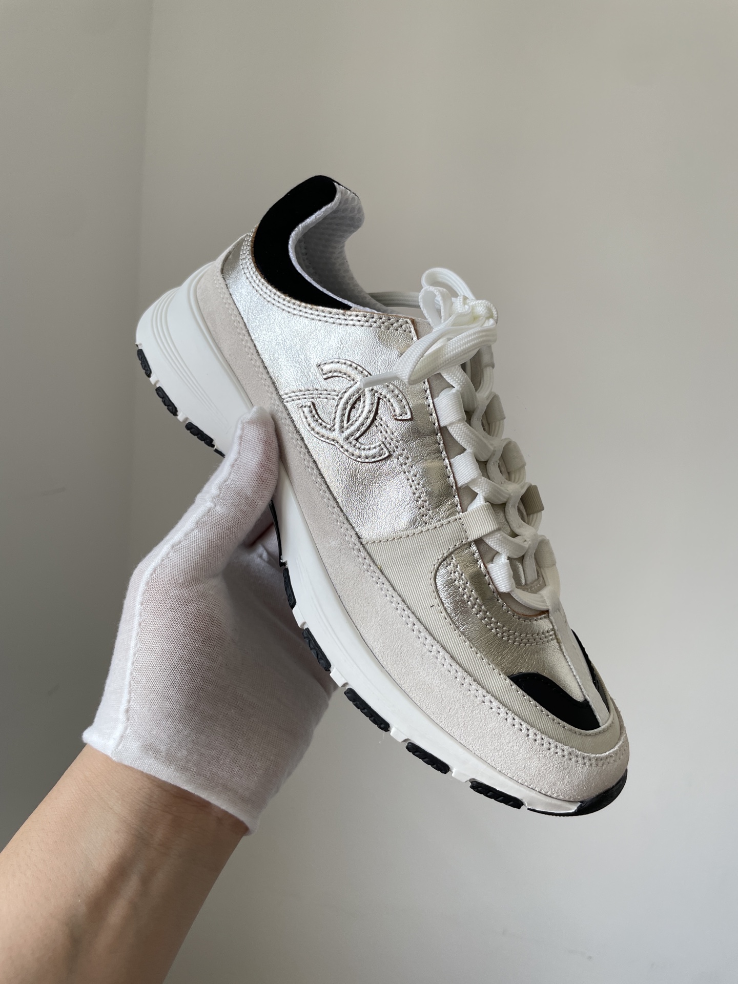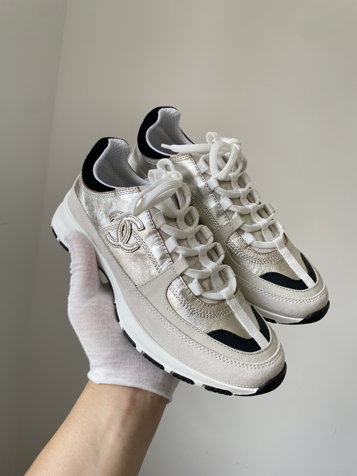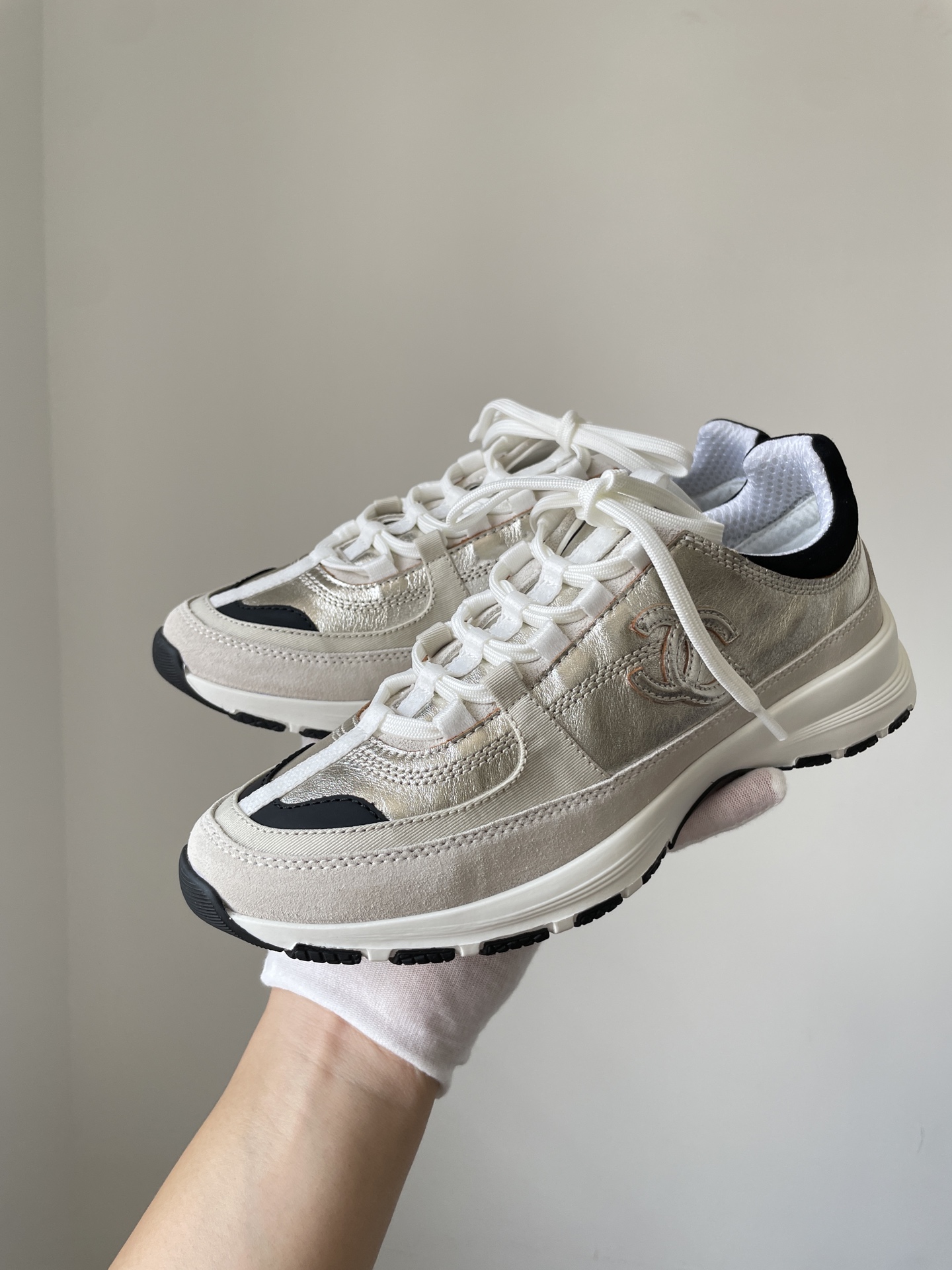 Chanel 25A Calfskin Round Toe Lace-Up Low-Top Sneakers Women Light Gold crafted from premium materials with Chanel’s signature detailing, offering sophistication, comfort, and a luxurious everyday aesthetic.