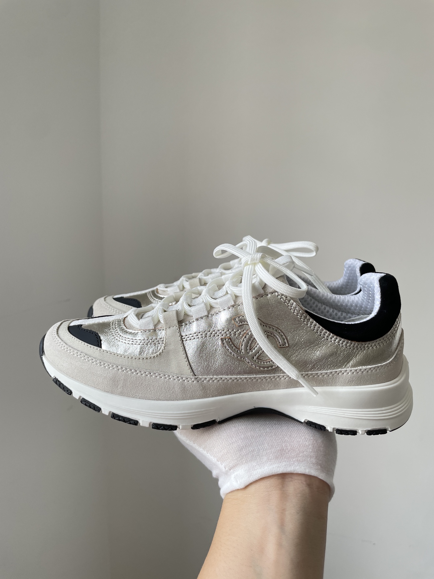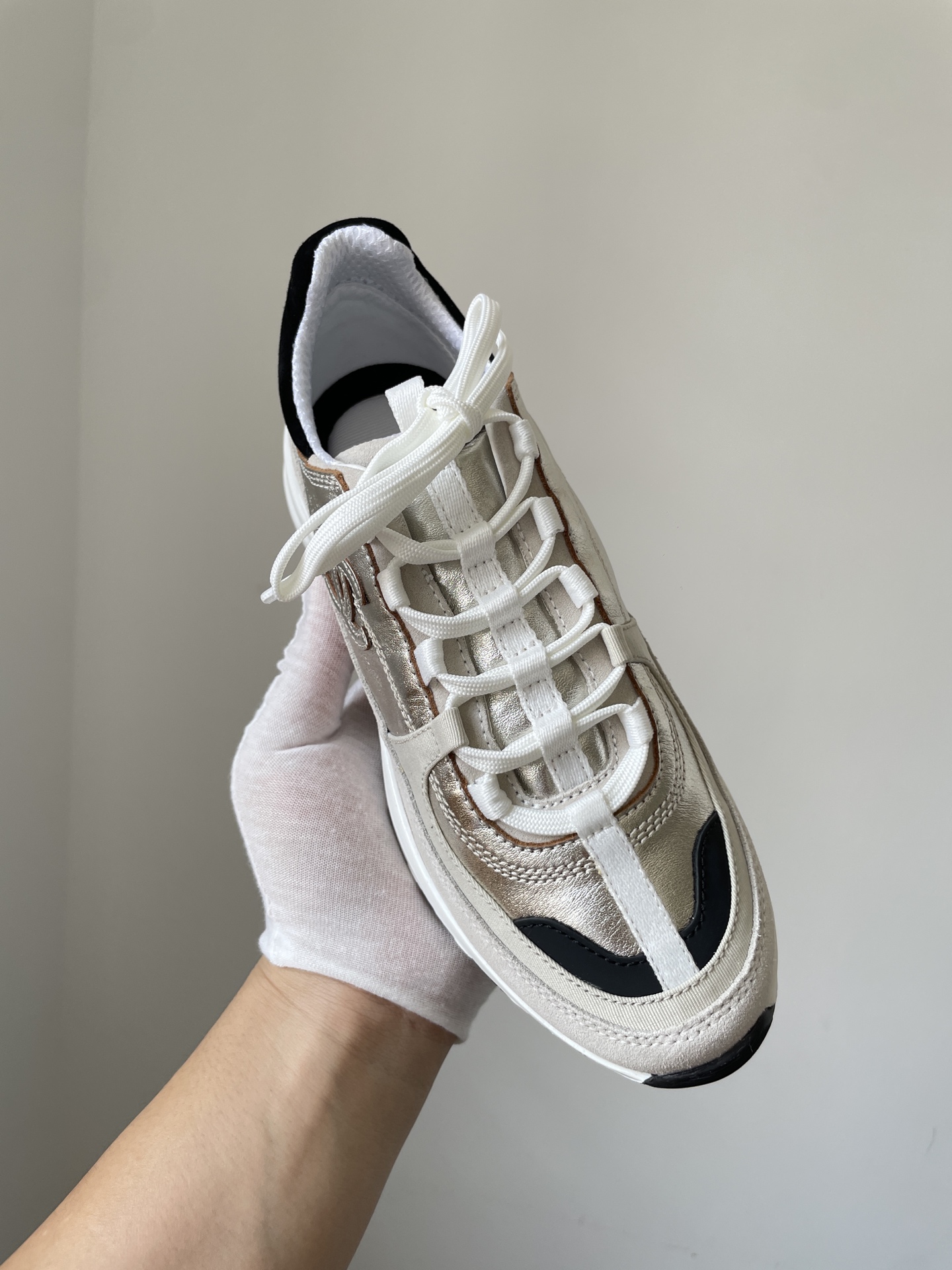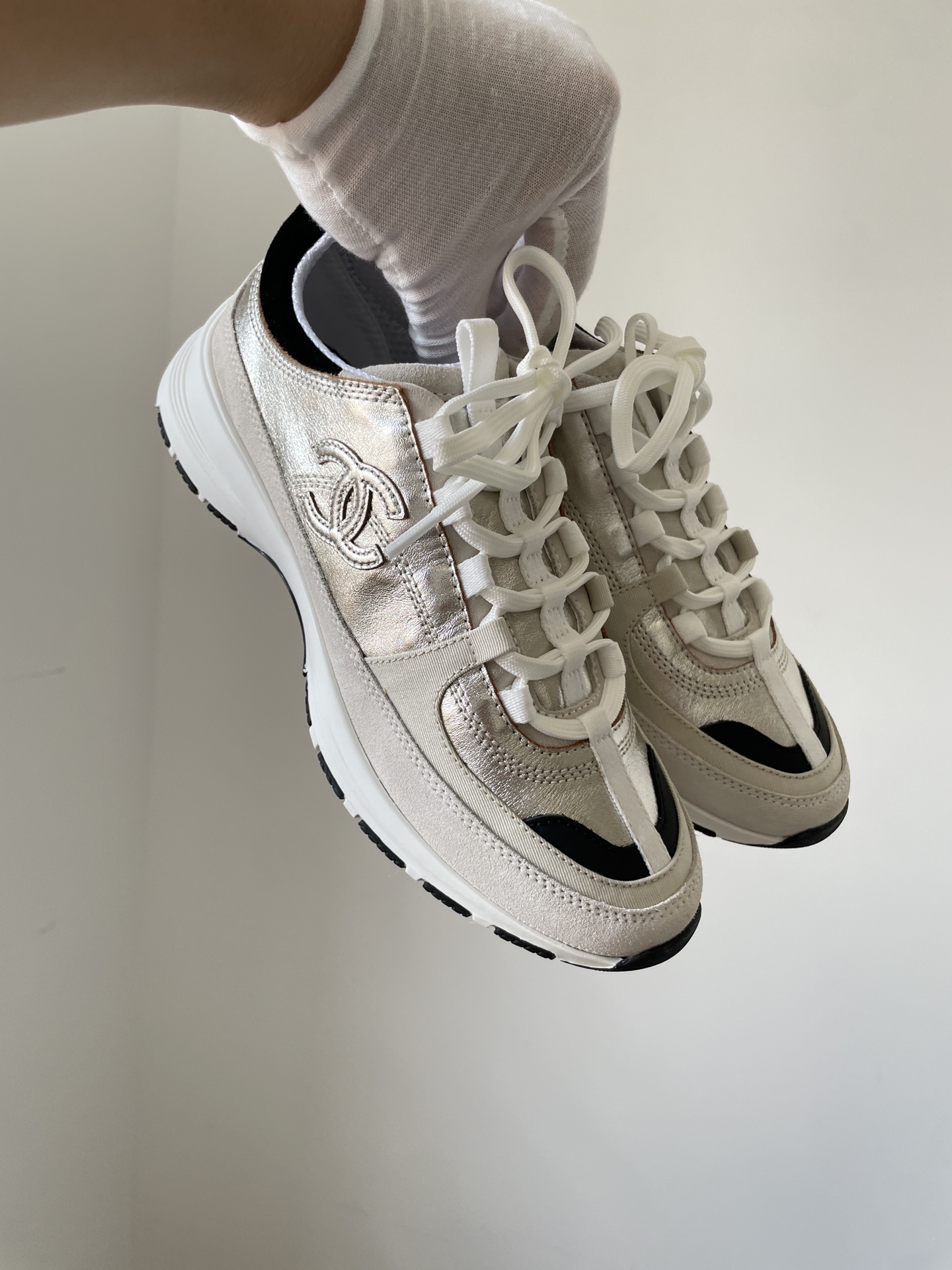 Chanel 25A Calfskin Round Toe Lace-Up Low-Top Sneakers Women Light Gold crafted from premium materials with Chanel’s signature detailing, offering sophistication, comfort, and a luxurious everyday aesthetic.