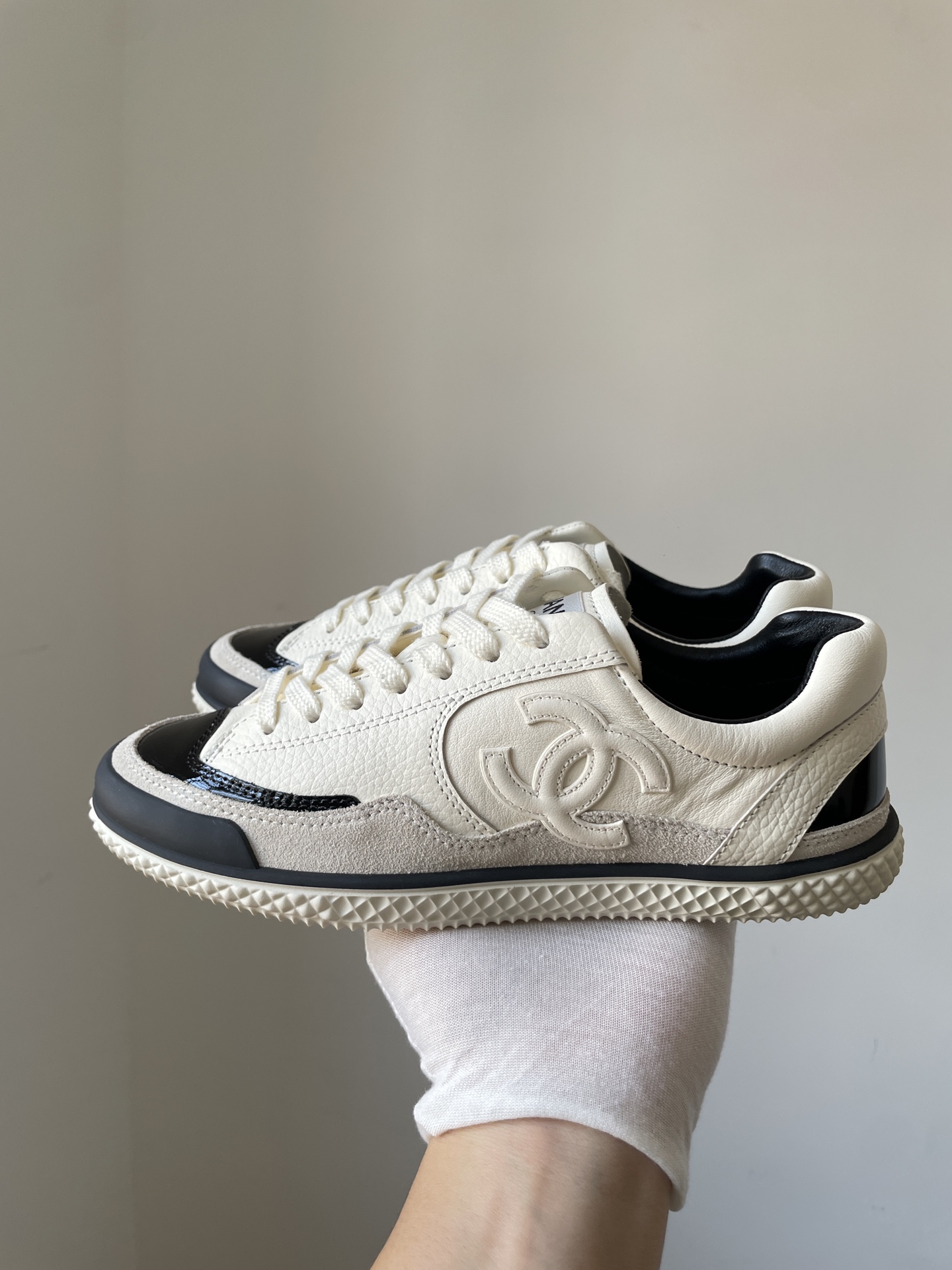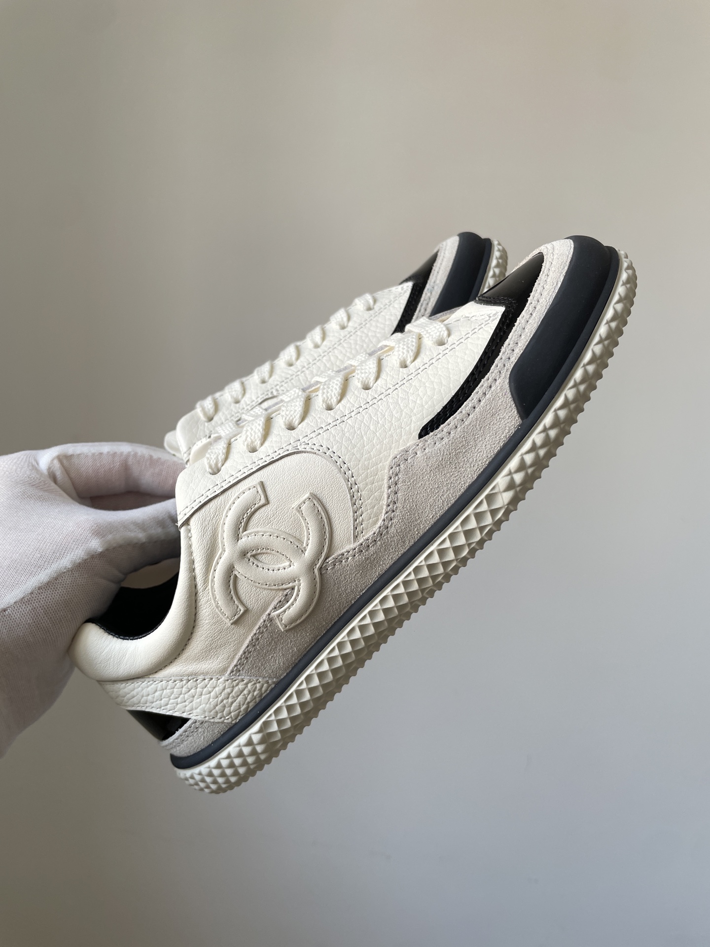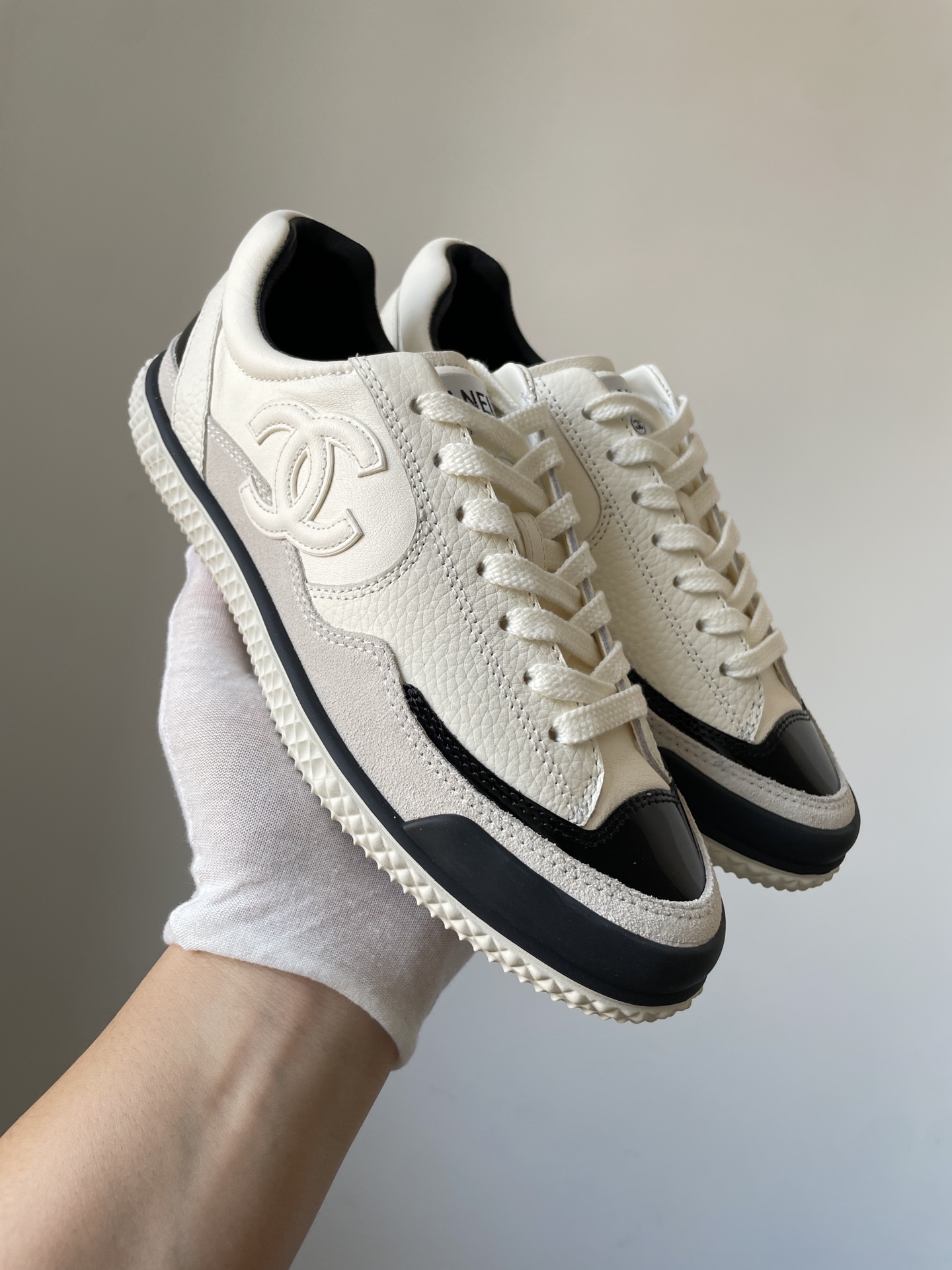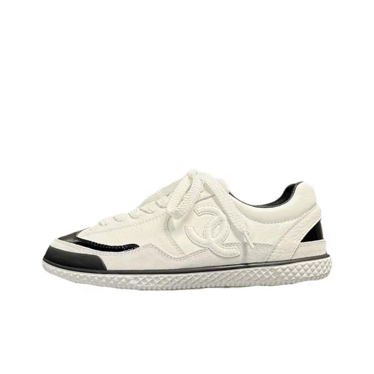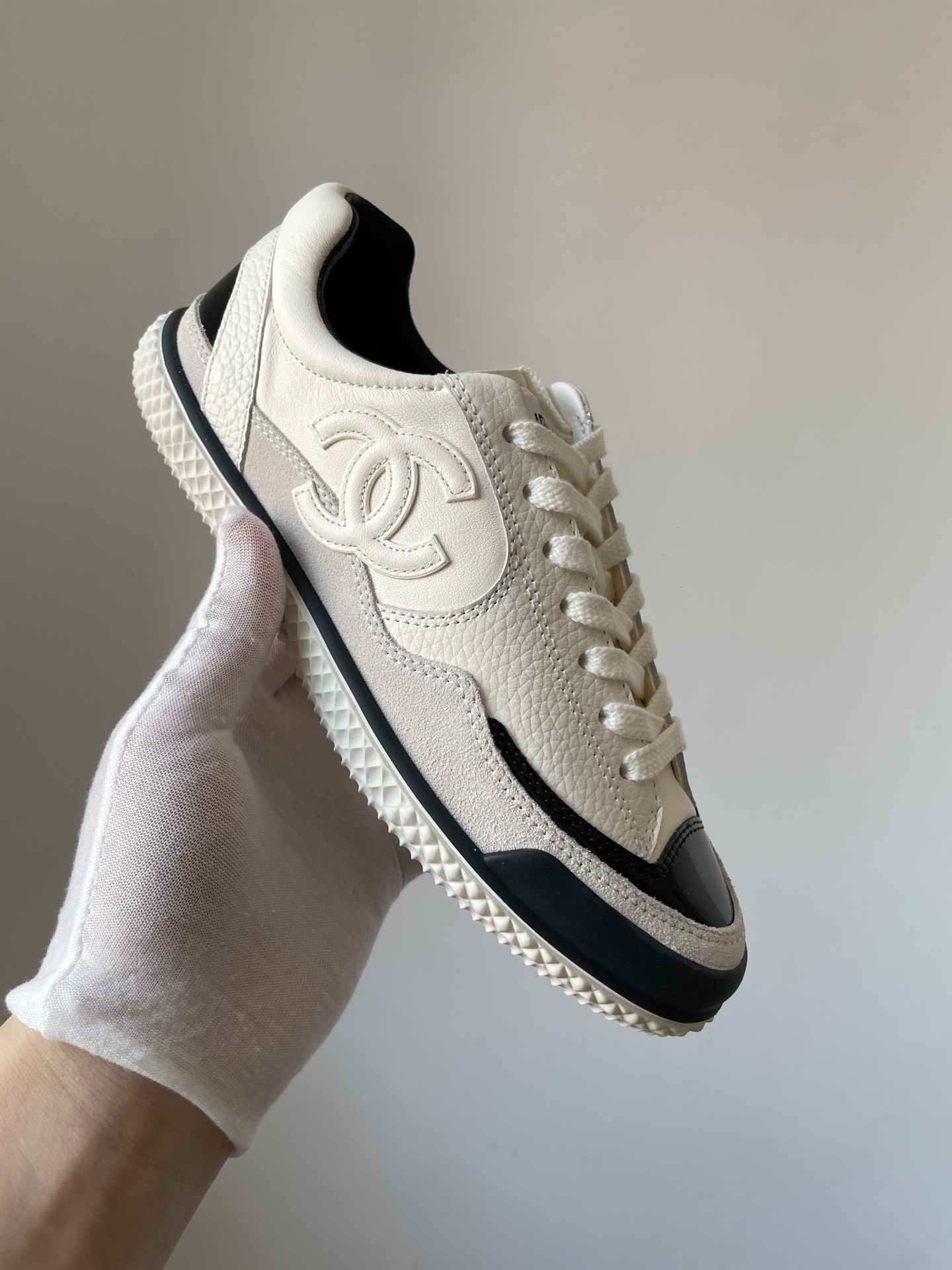Chanel 25K Calfskin Round Toe Lace-Up Low-Top Sneakers Women Ivory White crafted from premium materials with Chanel’s signature detailing, offering sophistication, comfort, and a luxurious everyday aesthetic.