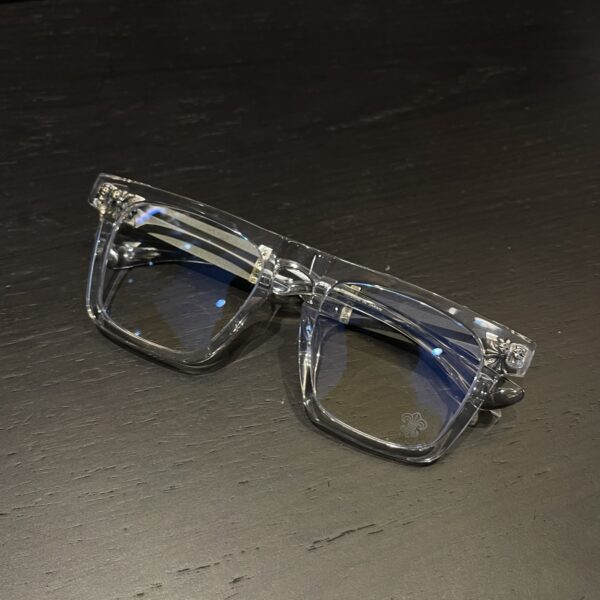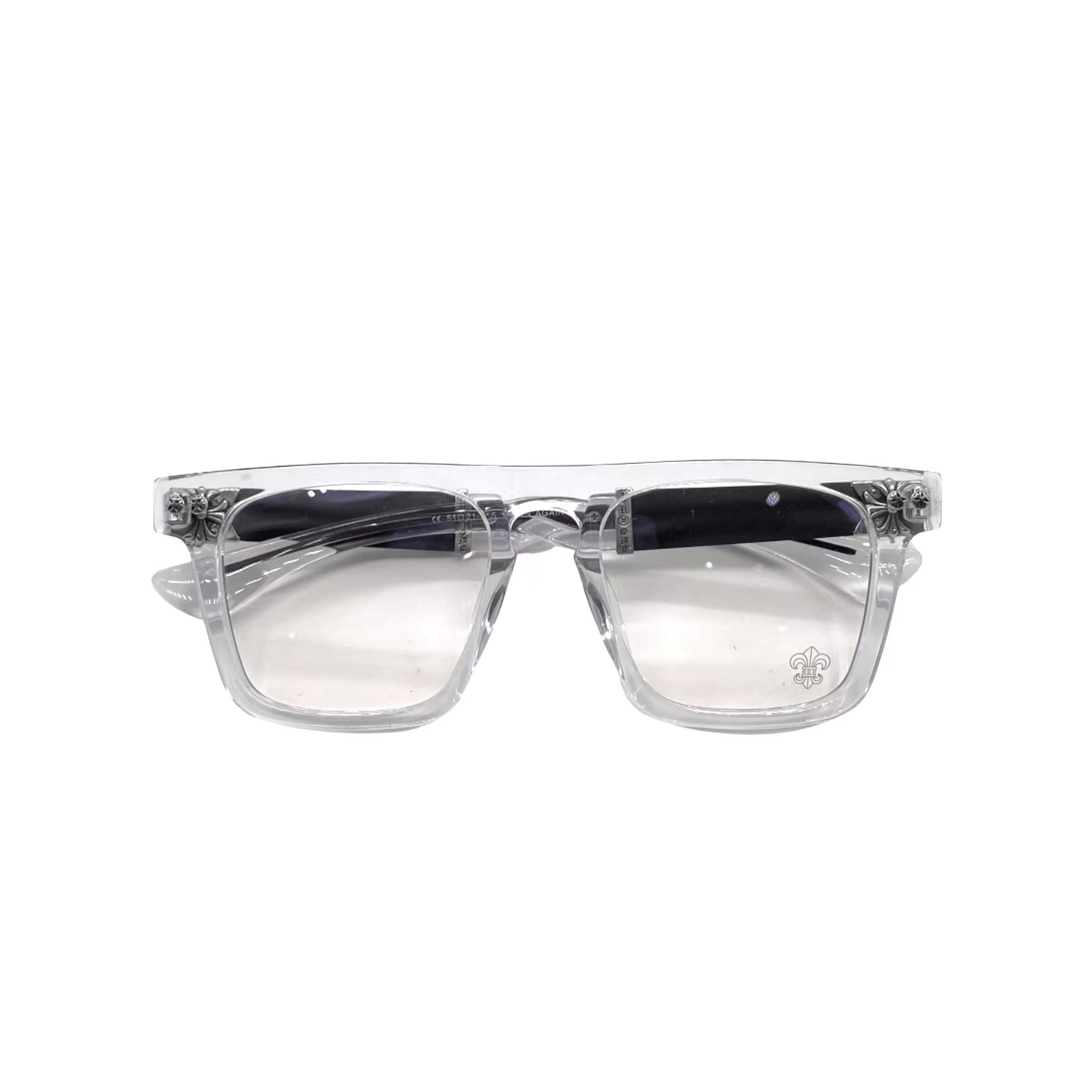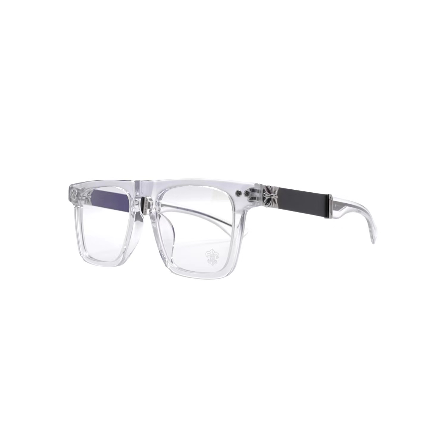 Clear acetate and metal hybrid frame with Chrome Hearts cross detail. Optical lenses for fashion and function.