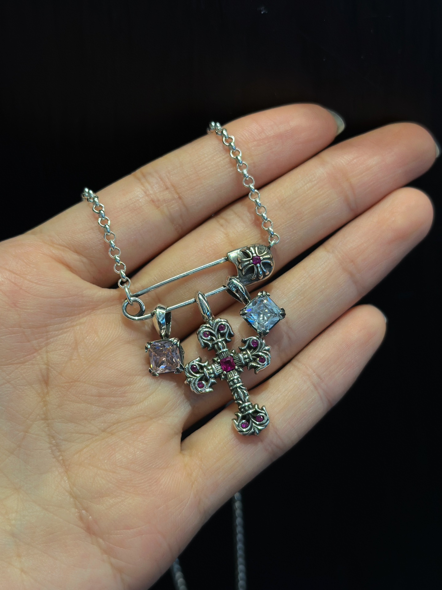 Gold-plated pin flame cross design with red ruby sugar cube pendant, bold and luxurious.