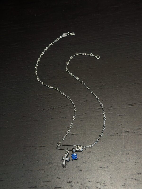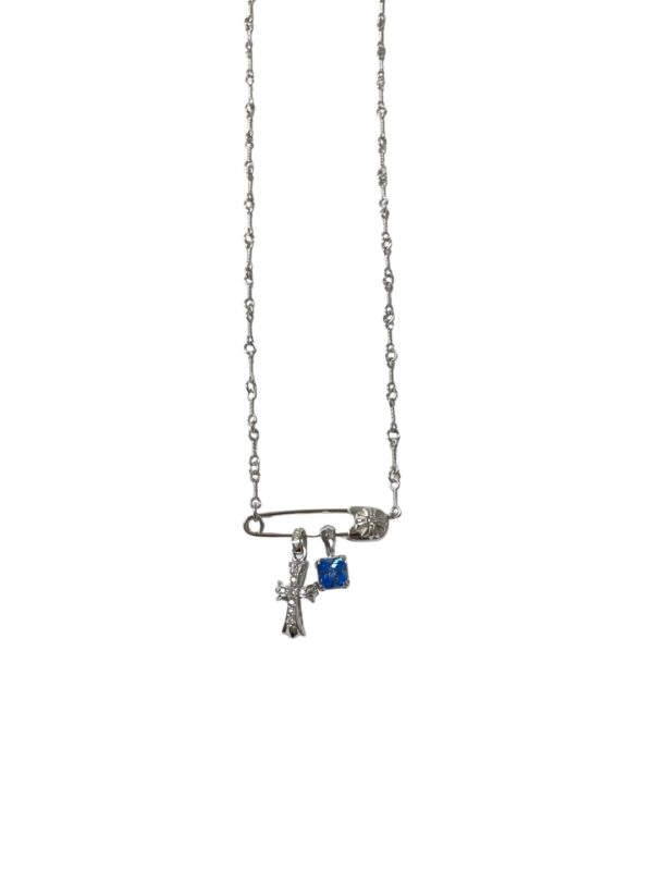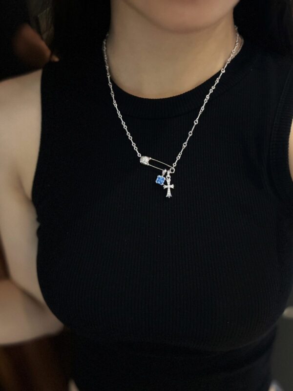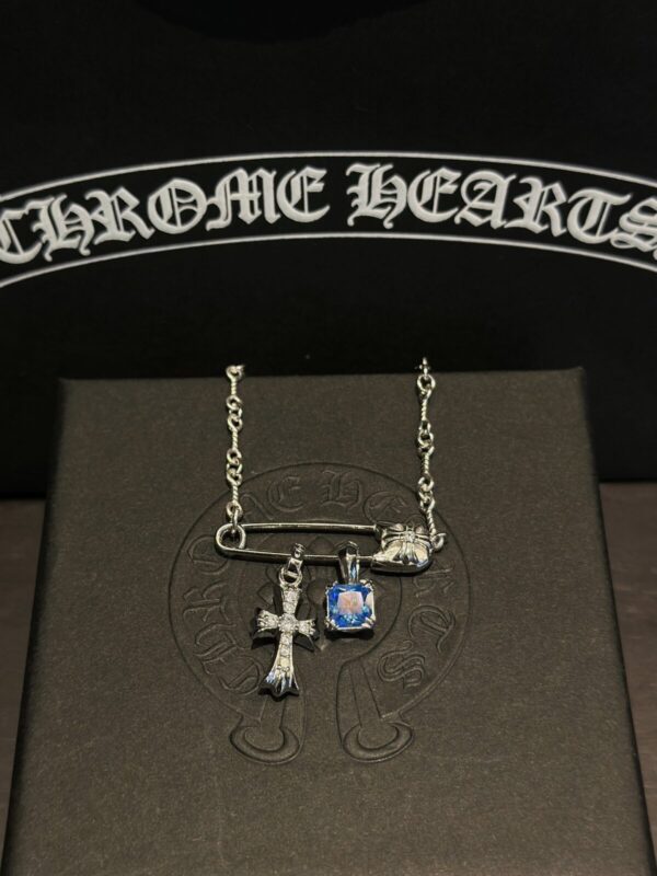 White gold-plated cross pendant necklace with blue diamond sugar cube and white diamond mini cross. Each Chrome Hearts necklace is handcrafted from premium 925 sterling silver or plated gold, showcasing signature gothic crosses, sugar cube motifs, and gemstone accents. Designed for both men and women, these necklaces combine luxury craftsmanship with bold individuality.