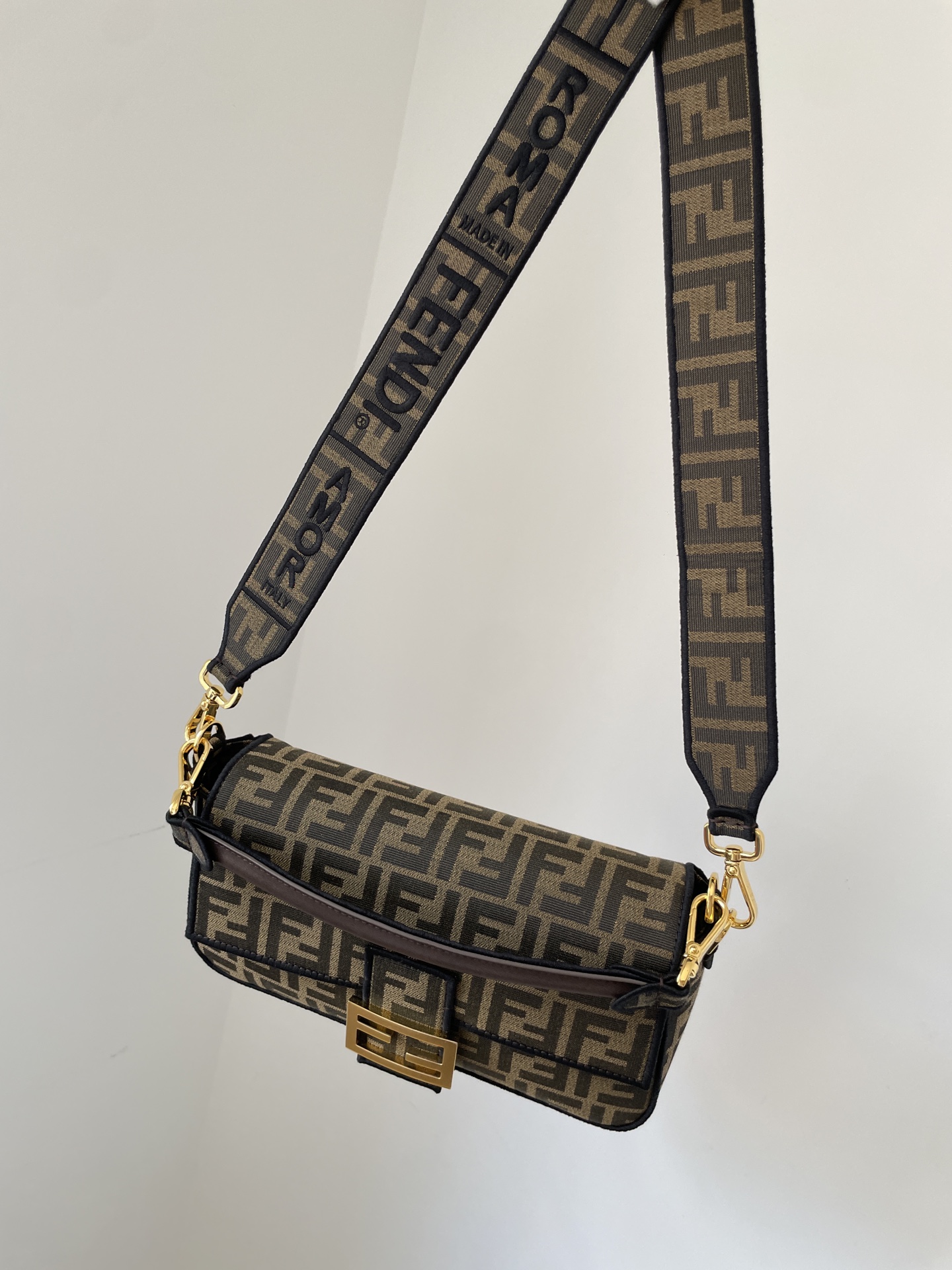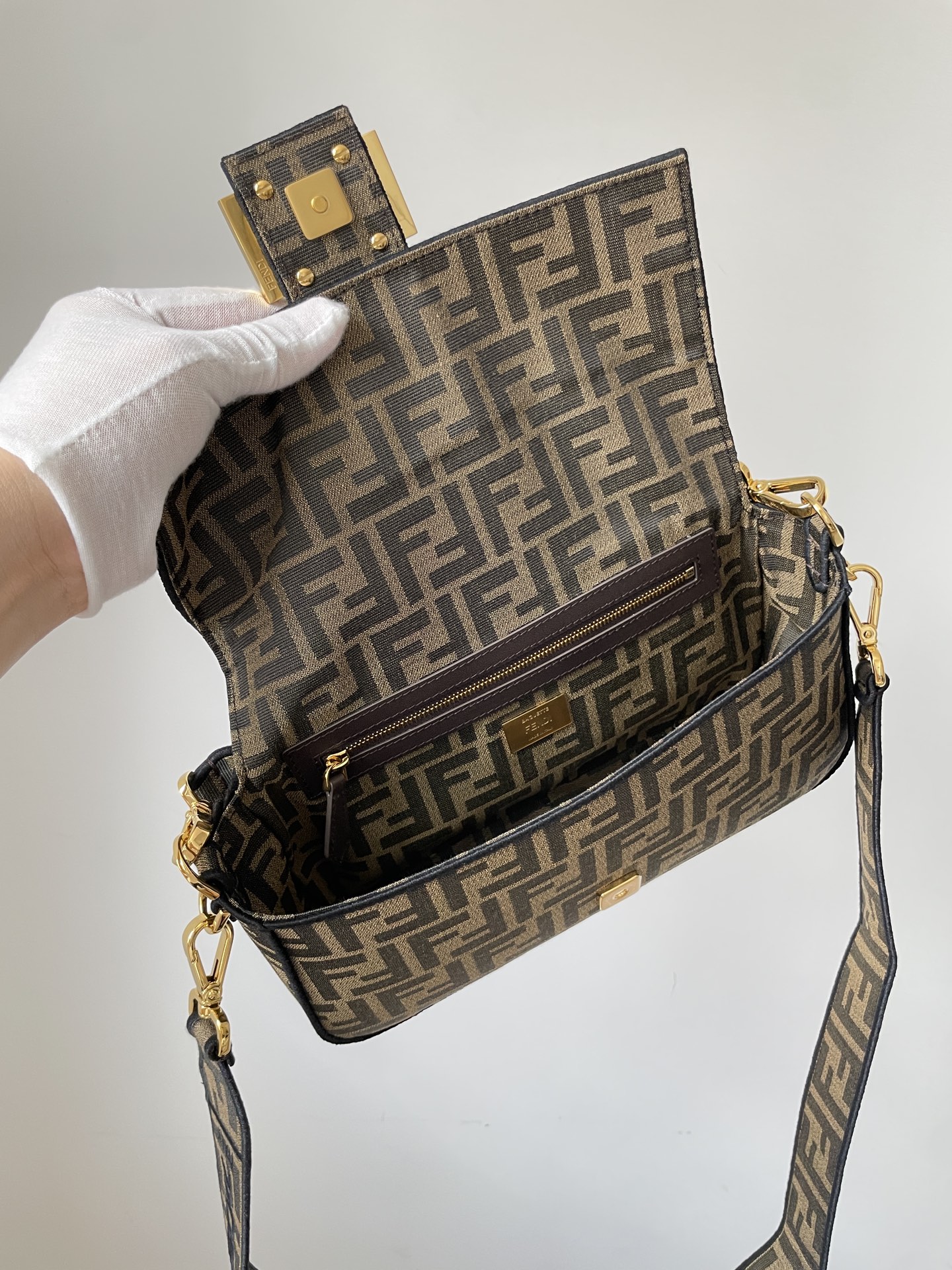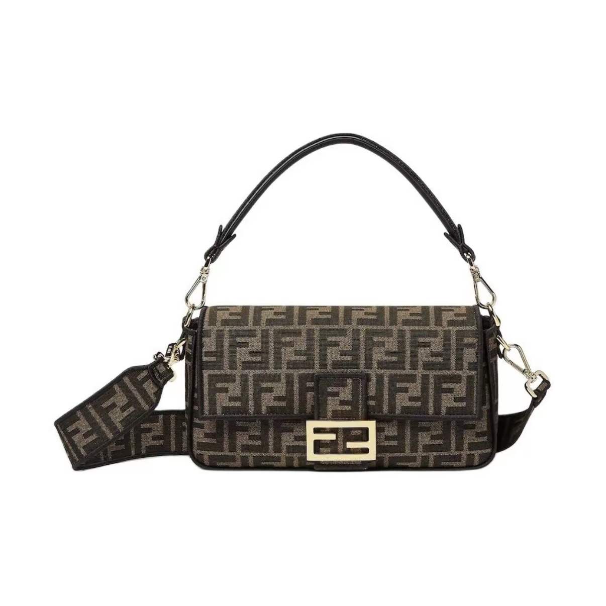 Fendi Baguette FF Jacquard Medium Shoulder and Handbag with Black Embroidery Trim – Brown
