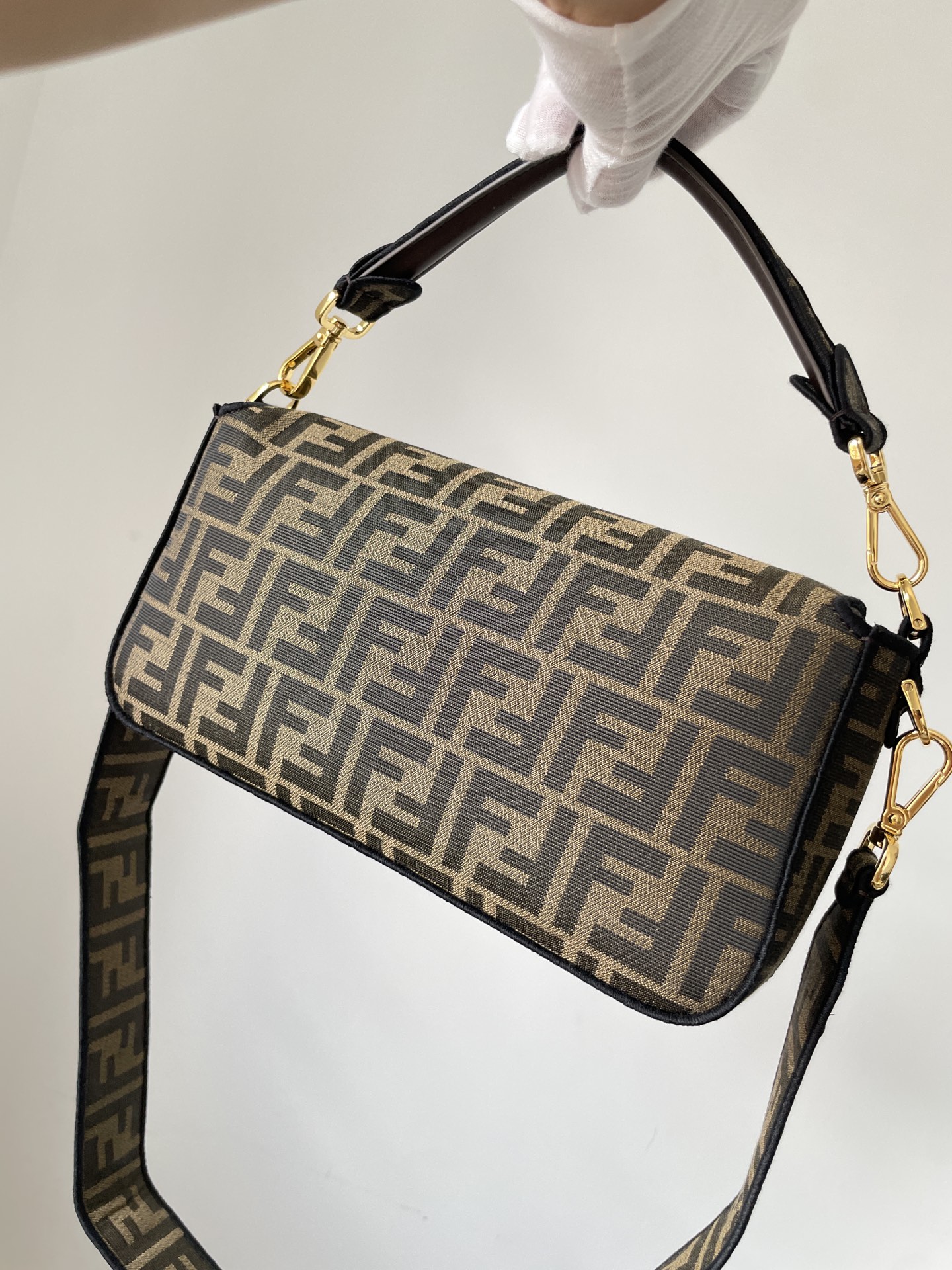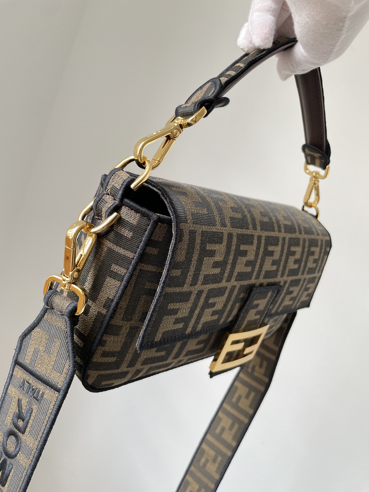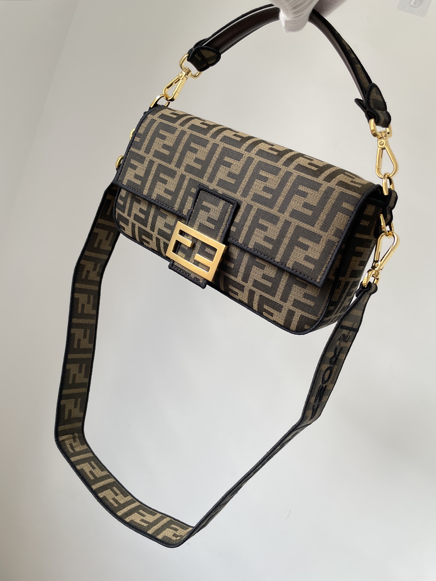 The Fendi Baguette FF Jacquard Medium Bag represents timeless sophistication with its FF monogram, black embroidery trim, and gold hardware. Crafted in durable polyester, it features a magnetic flap closure, top handle, and shoulder strap — 27×6×15cm.