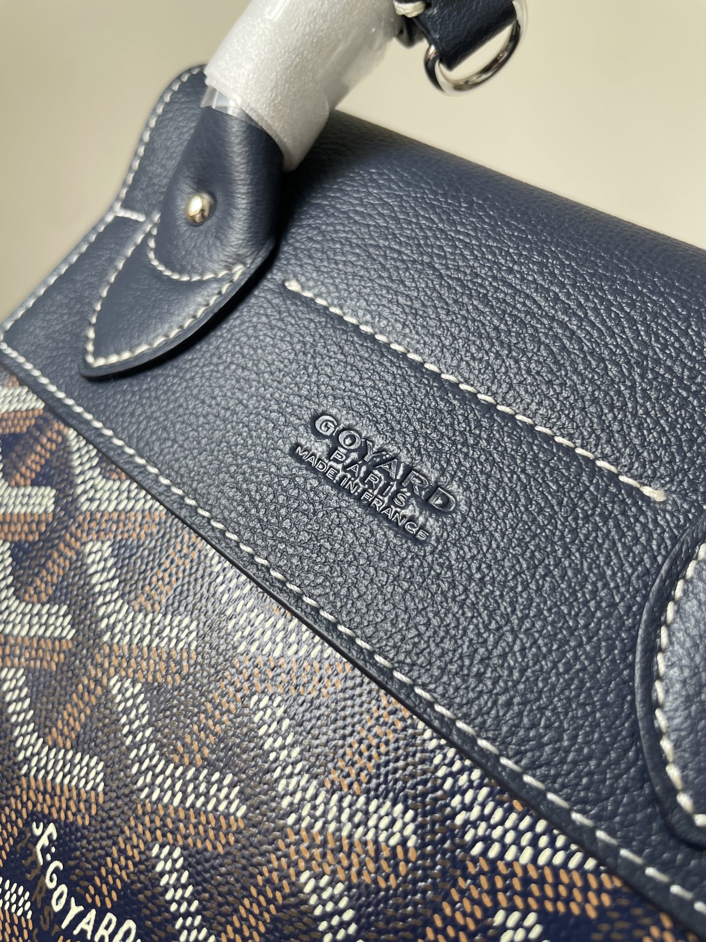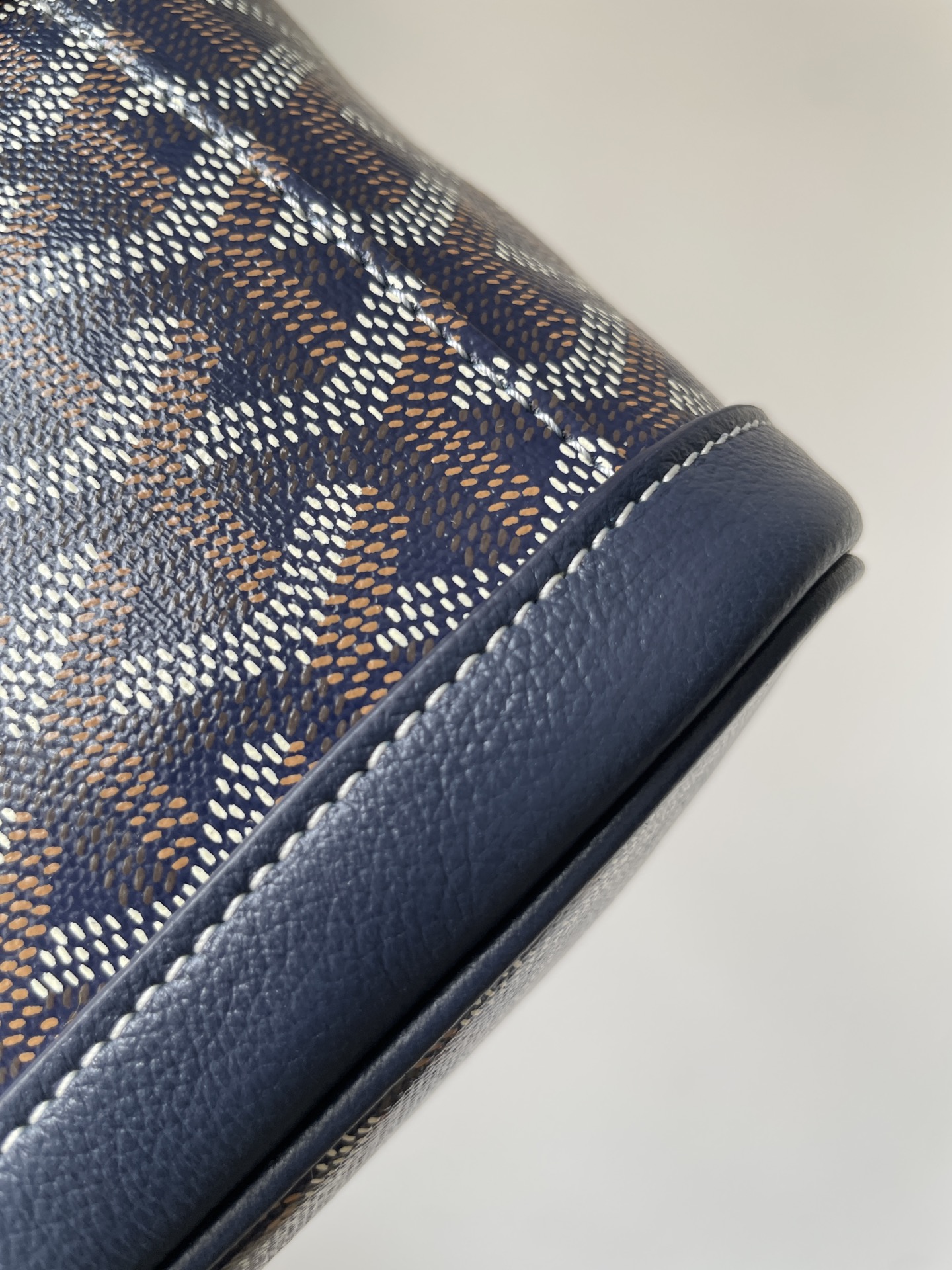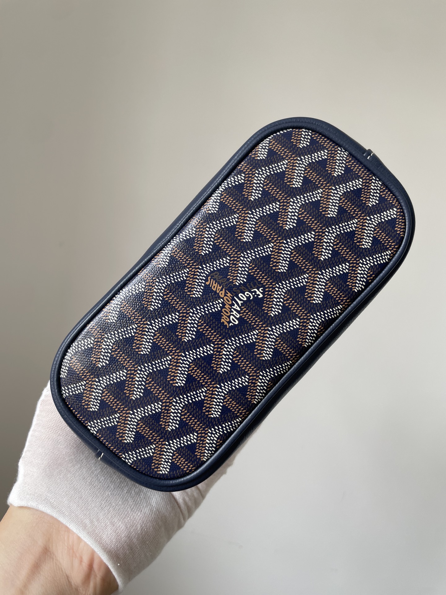 The GOYARD Alpin Mini in navy blue combines refined craftsmanship with the brand’s classic pattern. A timeless companion for modern city living. Dimensions: 19×9.5×23cm.
