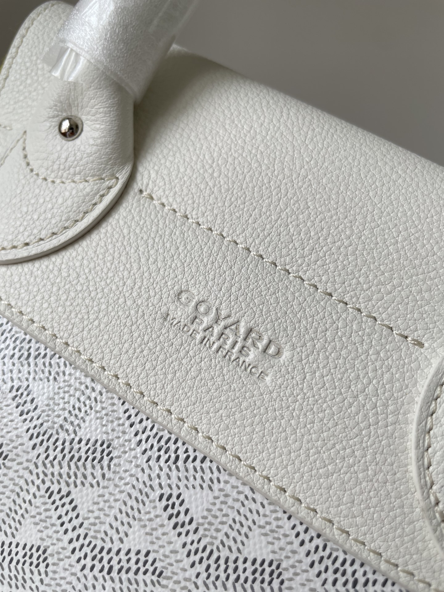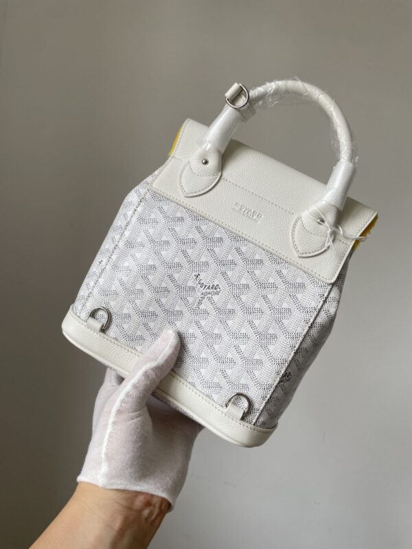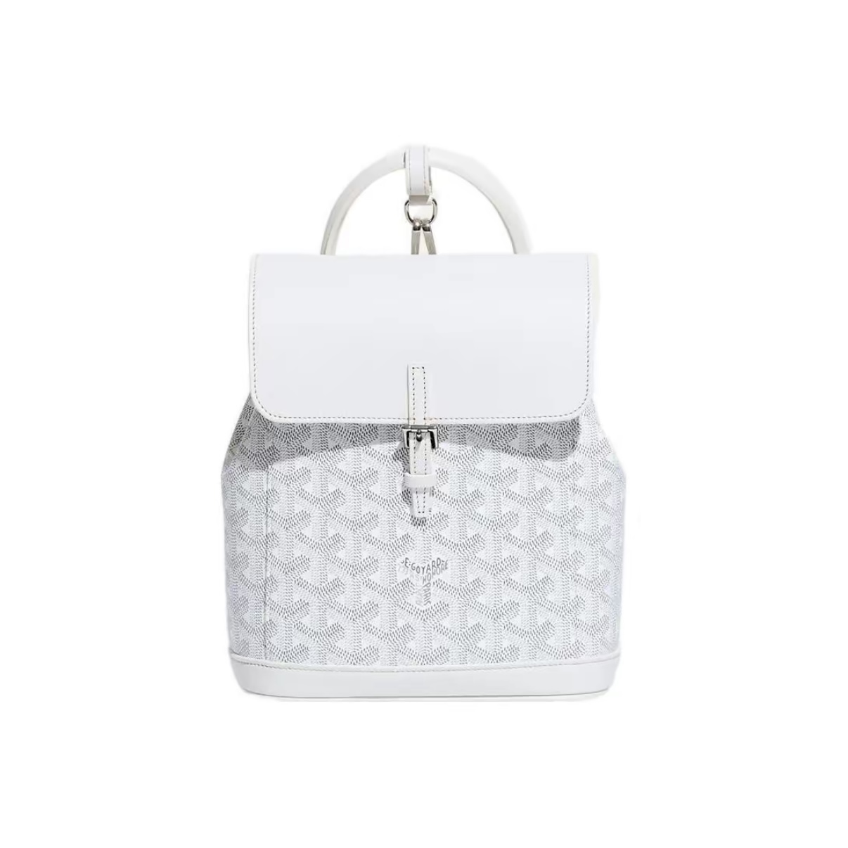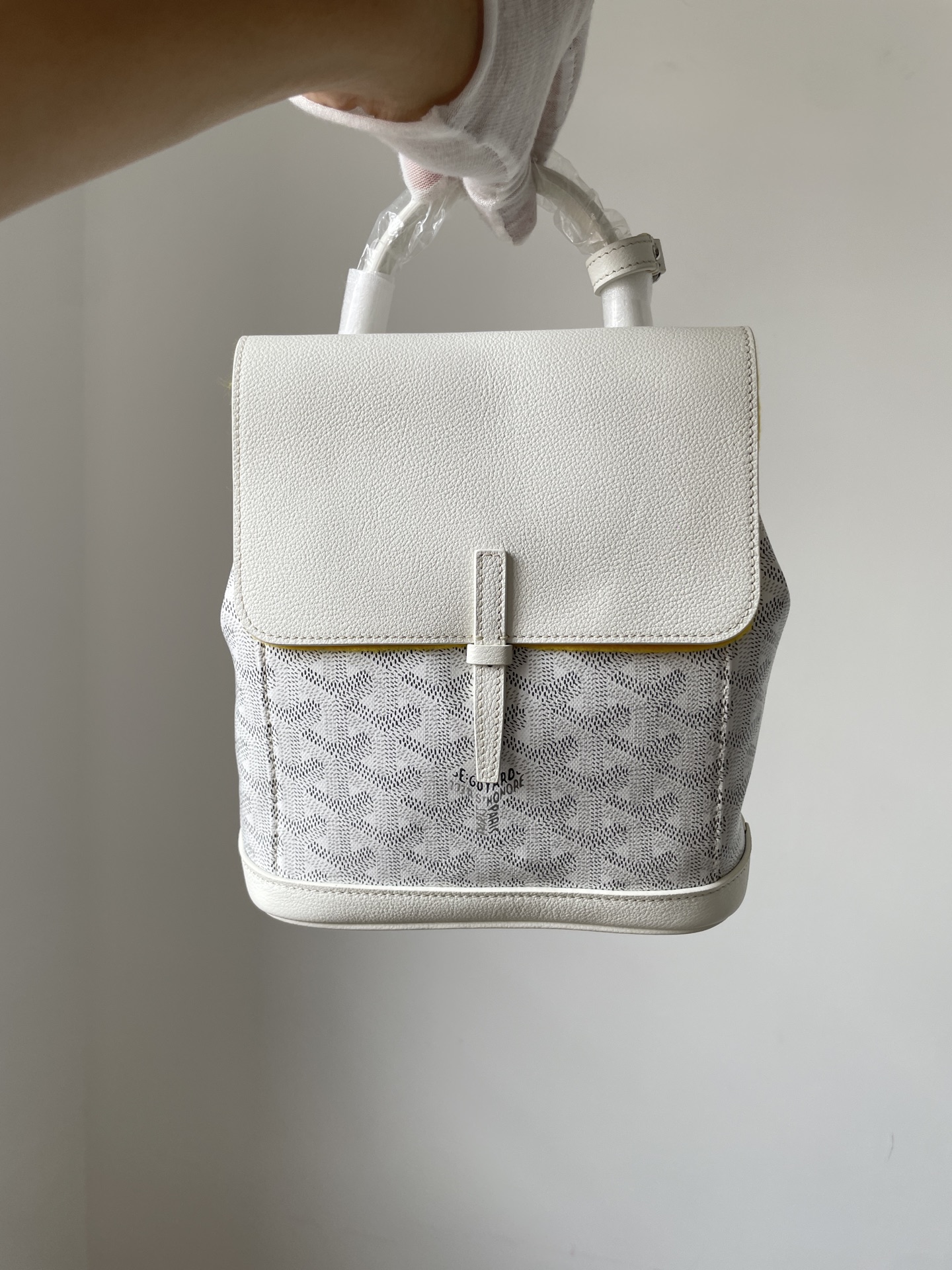 GOYARD’s Alpin Mini backpack in white features adjustable shoulder straps, multiple pockets, and luxurious craftsmanship in canvas and leather. Dimensions: 19×9.5×23cm.