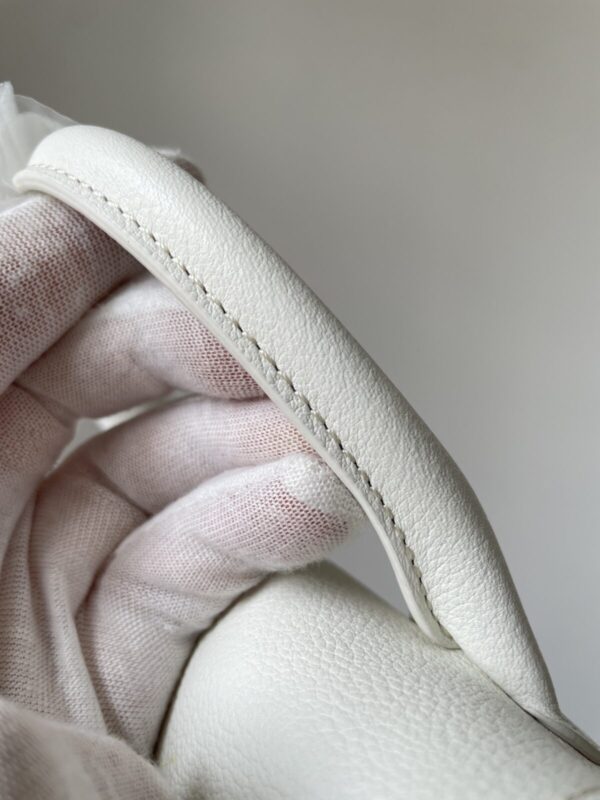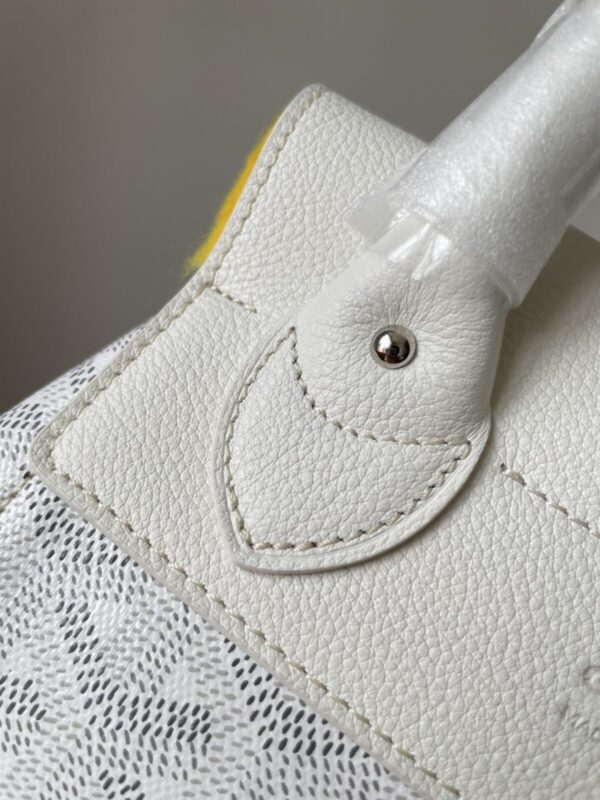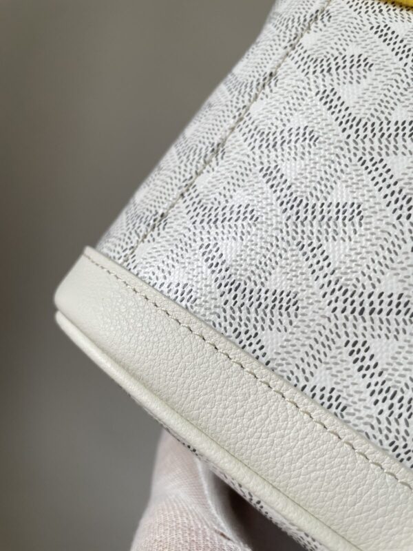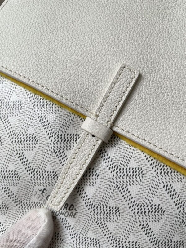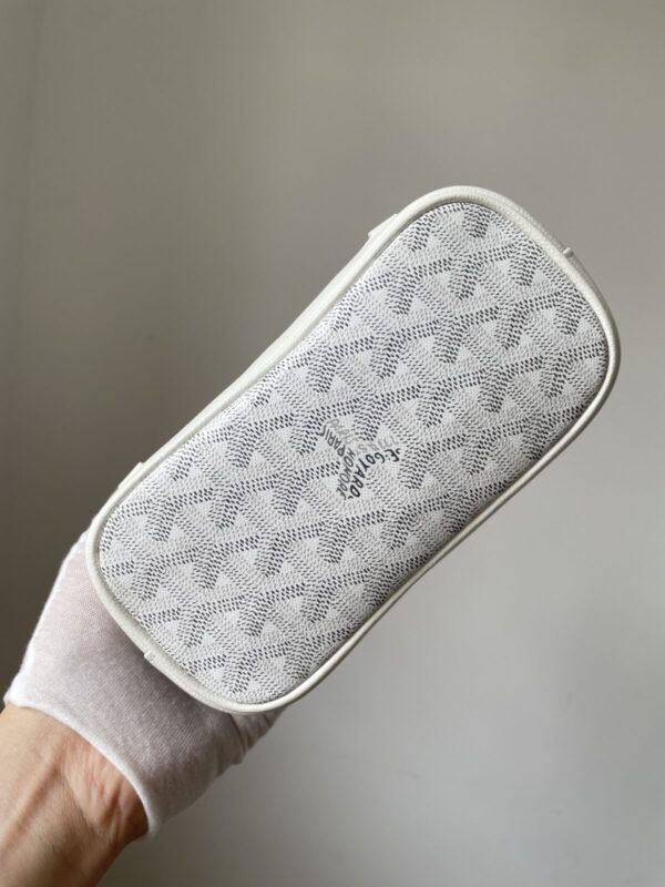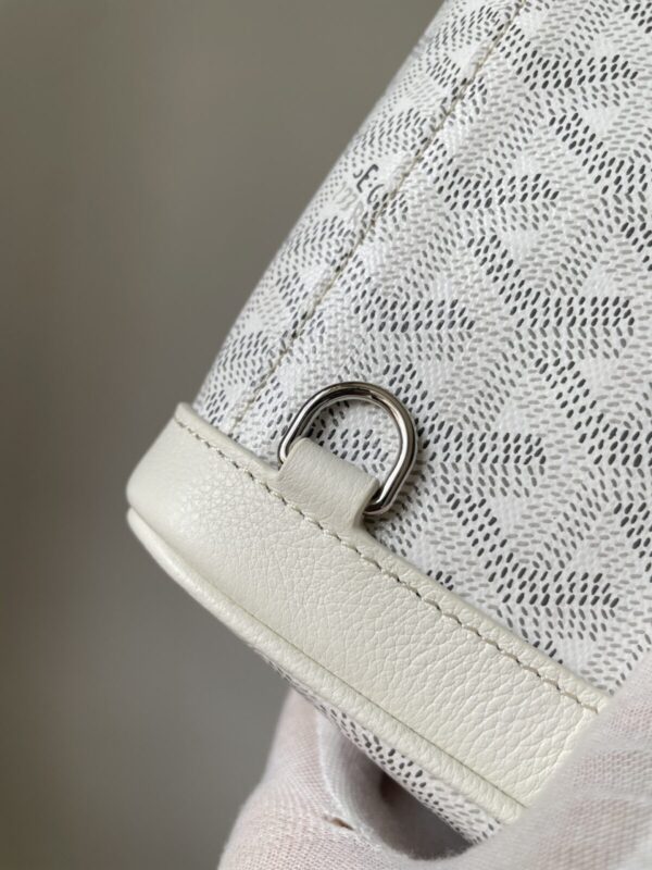 GOYARD’s Alpin Mini backpack in white features adjustable shoulder straps, multiple pockets, and luxurious craftsmanship in canvas and leather. Dimensions: 19×9.5×23cm.