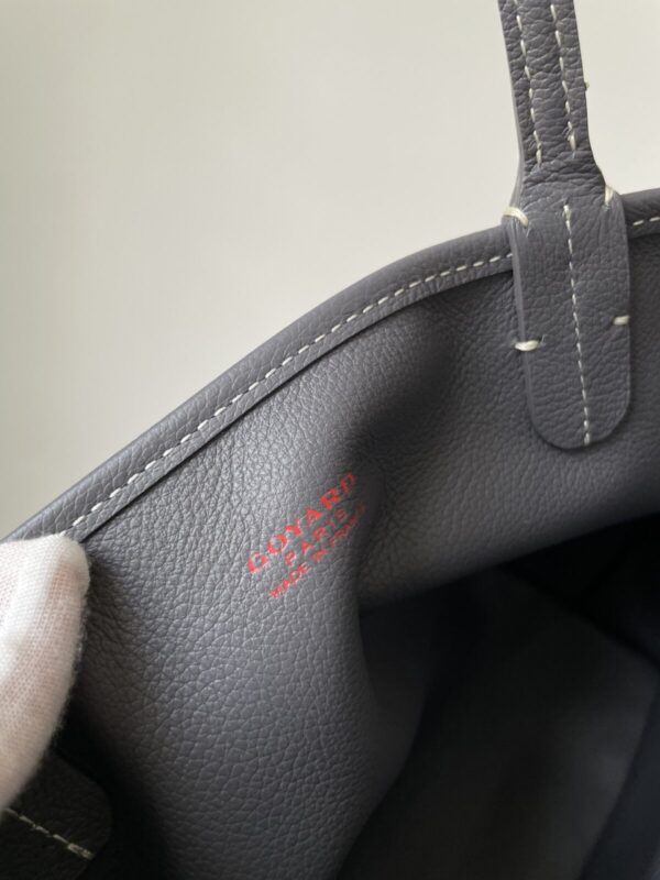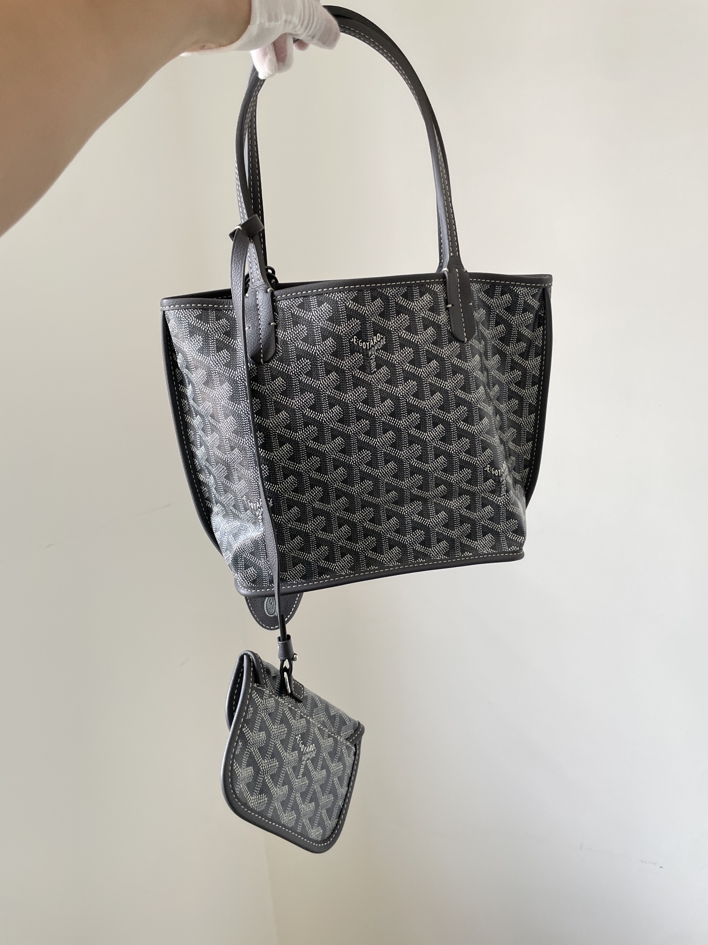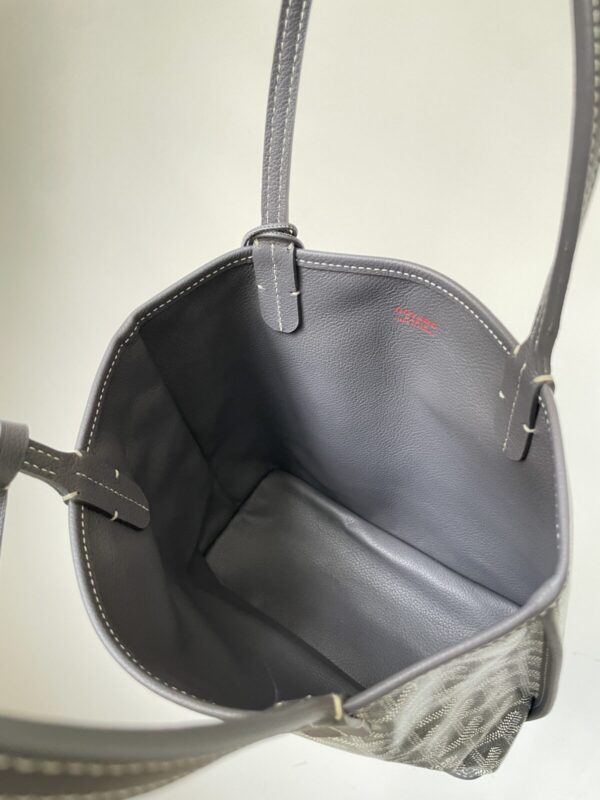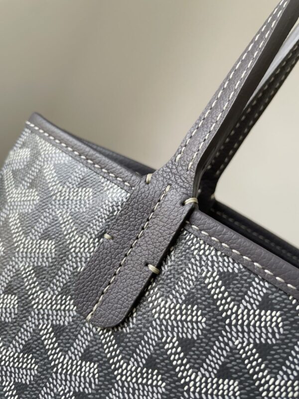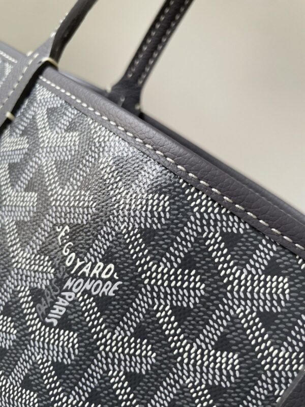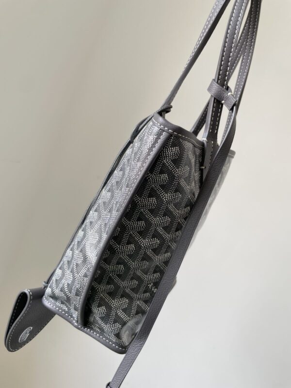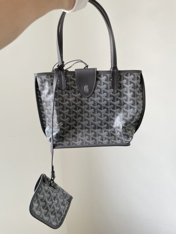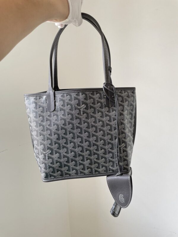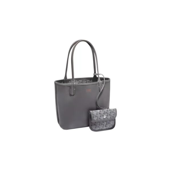 The Goyard Anjou Mini Tote Bag features Goyardine coated canvas, reversible design, detachable pouch, and leather handles. Dimensions: 20×10×20cm.