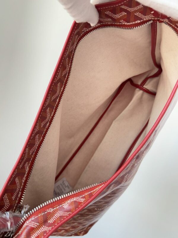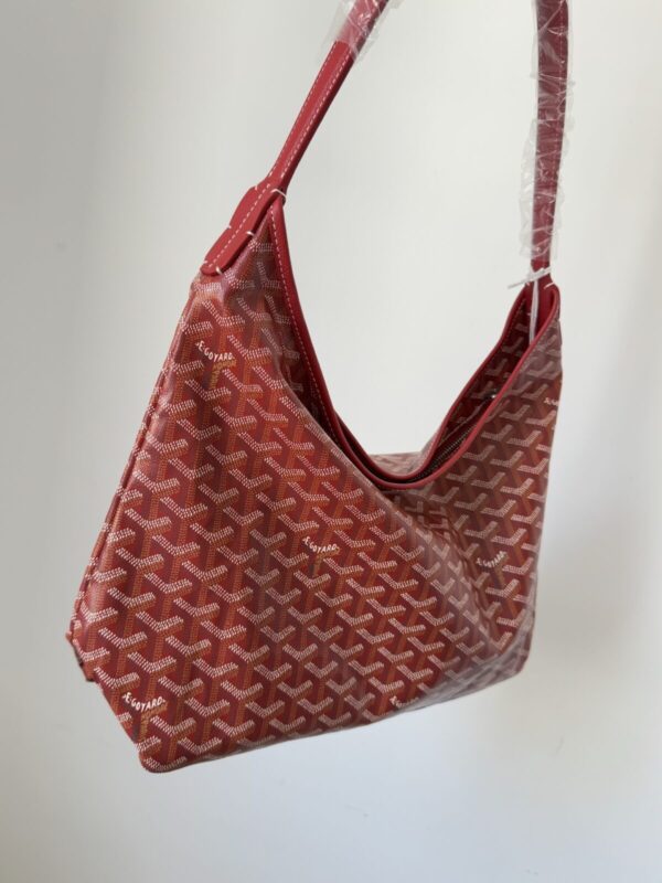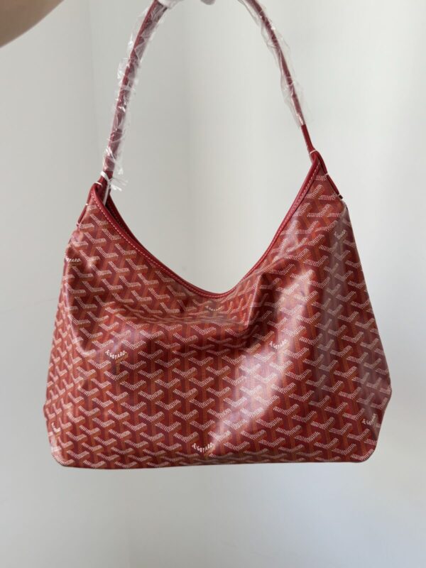 The GOYARD Bohème Hobo features the iconic Y-pattern canvas combined with supple calfskin leather. Designed with a sturdy handle and spacious interior, this red edition offers both practicality and timeless Parisian charm. Dimensions: 27×15×42cm.