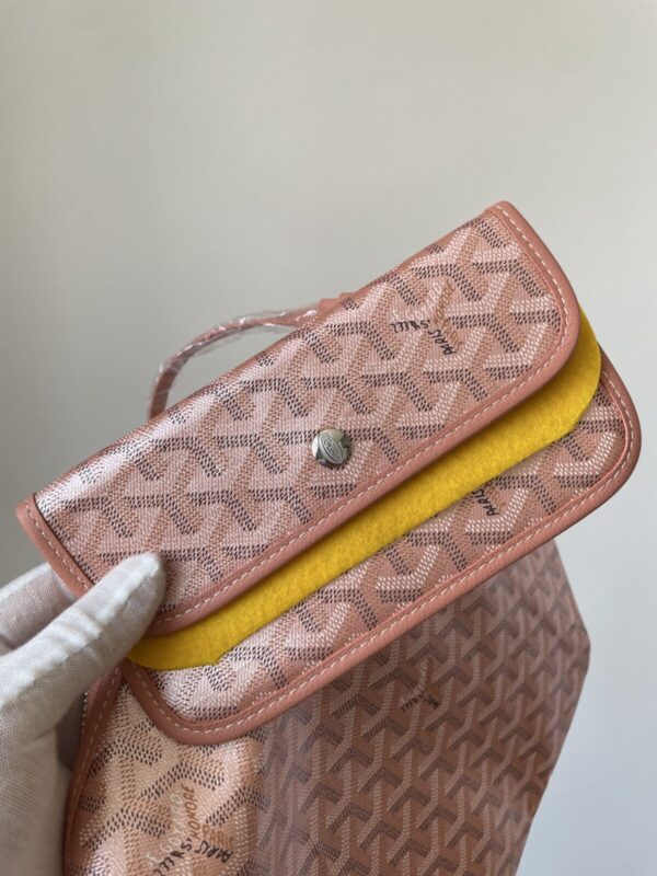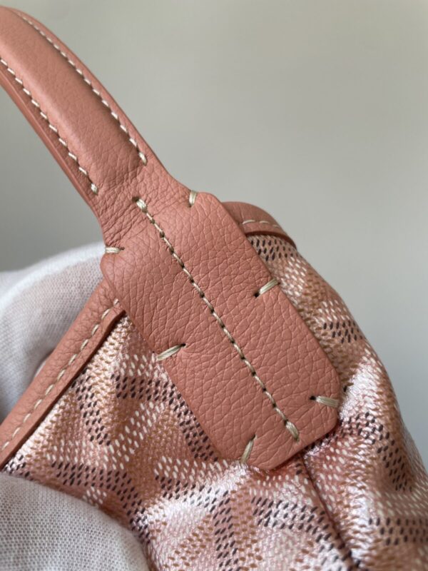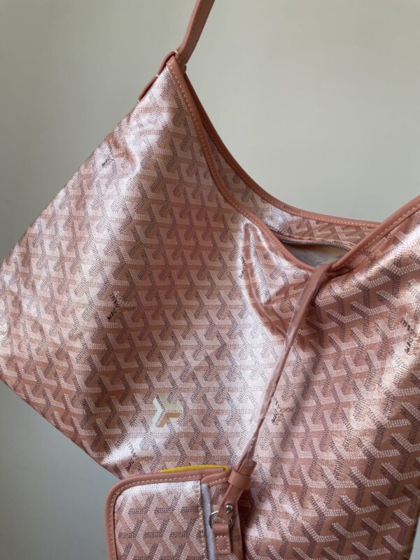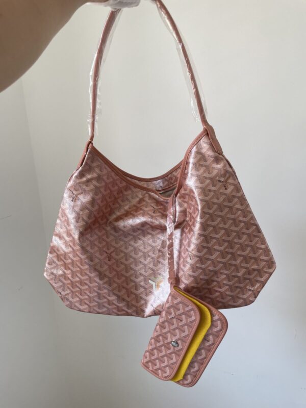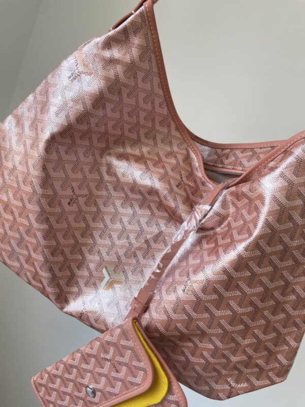 The GOYARD Bohème Hobo in coral pink showcases premium canvas with wide leather handle and classic Y pattern. A refined statement of luxury craftsmanship. Dimensions: 41×14×26cm.