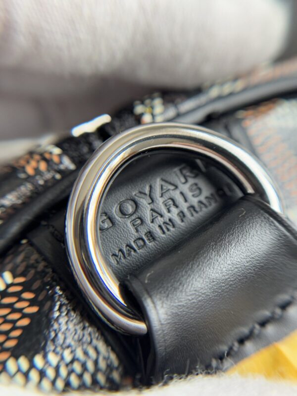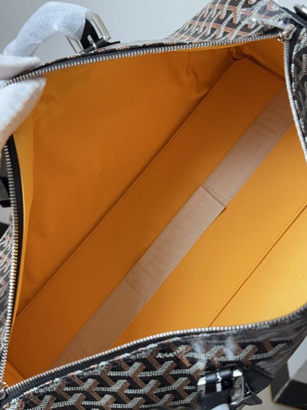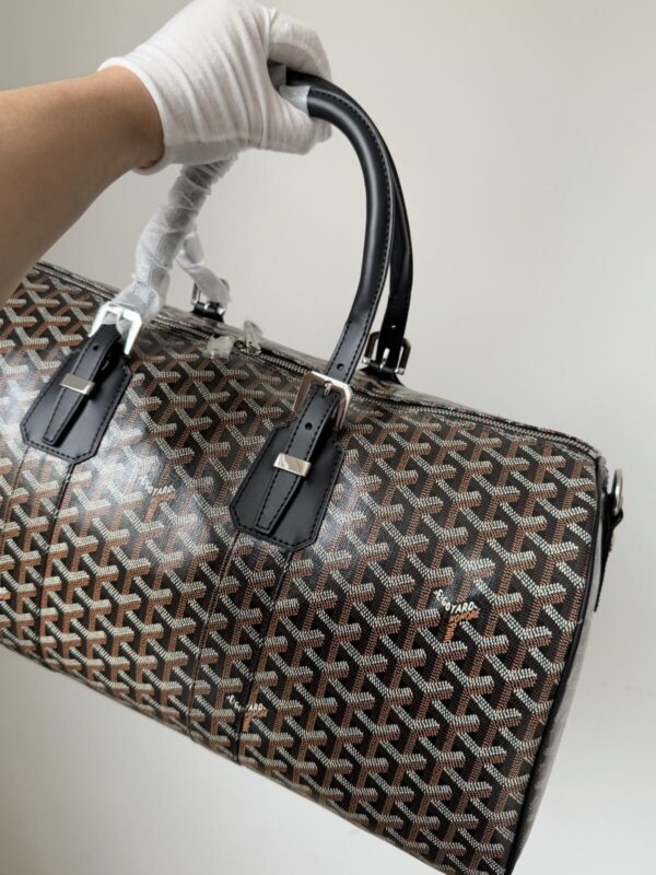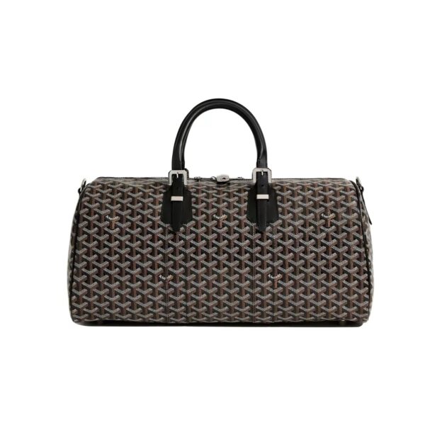 The GOYARD Boston 45 travel bag is crafted in black Goyardine canvas with leather accents, featuring a zip closure, dual handles, and detachable strap. Dimensions: 49×22×27cm.