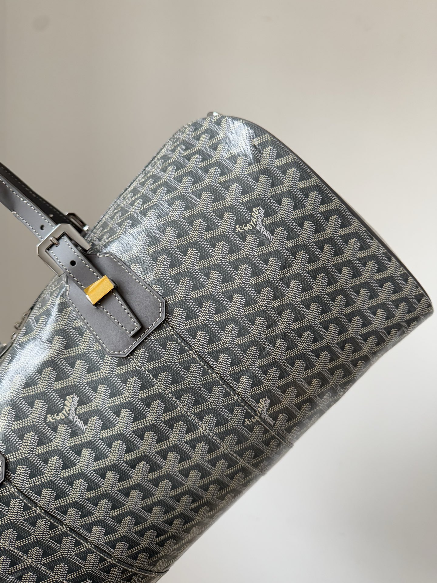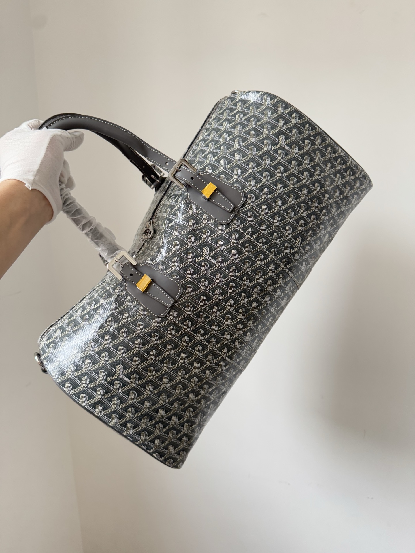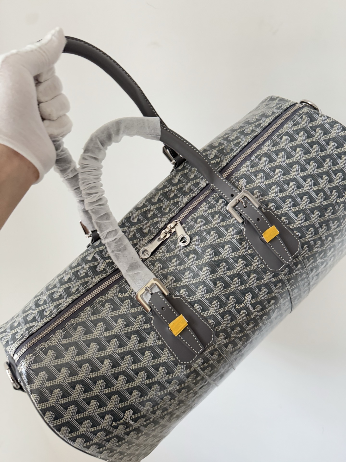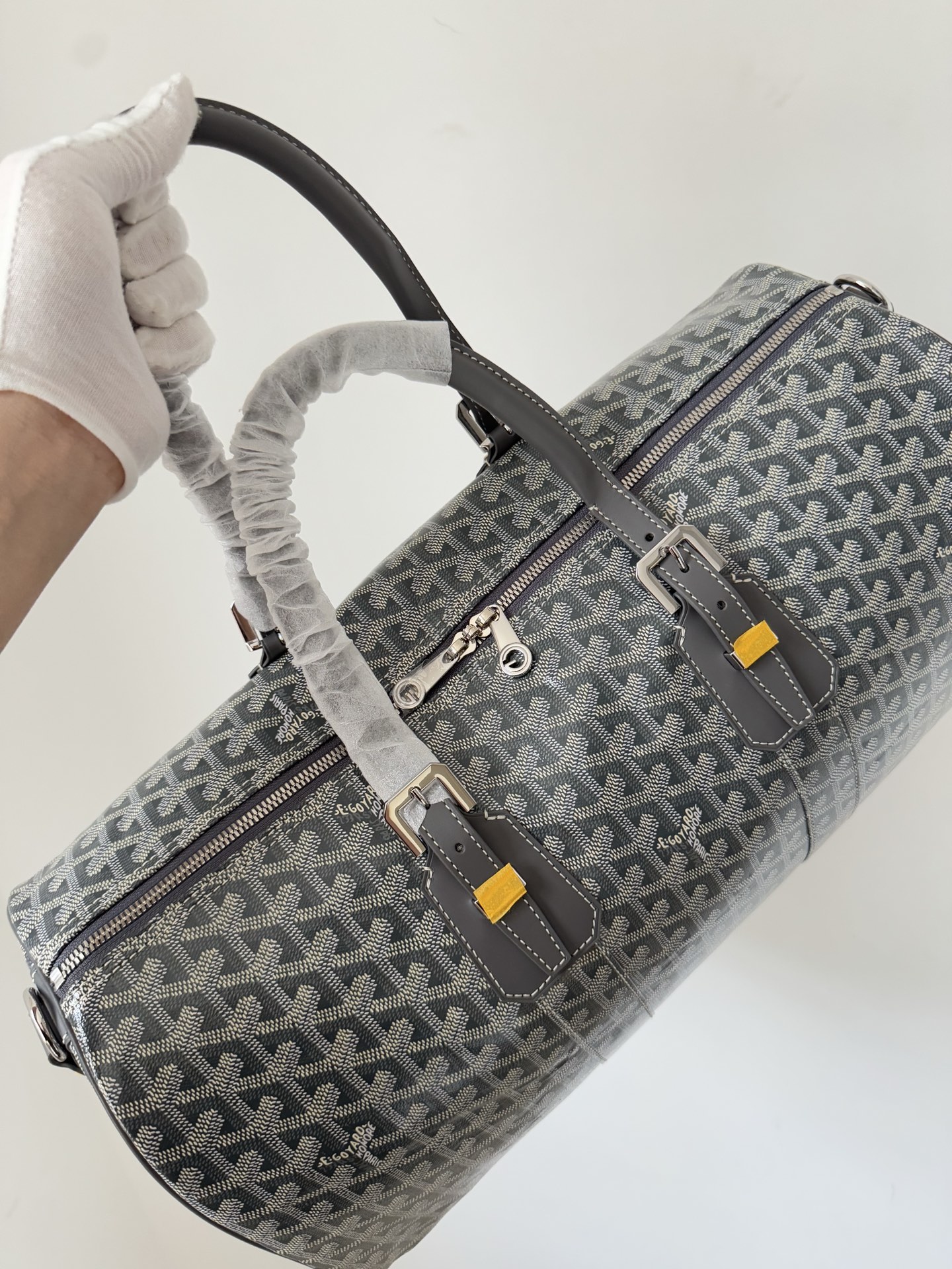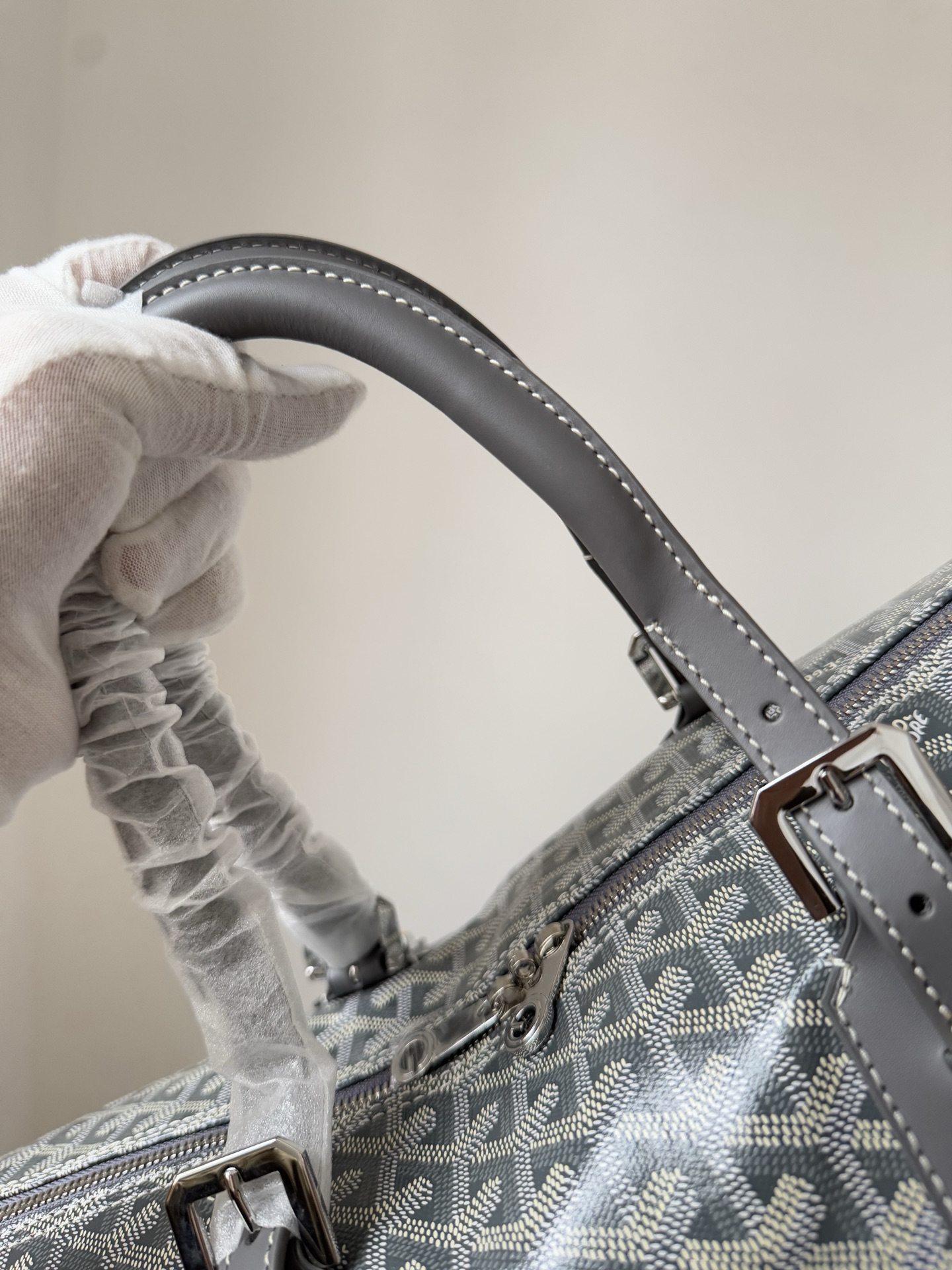 GOYARD Boston 45 duffle bag in gray canvas and leather — sophisticated and practical travel piece.