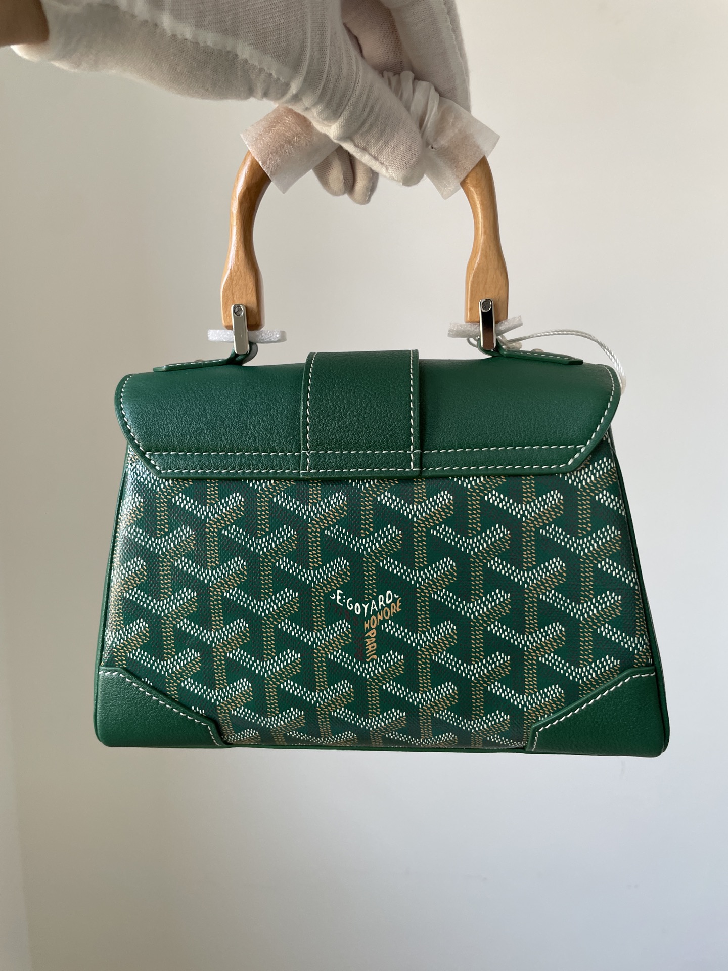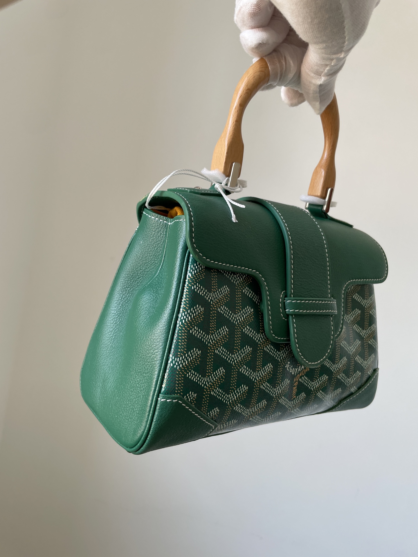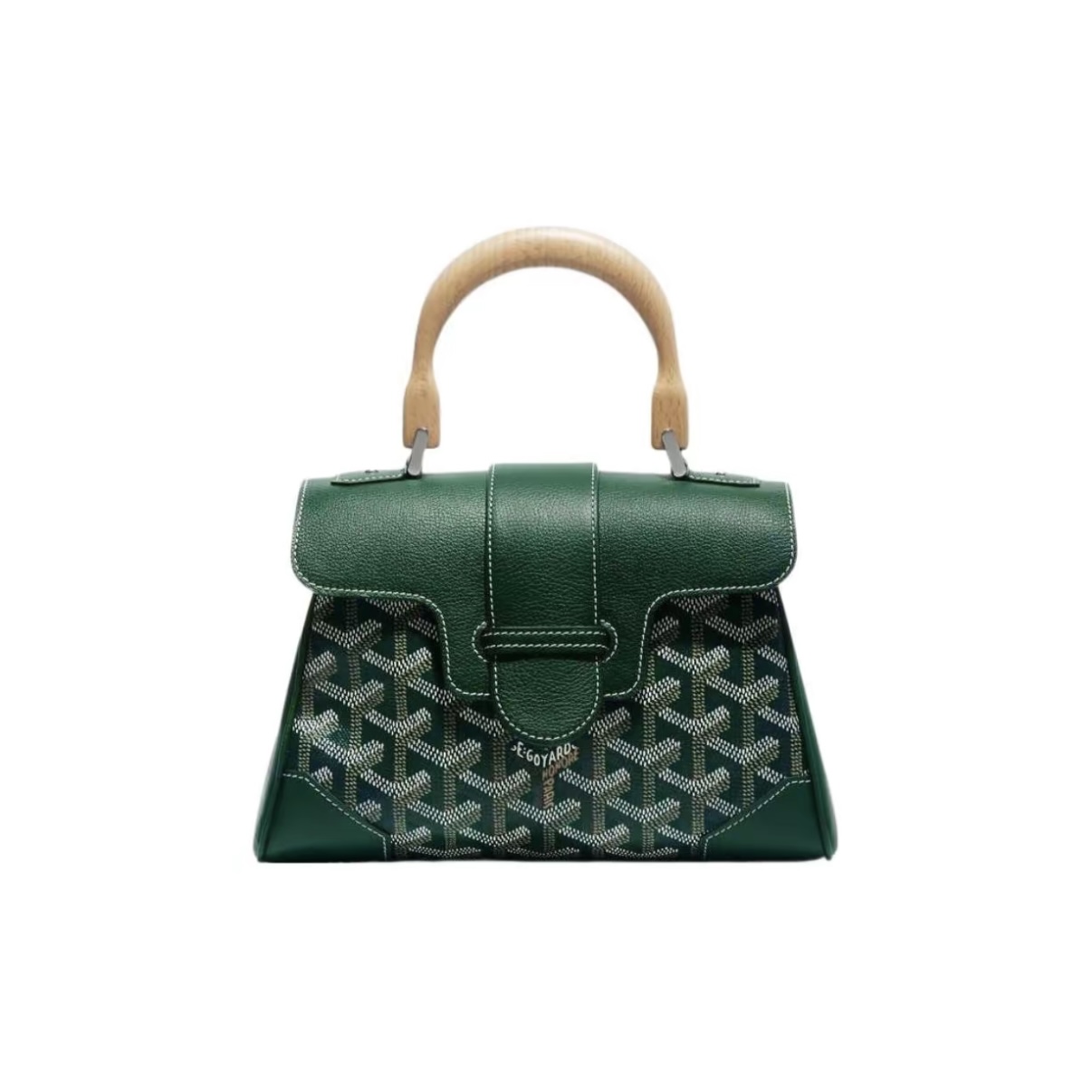 Goyard Saigon mini handbag in Y-pattern canvas, beech wood, and calfskin leather with detachable strap — structured and timeless.