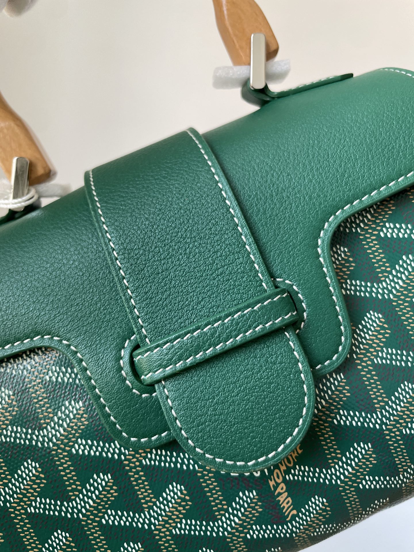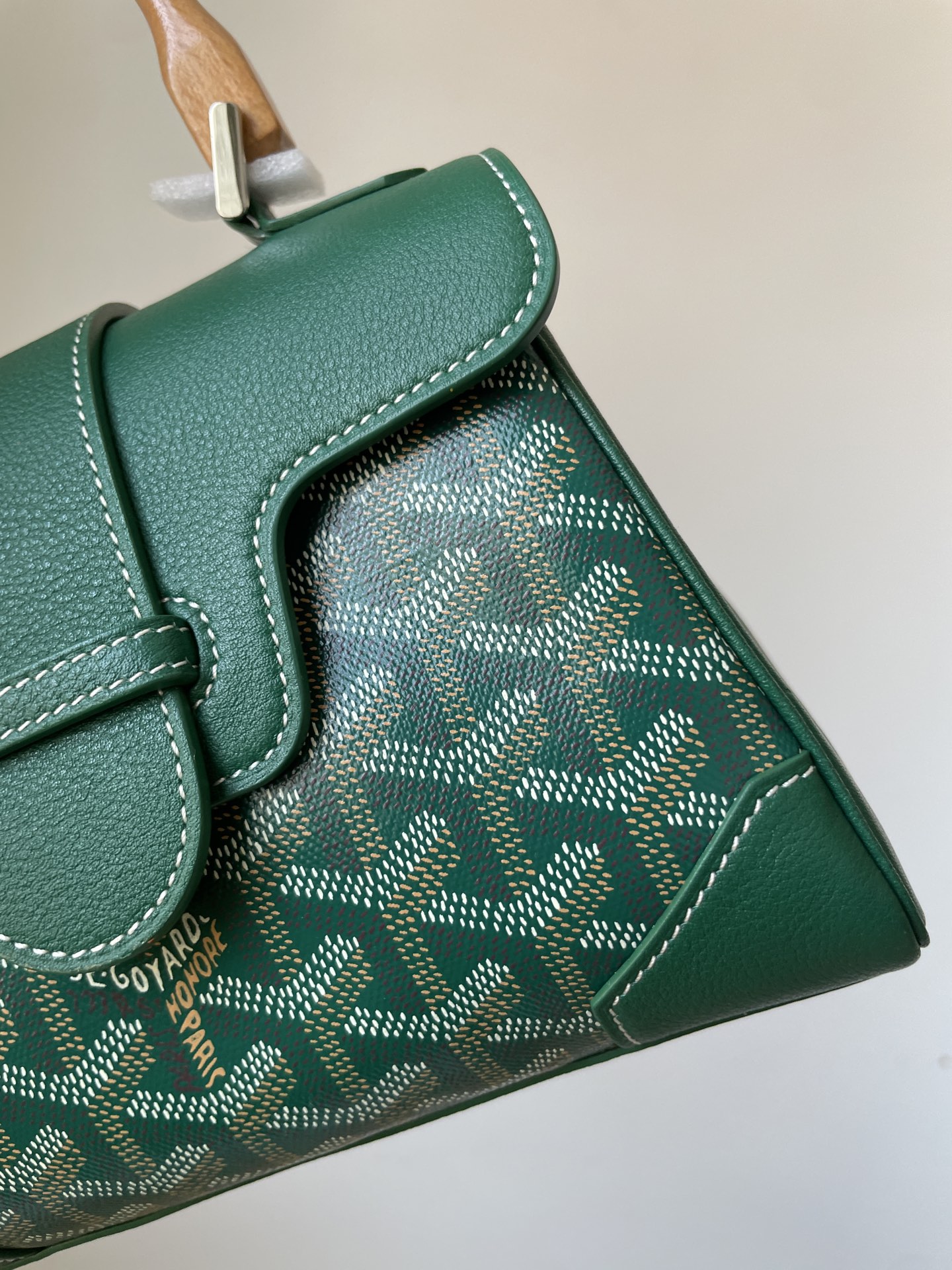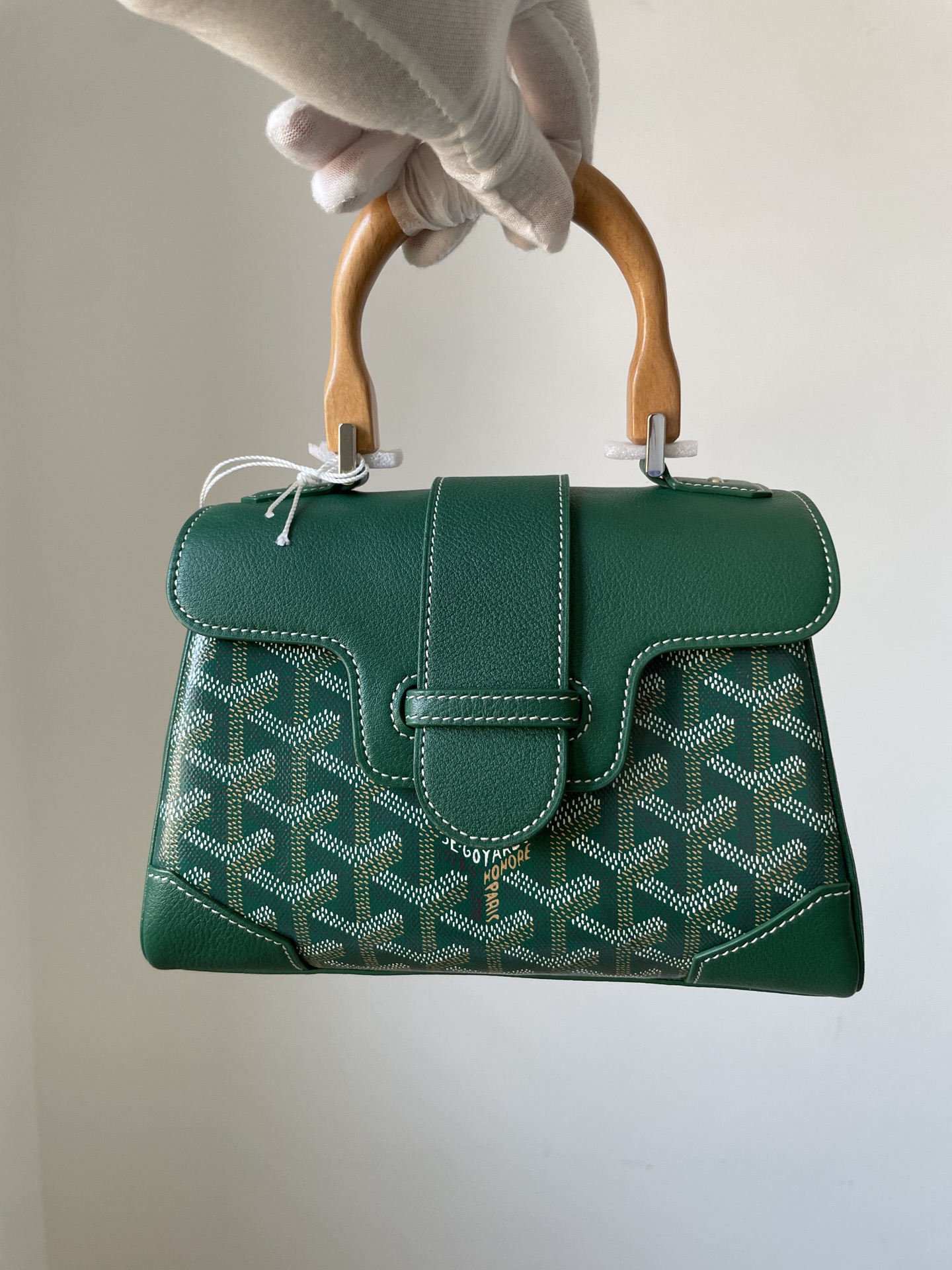 Goyard Saigon mini handbag in Y-pattern canvas, beech wood, and calfskin leather with detachable strap — structured and timeless.