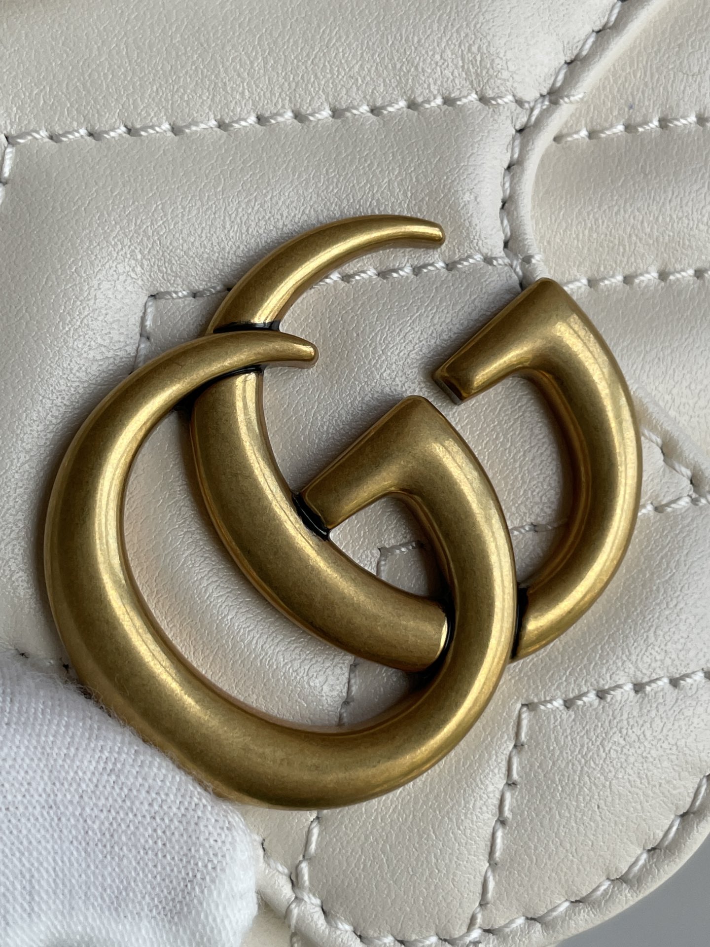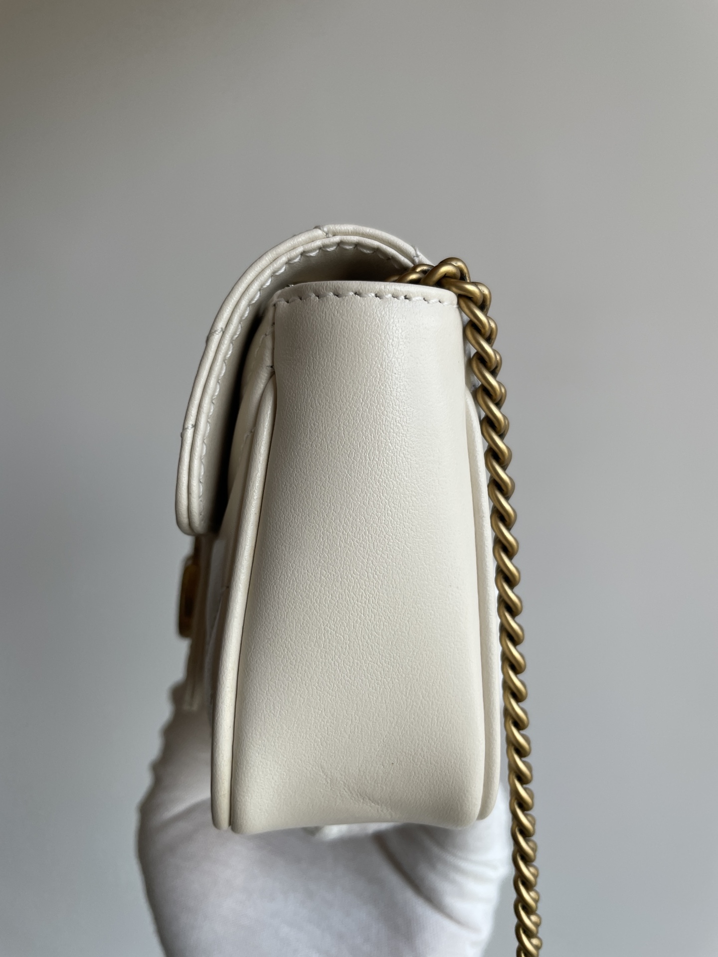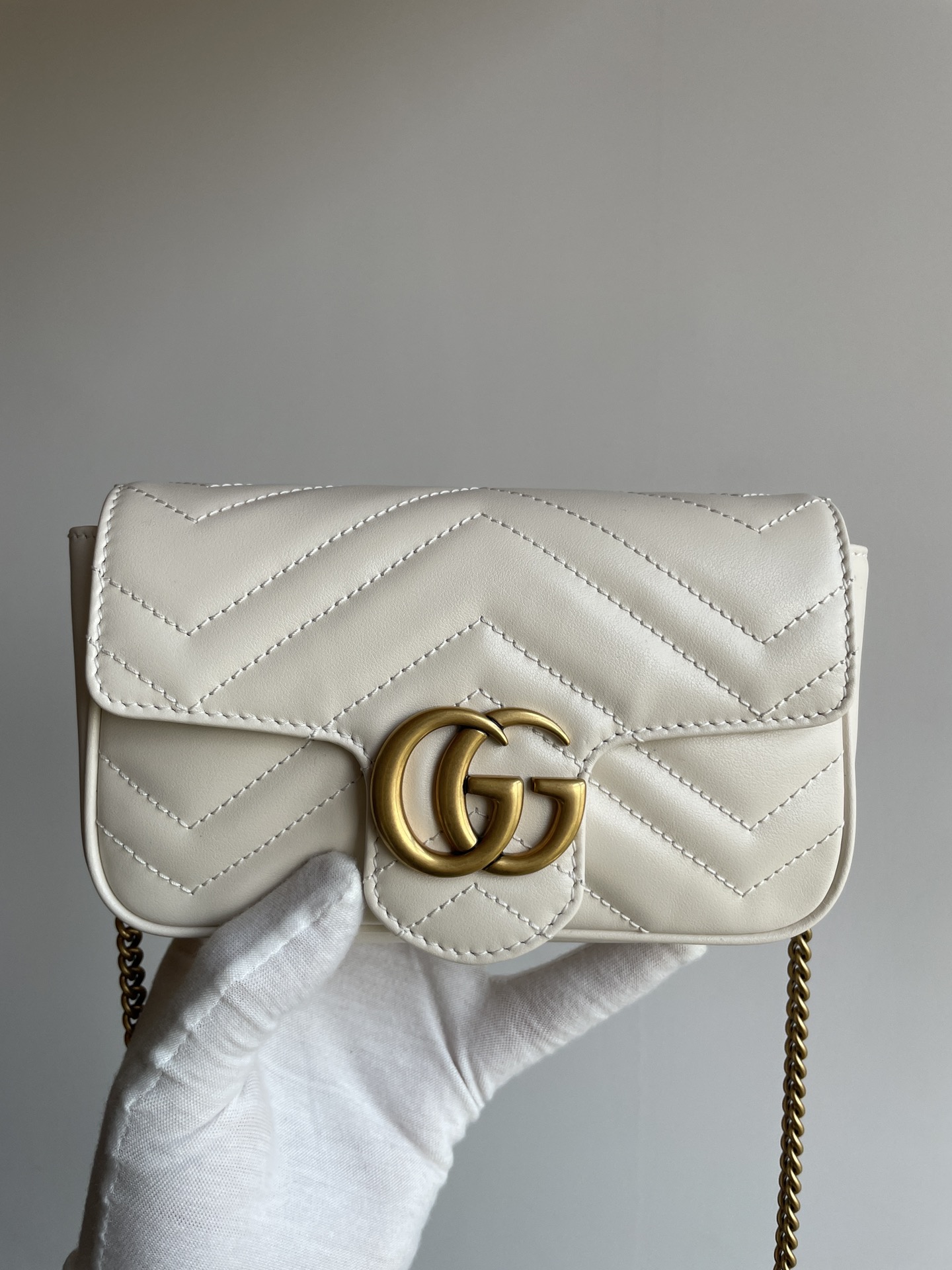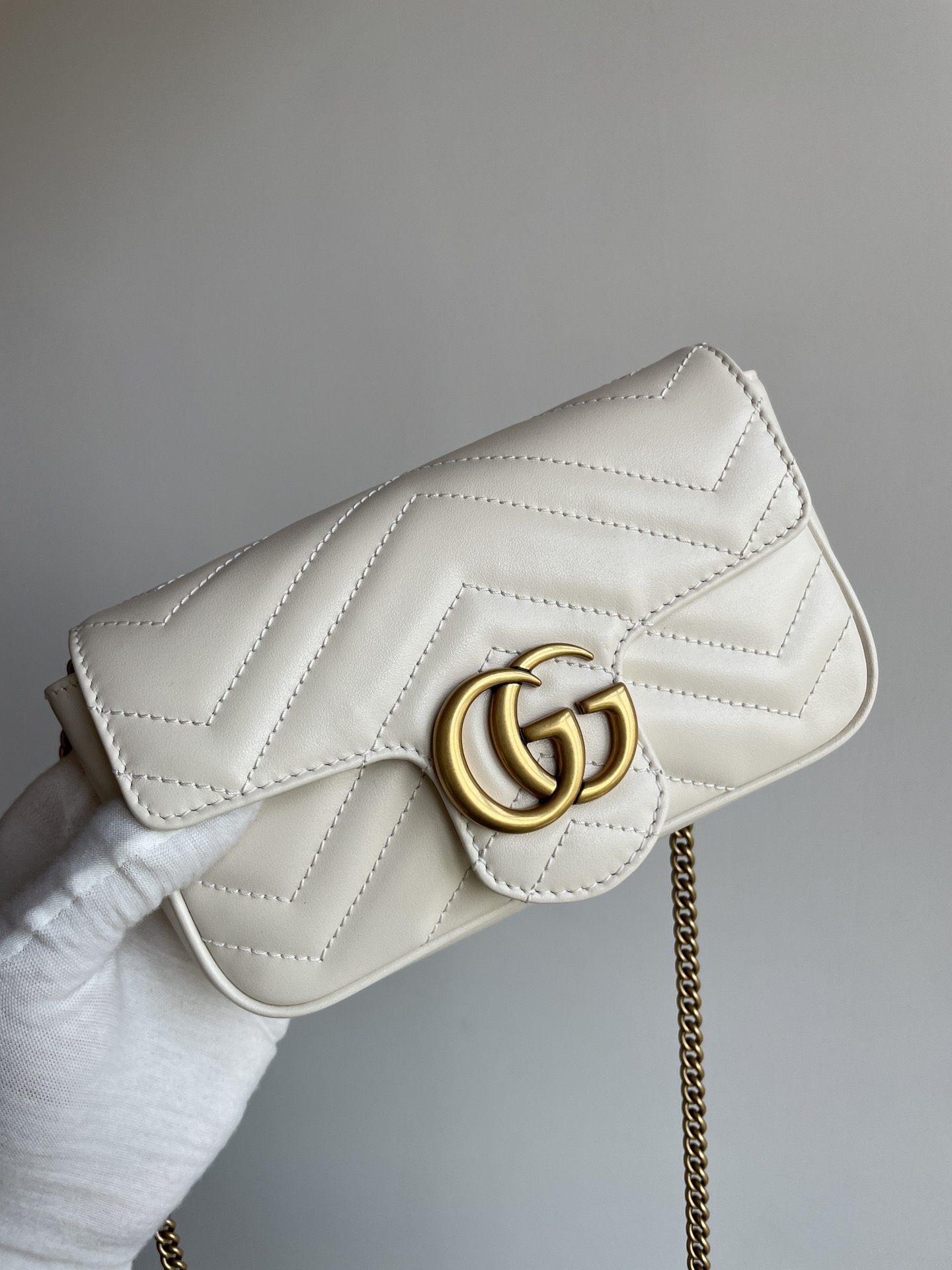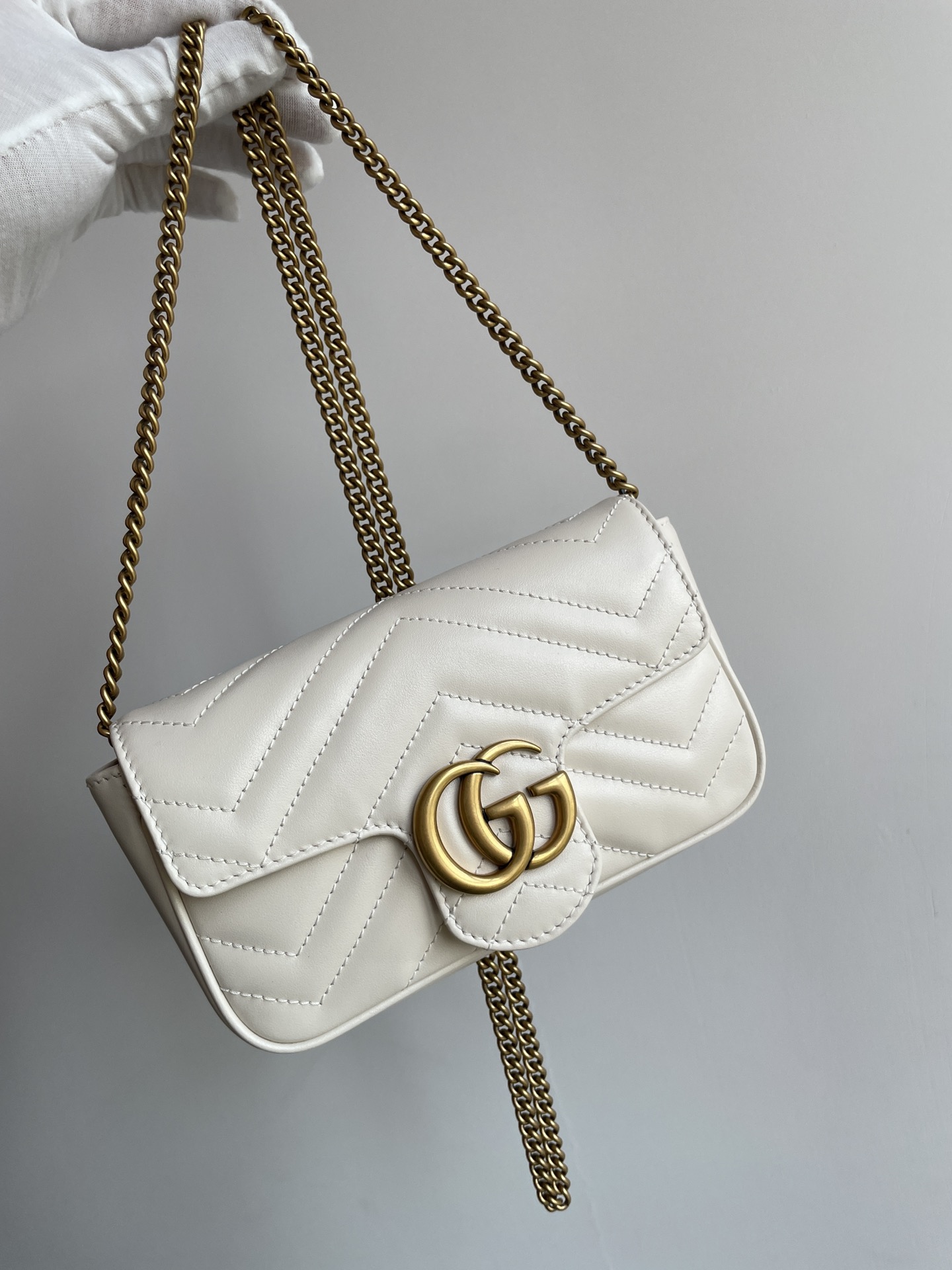 A timeless micro‑silhouette from Gucci, this GG Marmont Super Mini is made of ivory chevron‑quilted leather with aged gold hardware. The flap is finished with the signature Double G, and the interior features a soft microfiber lining. Wear crossbody with the antique‑gold chain. Compact yet functional for cards, keys and lipstick.