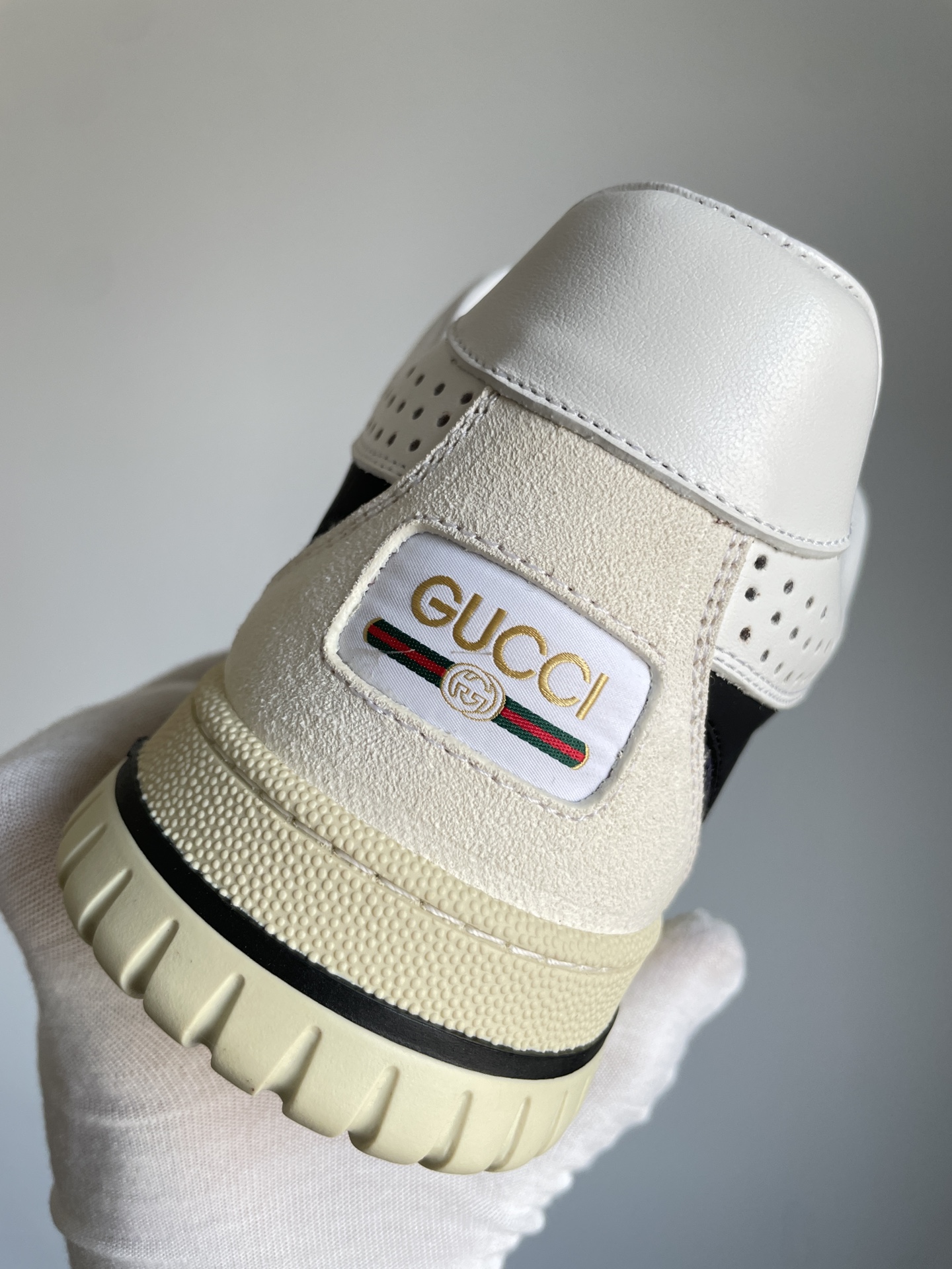 Trendy beige Gucci sneakers featuring iconic Screener vintage design.
