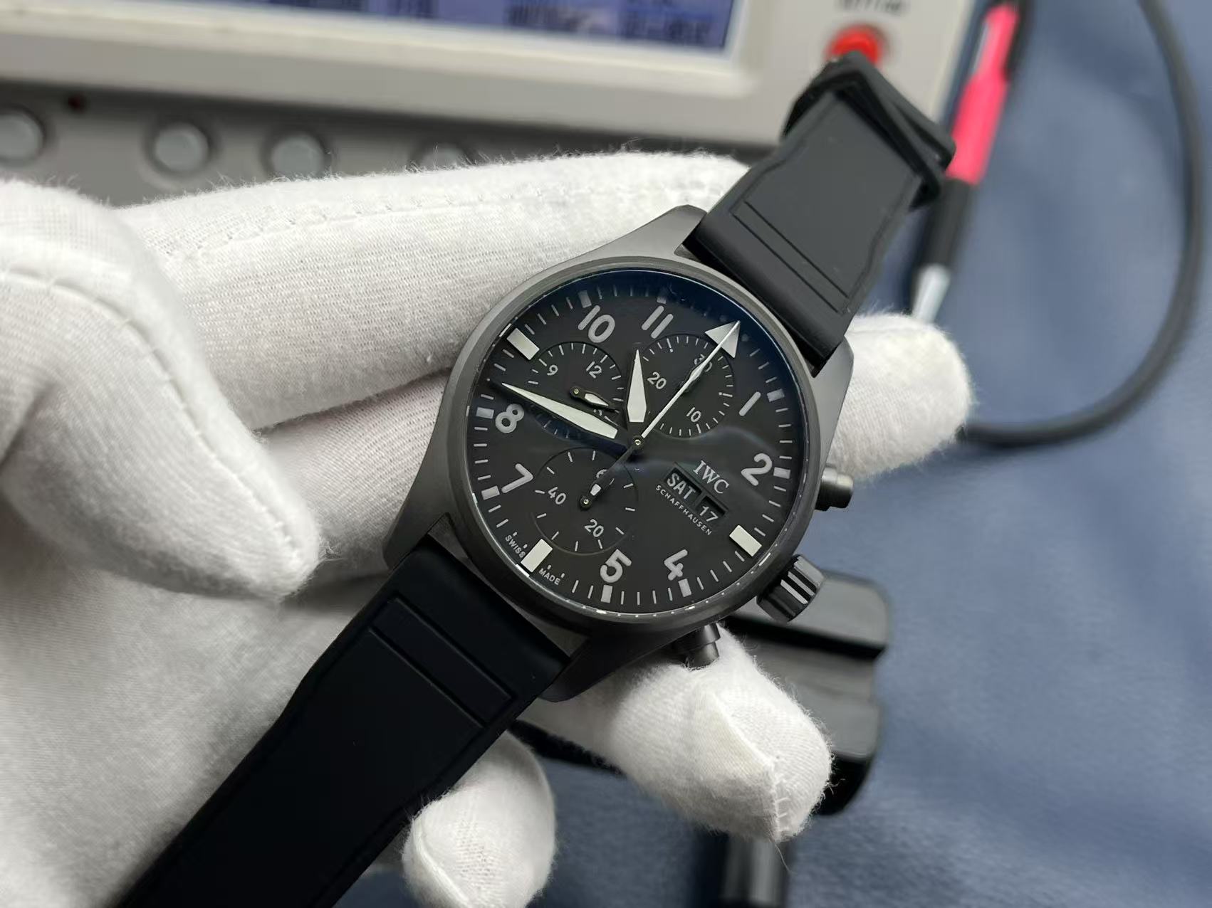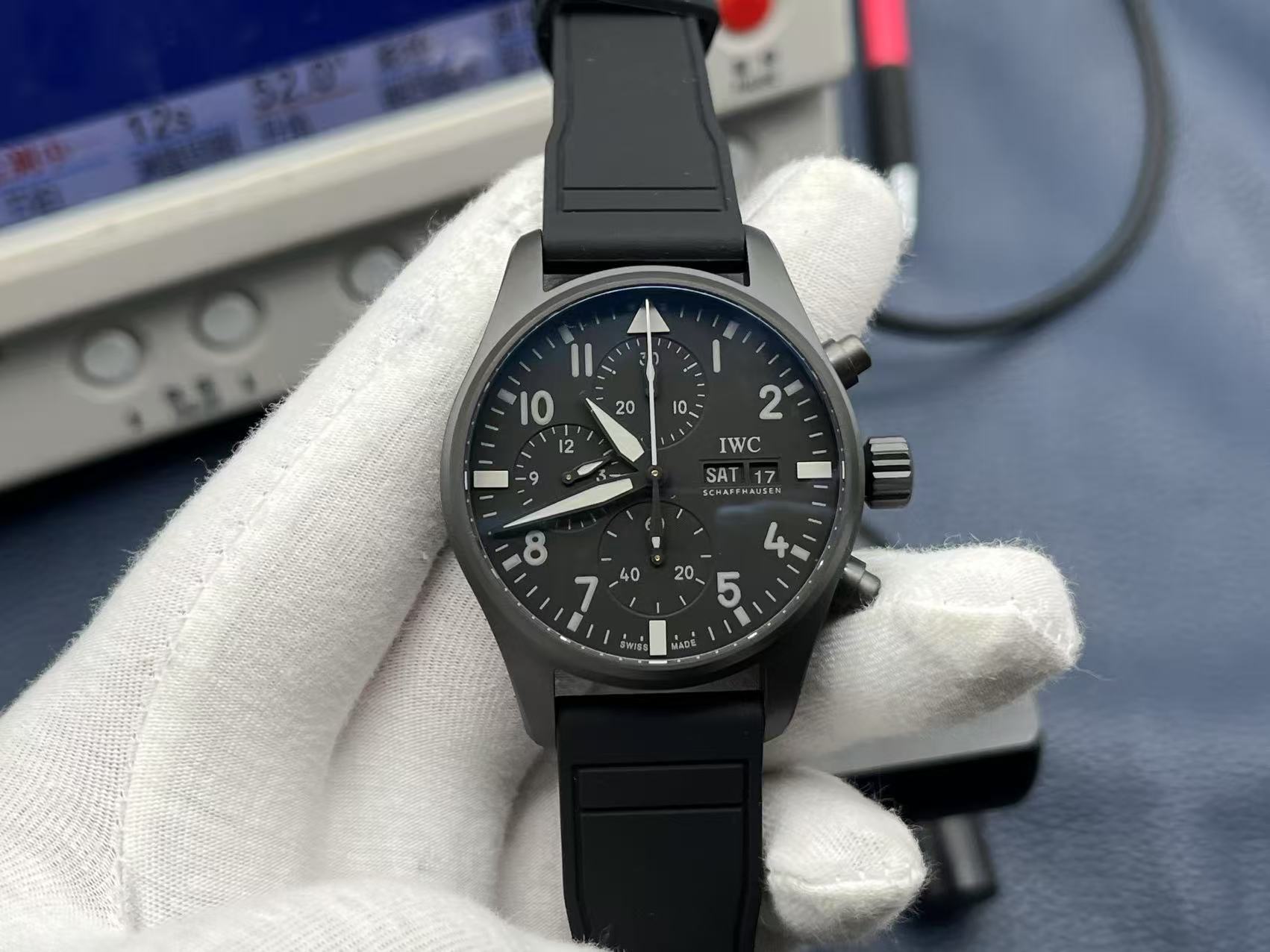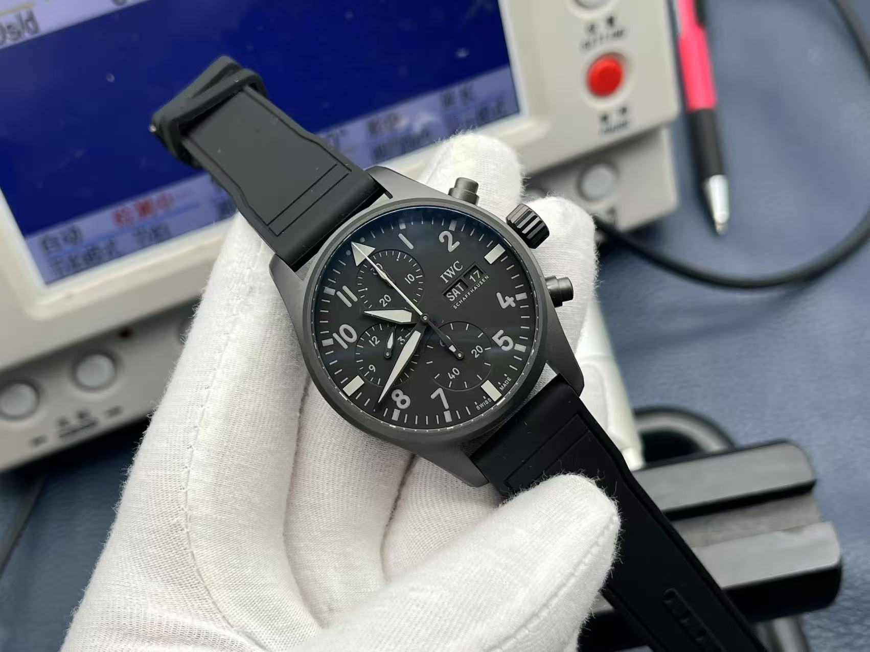41mm IWC Pilot’s Chronograph with Asia 7750 movement, ceramic bezel, and transparent caseback.