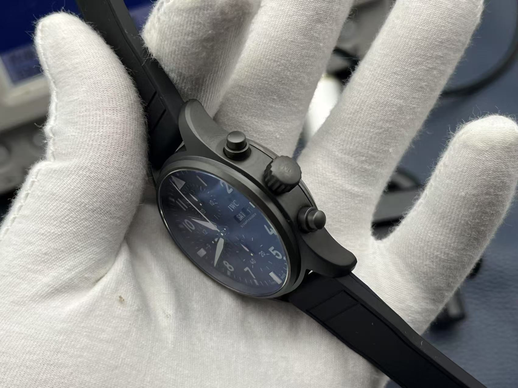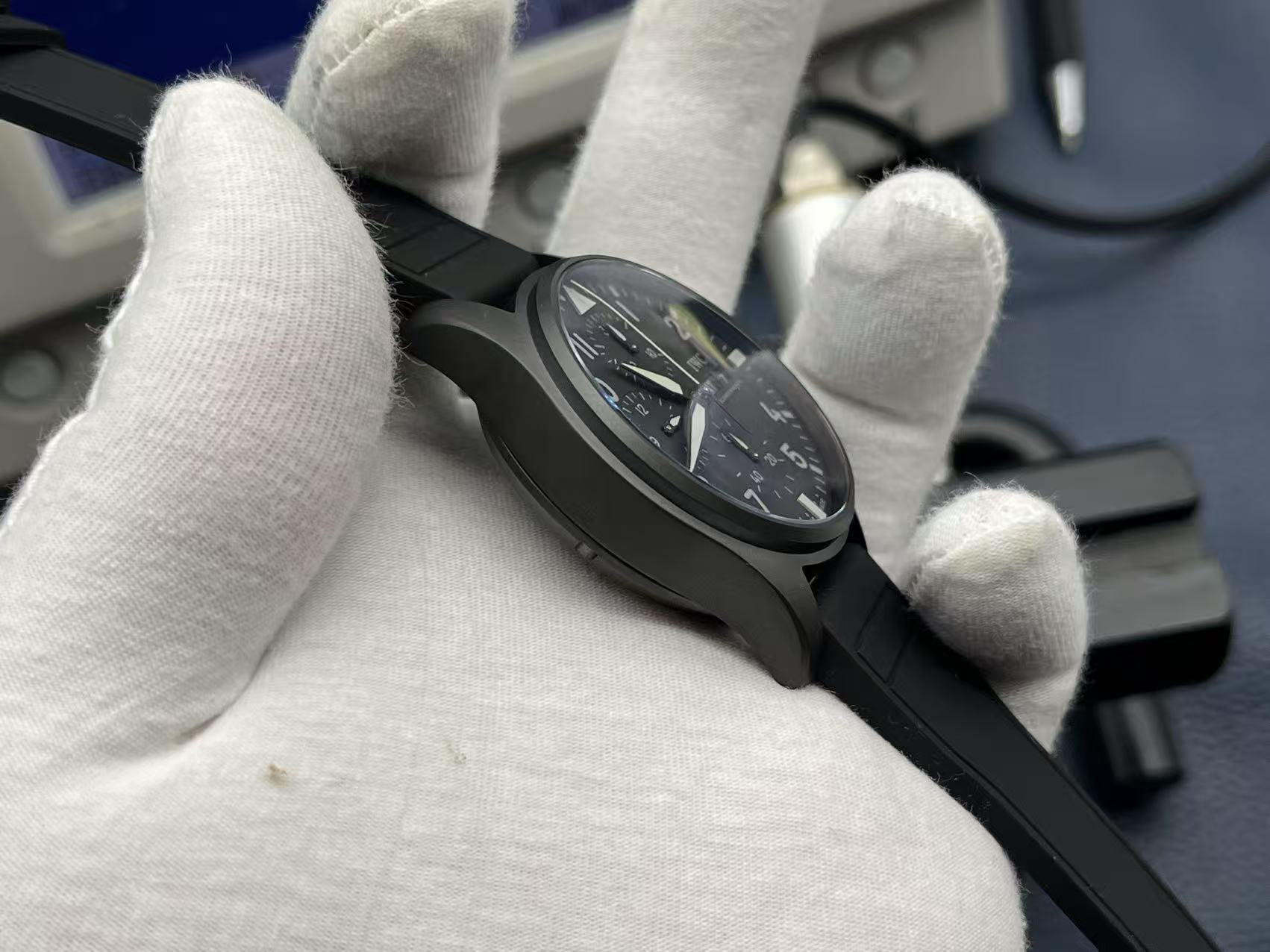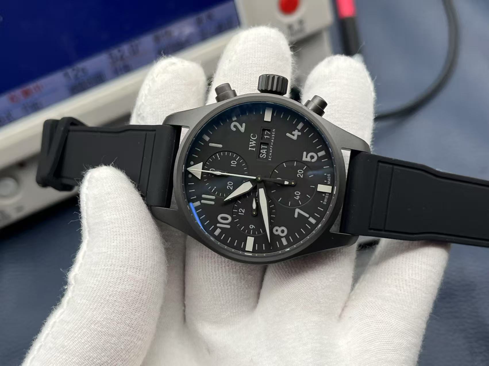 41mm IWC Pilot’s Chronograph with Asia 7750 movement, ceramic bezel, and transparent caseback.