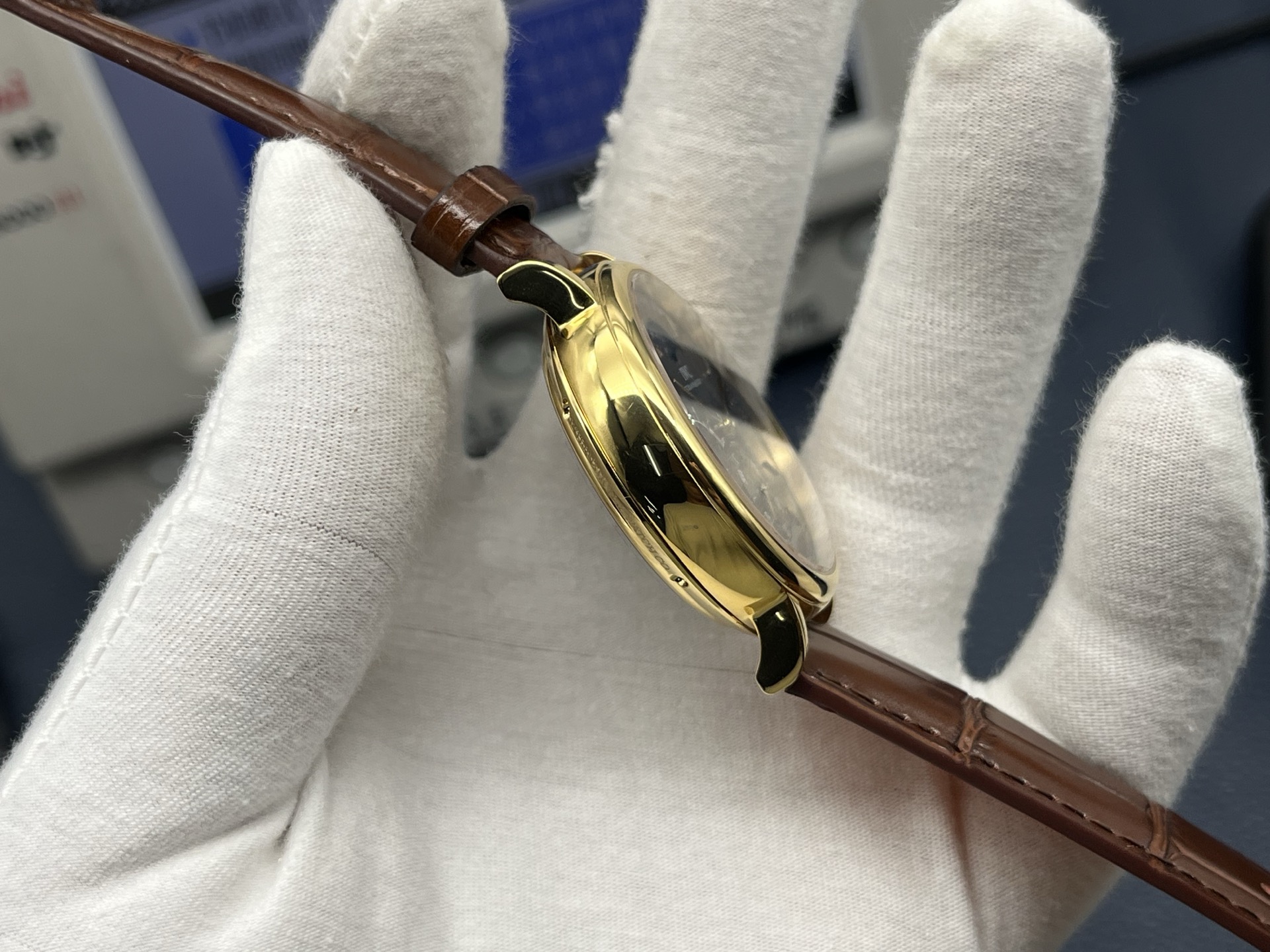 **Case & Dial:** 18K red gold, 45mm. Grey dial with applied Roman numerals, leaf hands, moonphase at 12, date at 3.