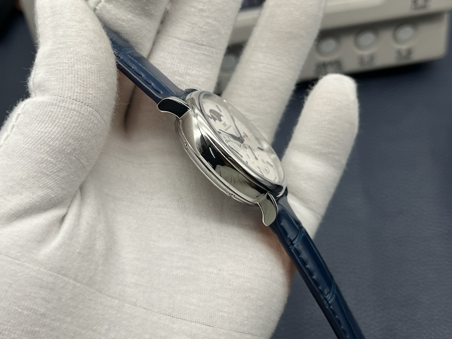 **Case & Dial:** 18K red gold 45mm case, white dial with moonphase at 12, power reserve at 9, date at 3.