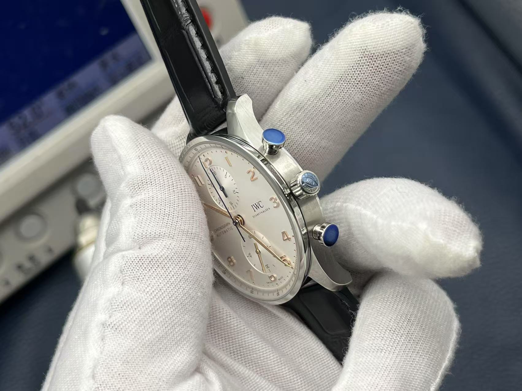 IWC Portuguese Chronograph 41mm White Dial Stainless Steel Case Leather Strap — a refined automatic watch blending IWC tradition with modern elegance.