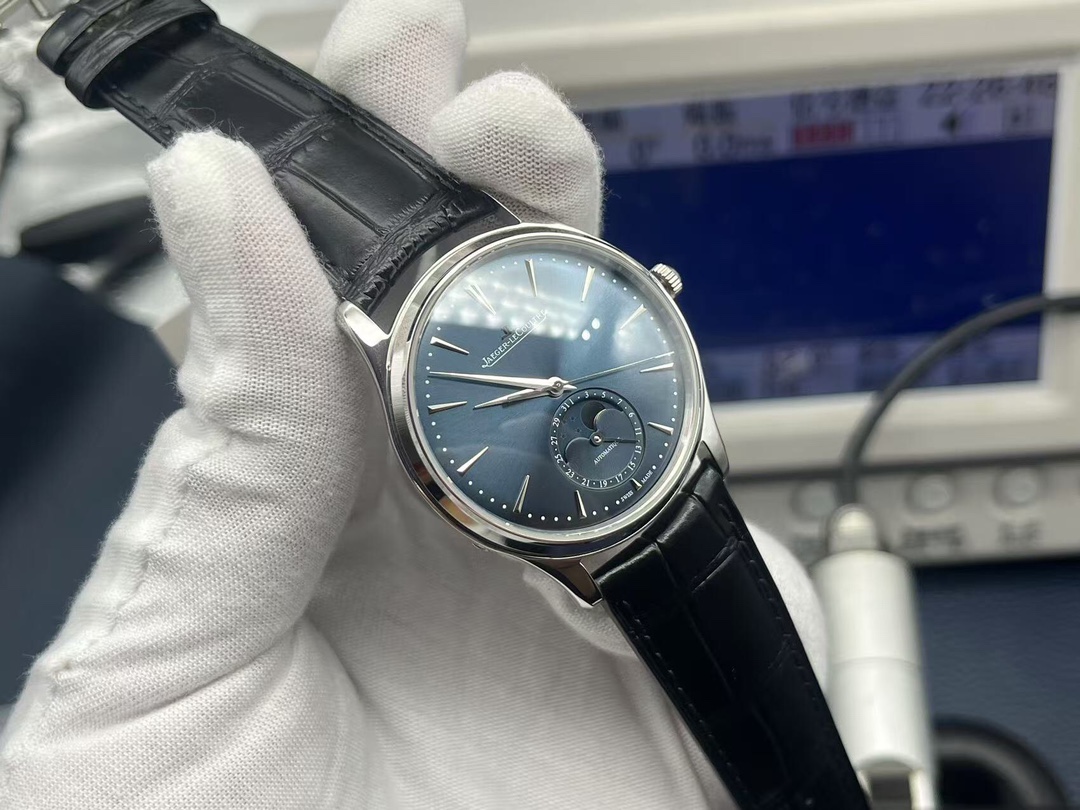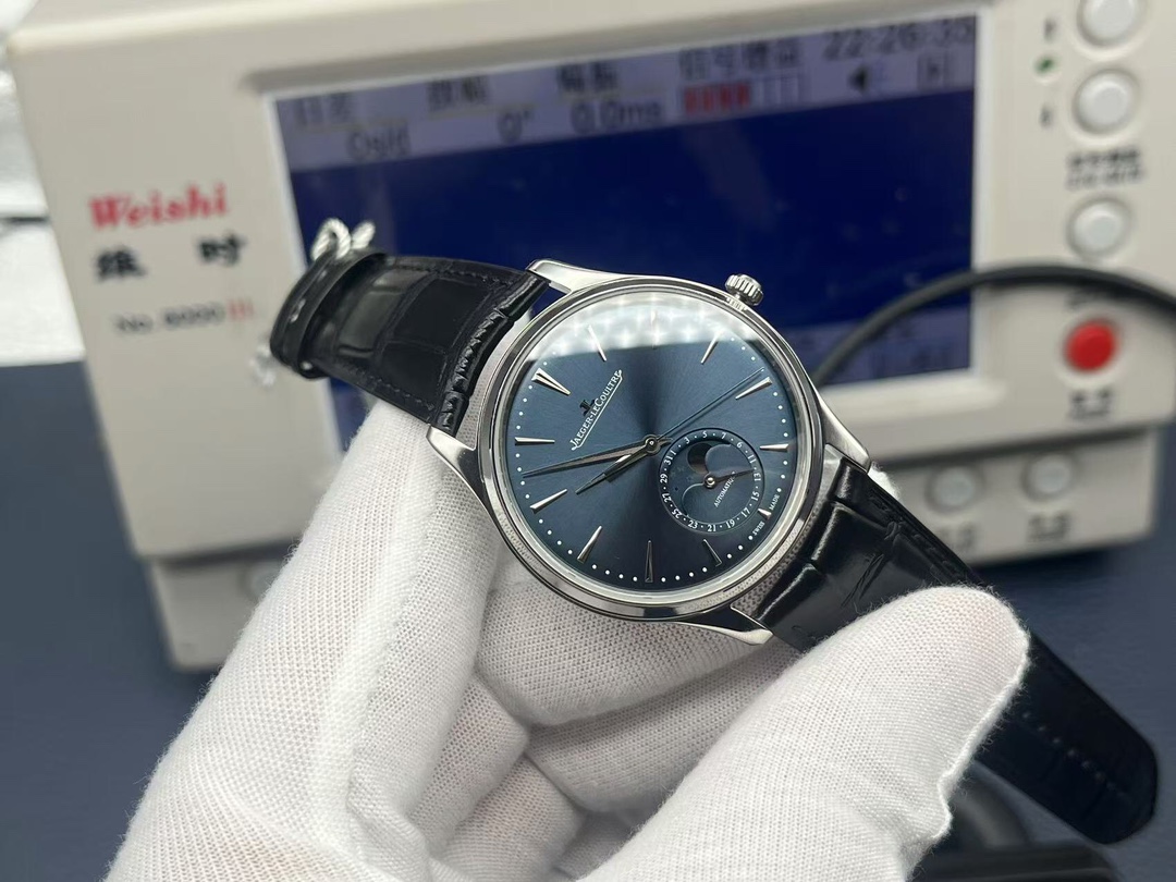 A refined 39mm Jaeger-LeCoultre Master with Calibre 925 movement, blue dial, moon phase and date indicators, stainless steel case, and premium alligator strap.