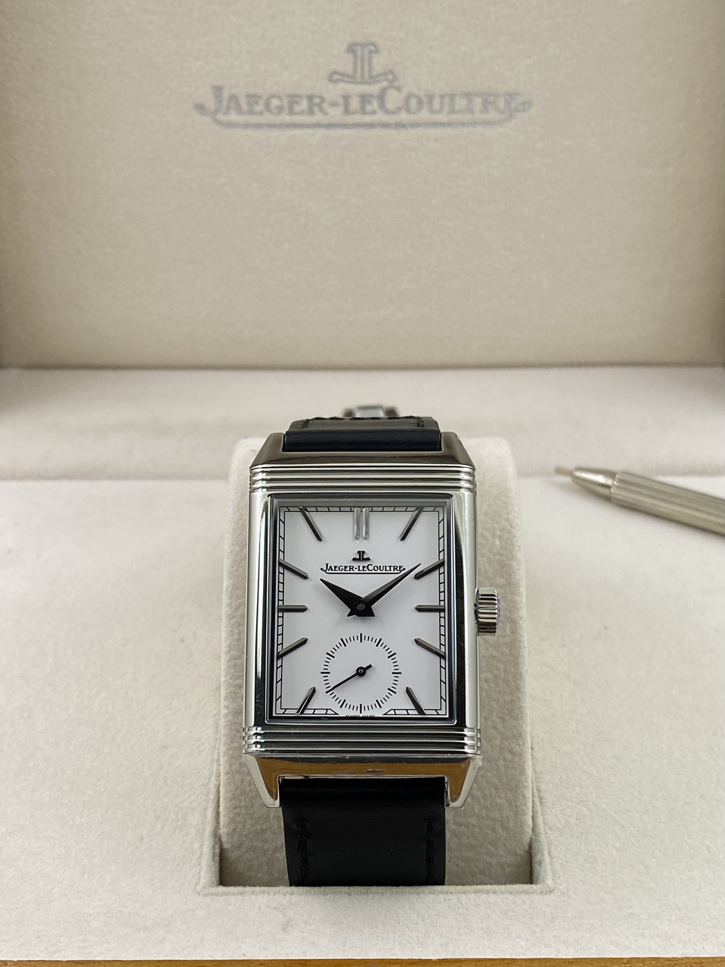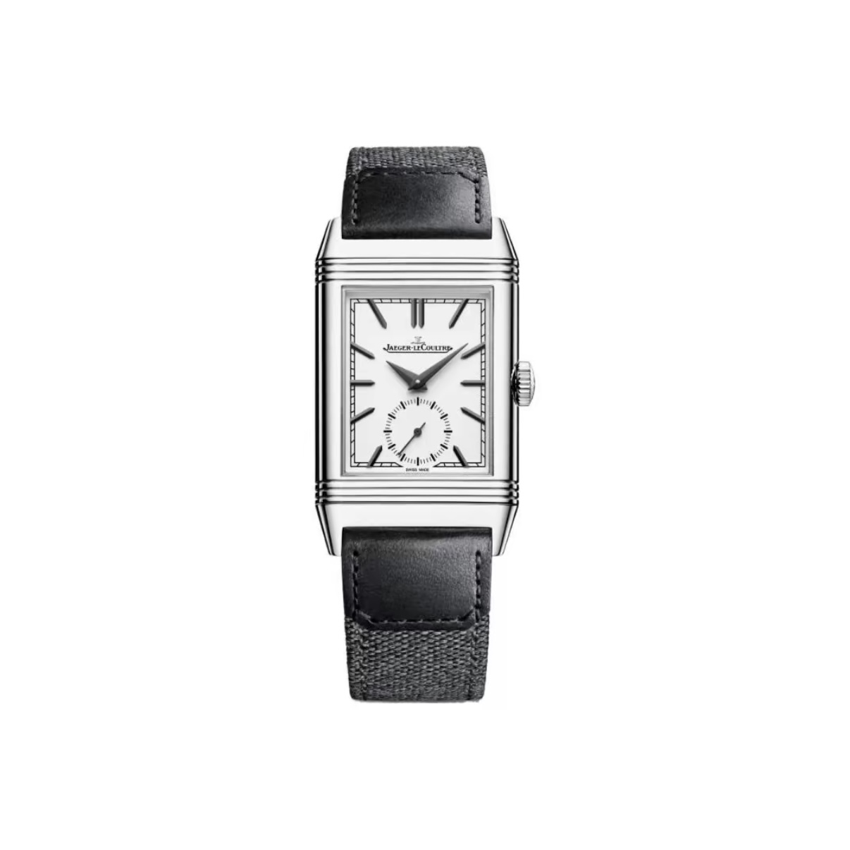 A timeless rectangular Jaeger-LeCoultre Reverso with hand-wound movement, silver dial, small seconds, and reversible steel case.