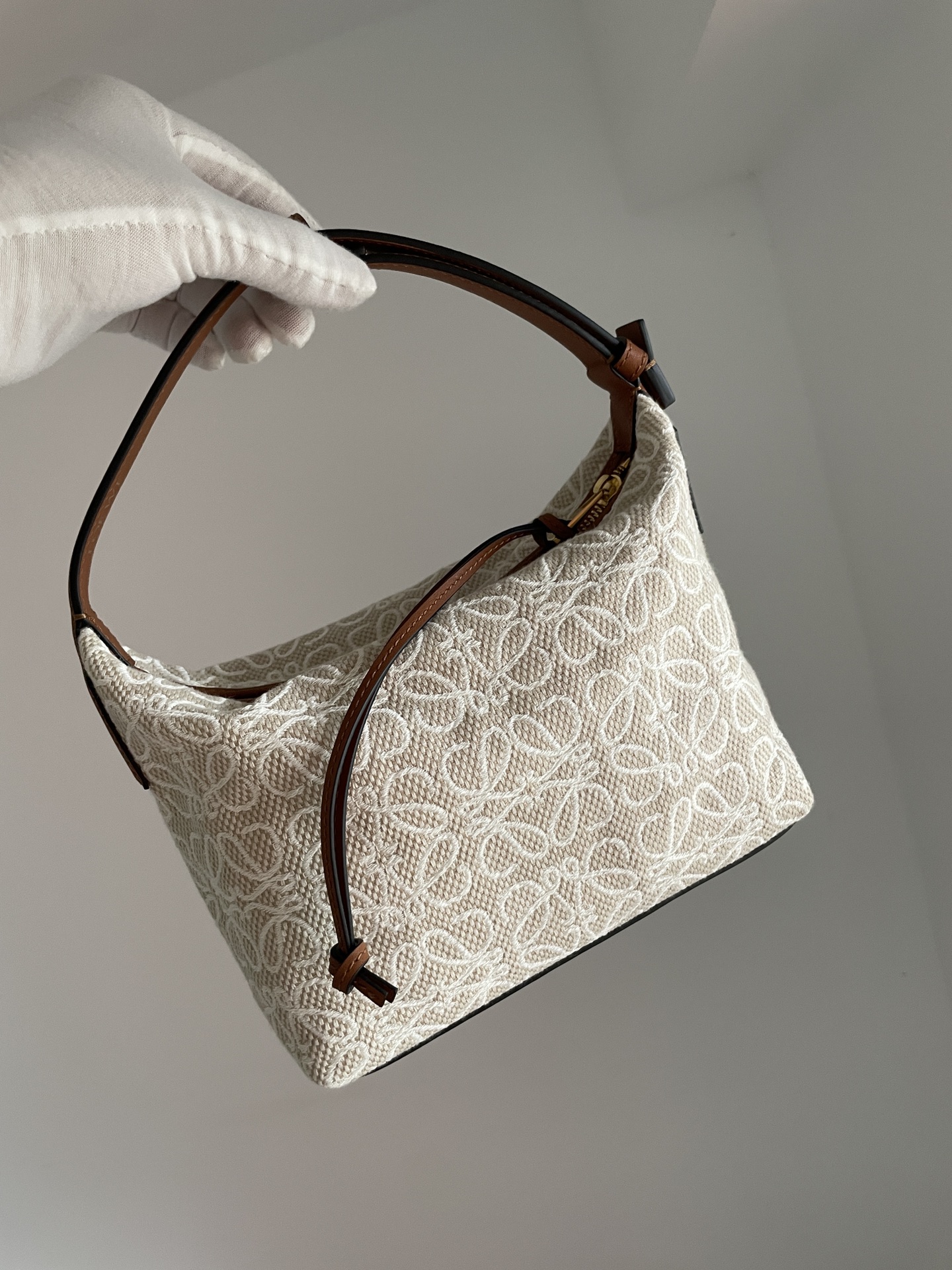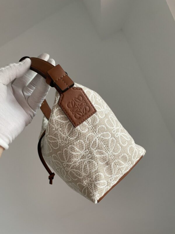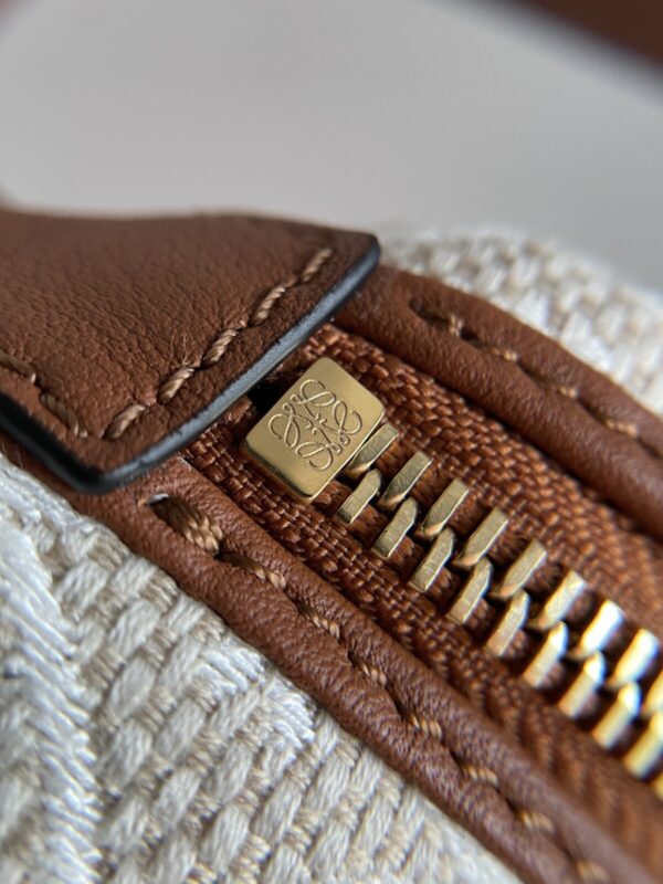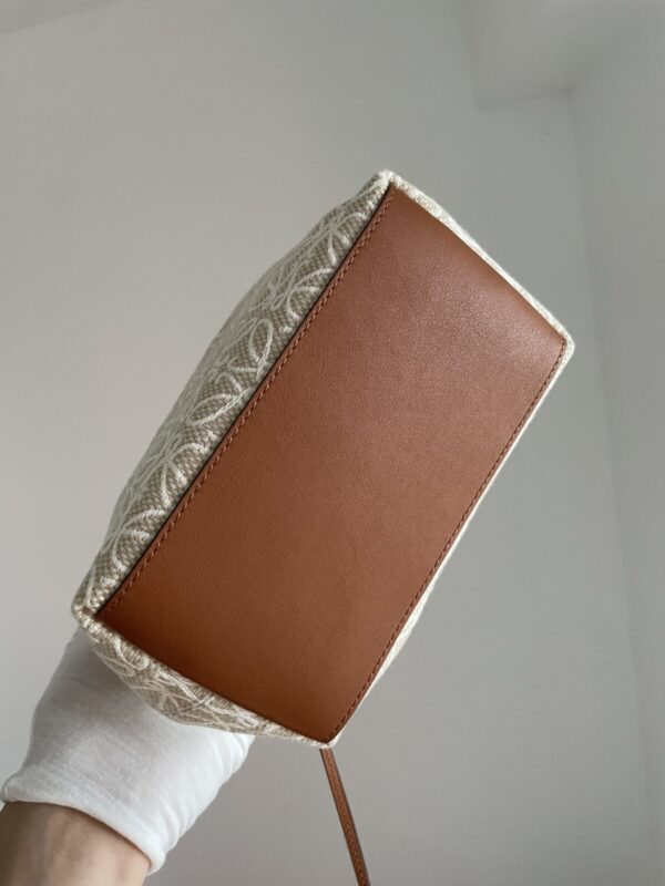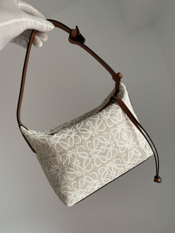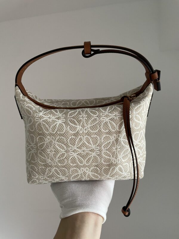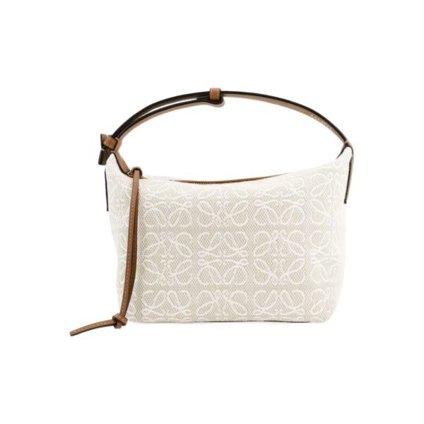 LOEWE Cubi Anagram Small Bag combines jacquard fabric with calfskin trim and zip closure. Dimensions: 20.5×12.5×17cm.
