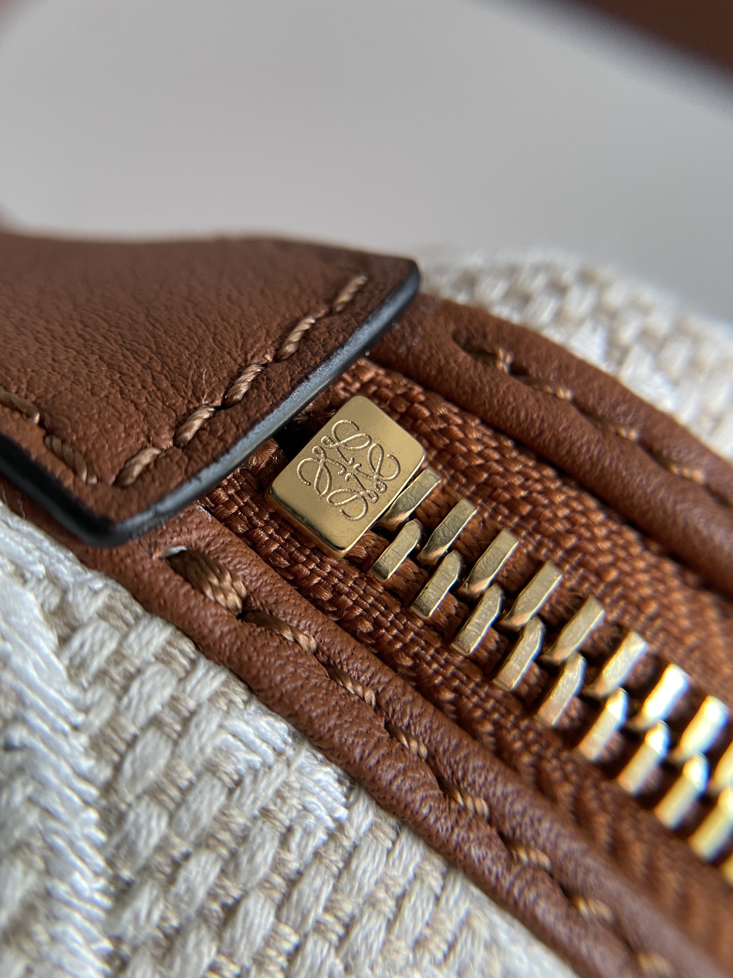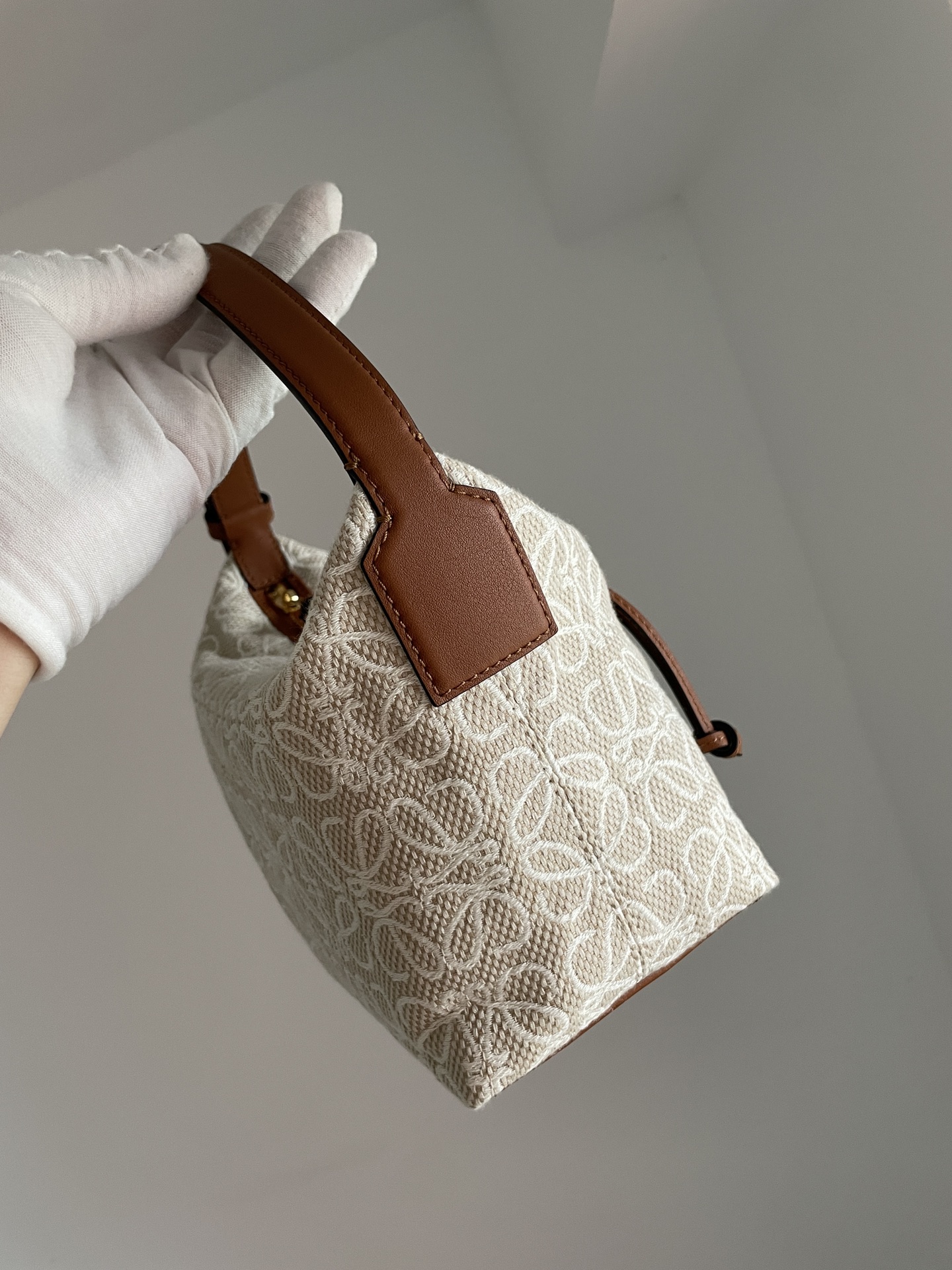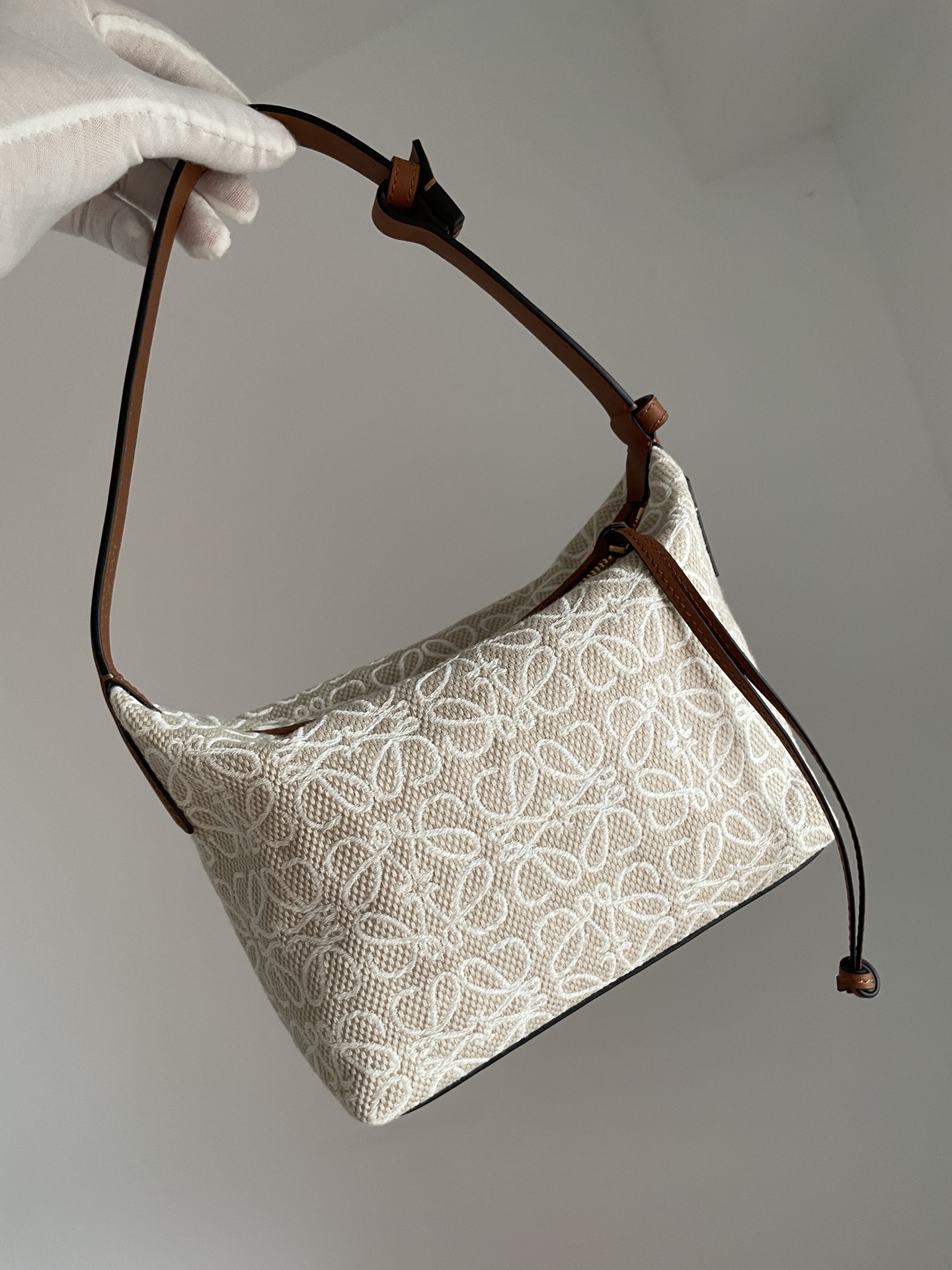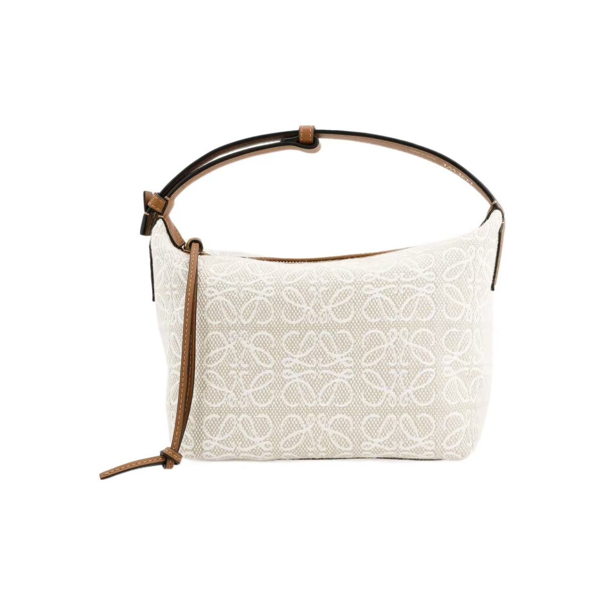 LOEWE Cubi Anagram Small Shoulder Tote Bag in Jacquard Fabric and Calfskin – Off-White & Tan