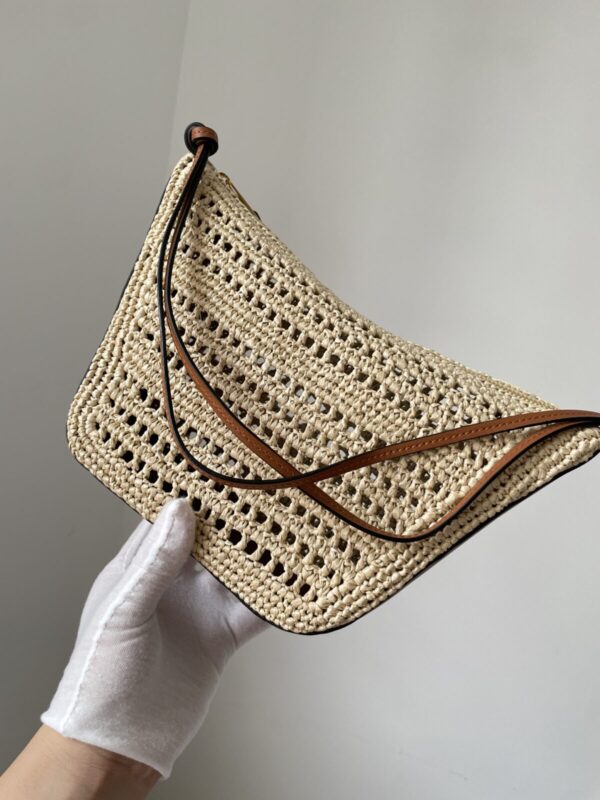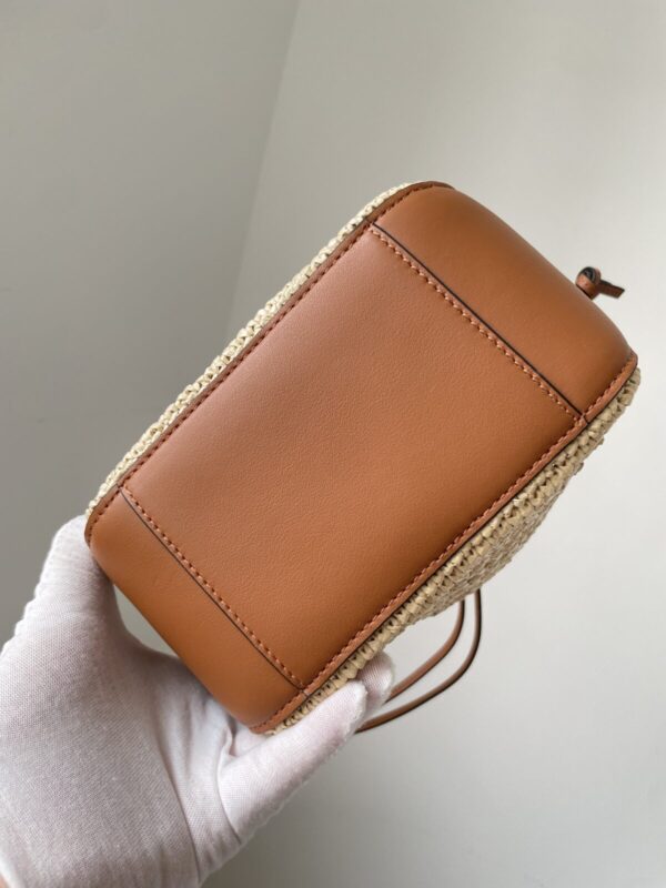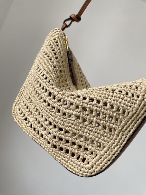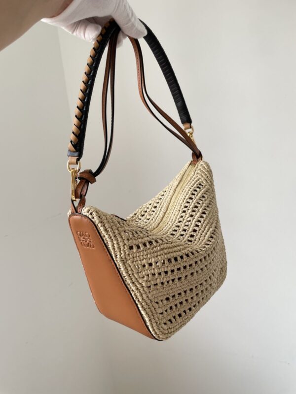 LOEWE Hammock Mini Bag crafted from raffia and calfskin with adjustable strap and zip closure. Dimensions: 28×9.5×17cm.