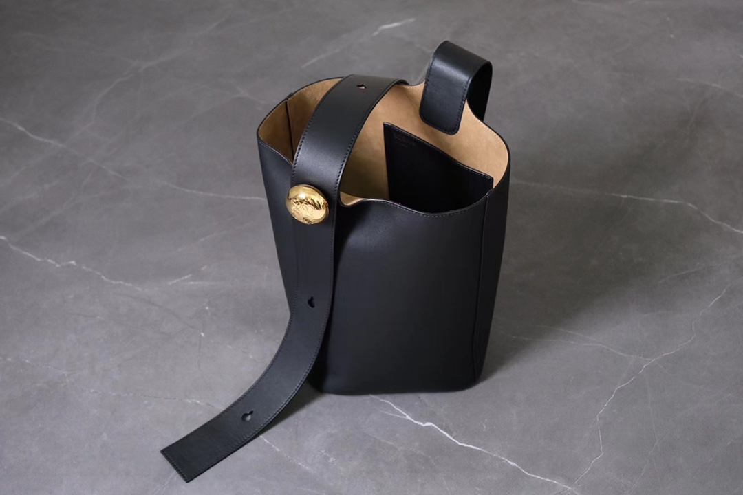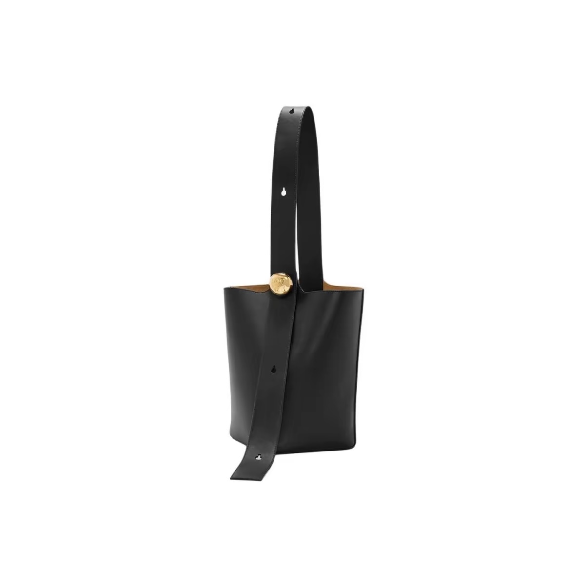 The LOEWE Pebble Bucket Bag crafted from black calfskin leather featuring engraved Anagram hardware and adjustable shoulder strap. Dimensions: 24.5×23.5×28cm.