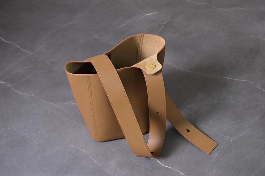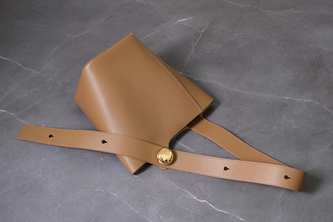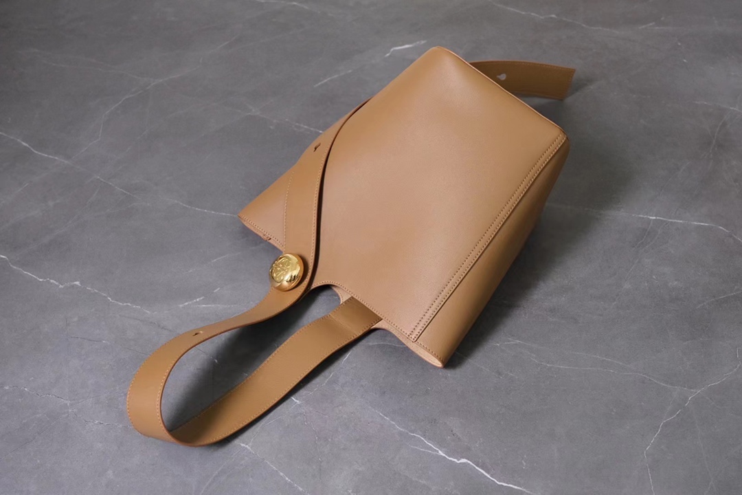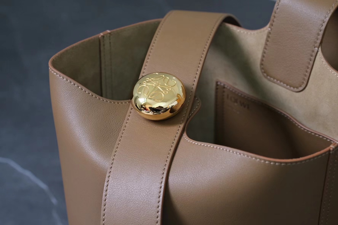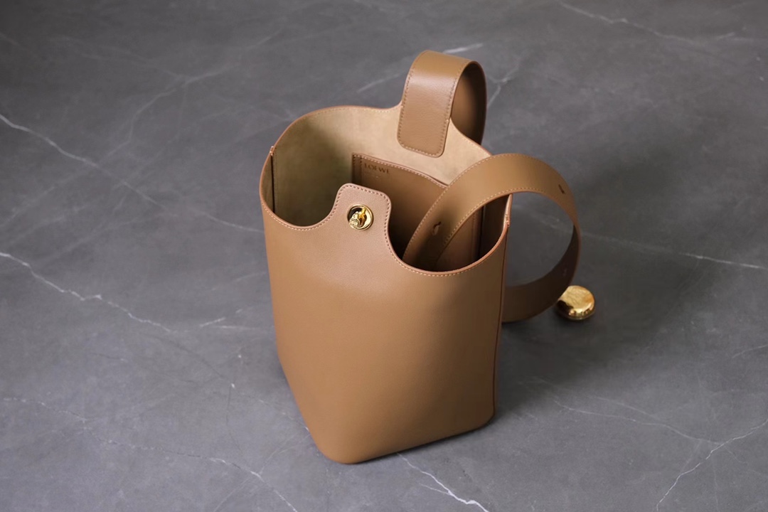 The LOEWE Pebble Bucket Bag made from oak brown calfskin leather featuring signature hardware and spacious interior. Dimensions: 24.5×23.5×28cm.