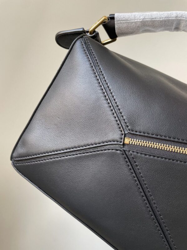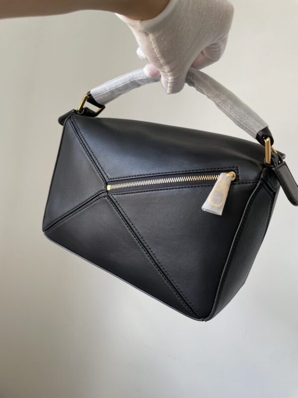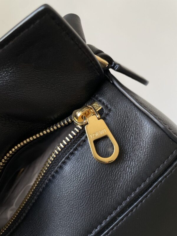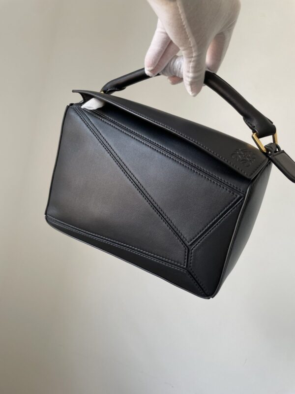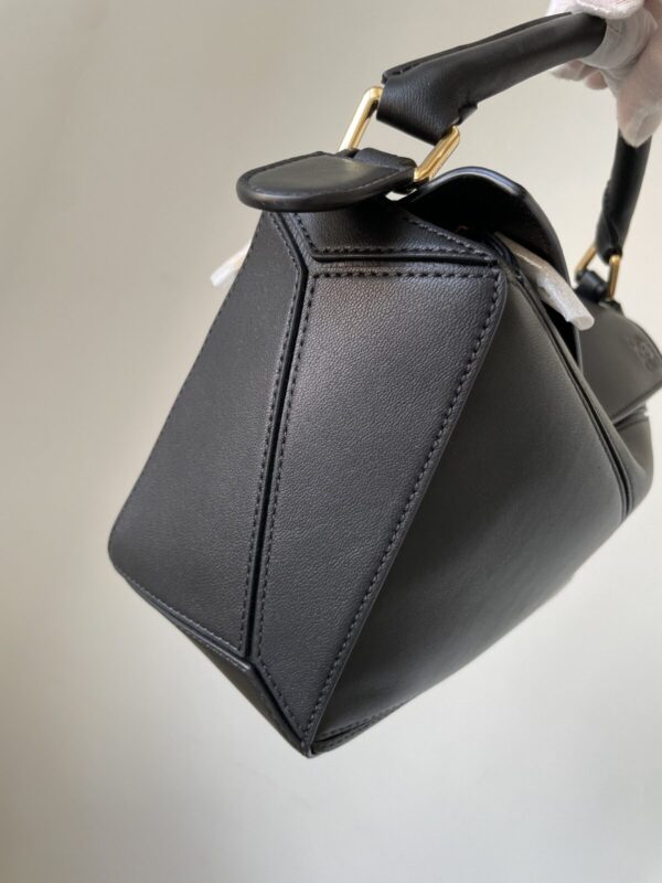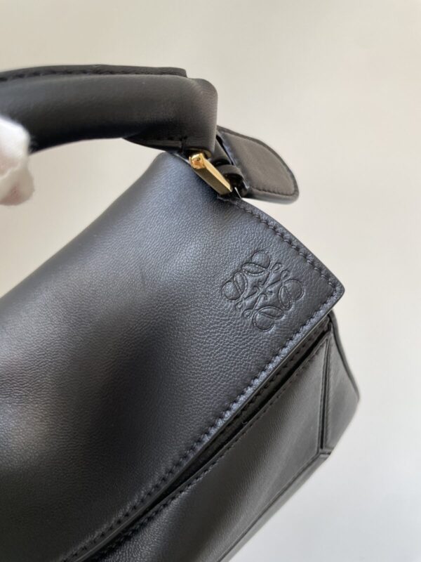 LOEWE Puzzle Small Bag in black calfskin leather featuring adjustable strap and zip closure. Dimensions: 24×10.5×16.5cm.