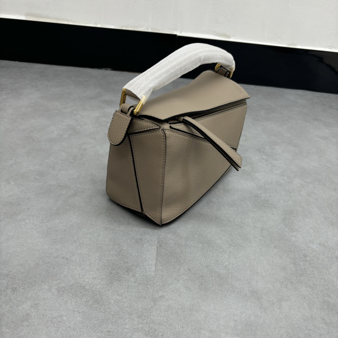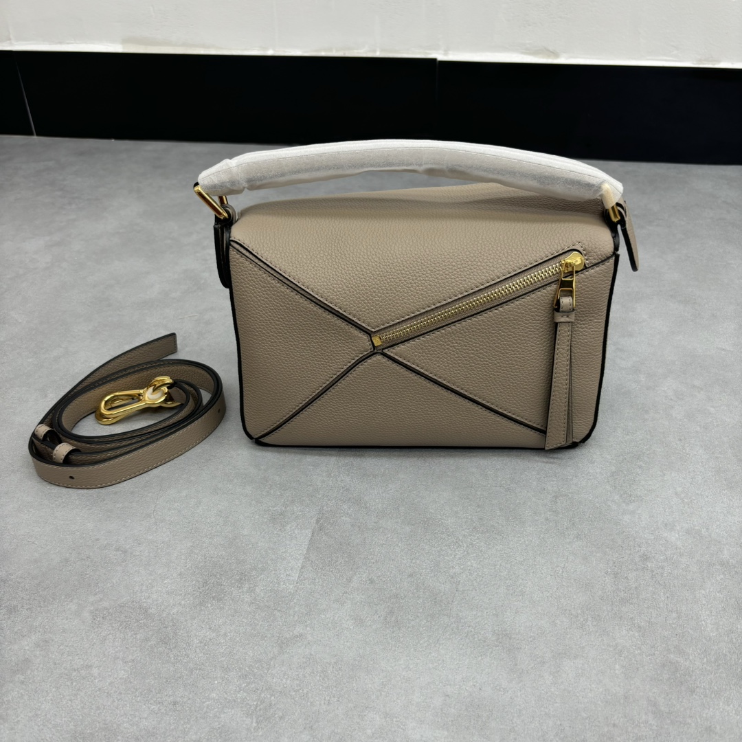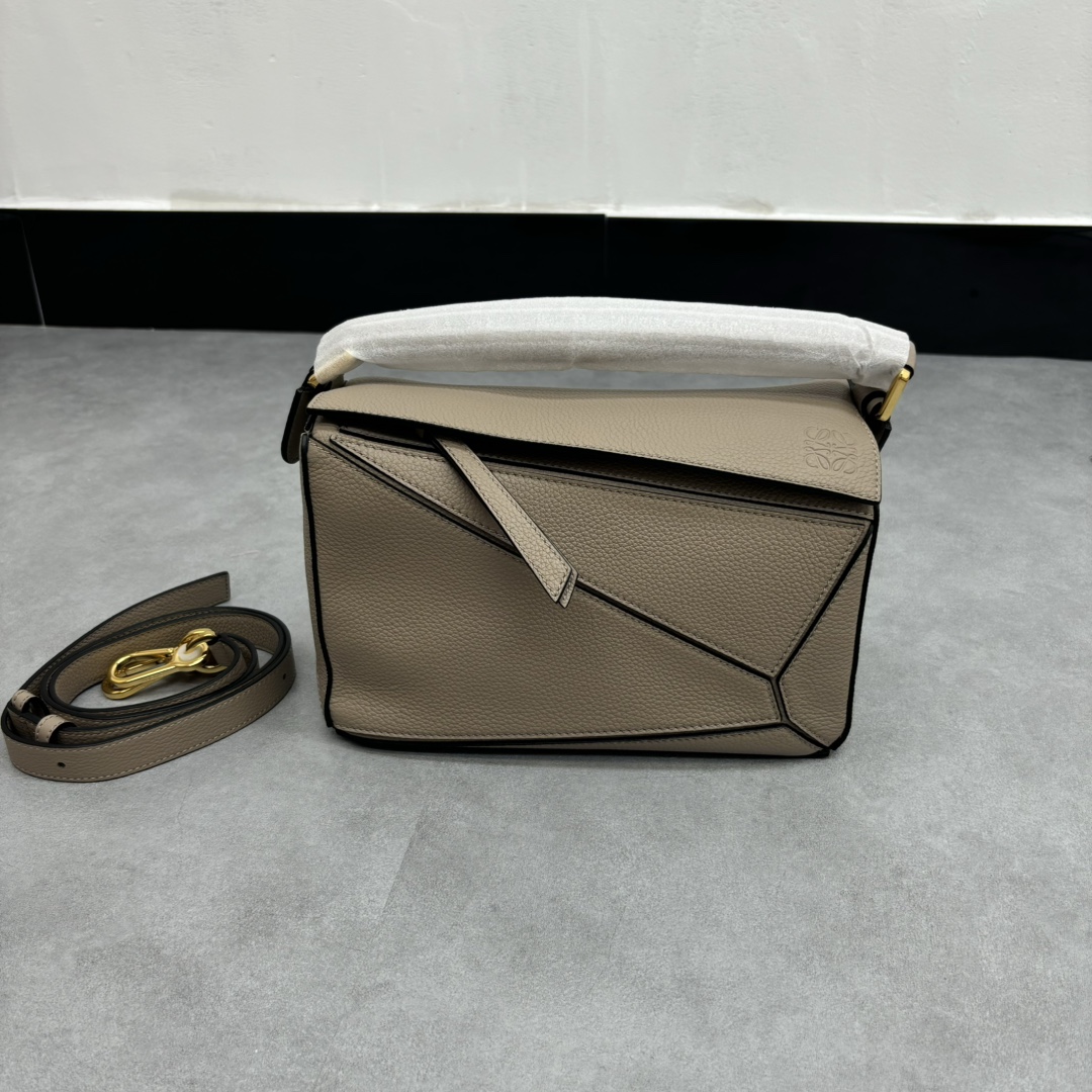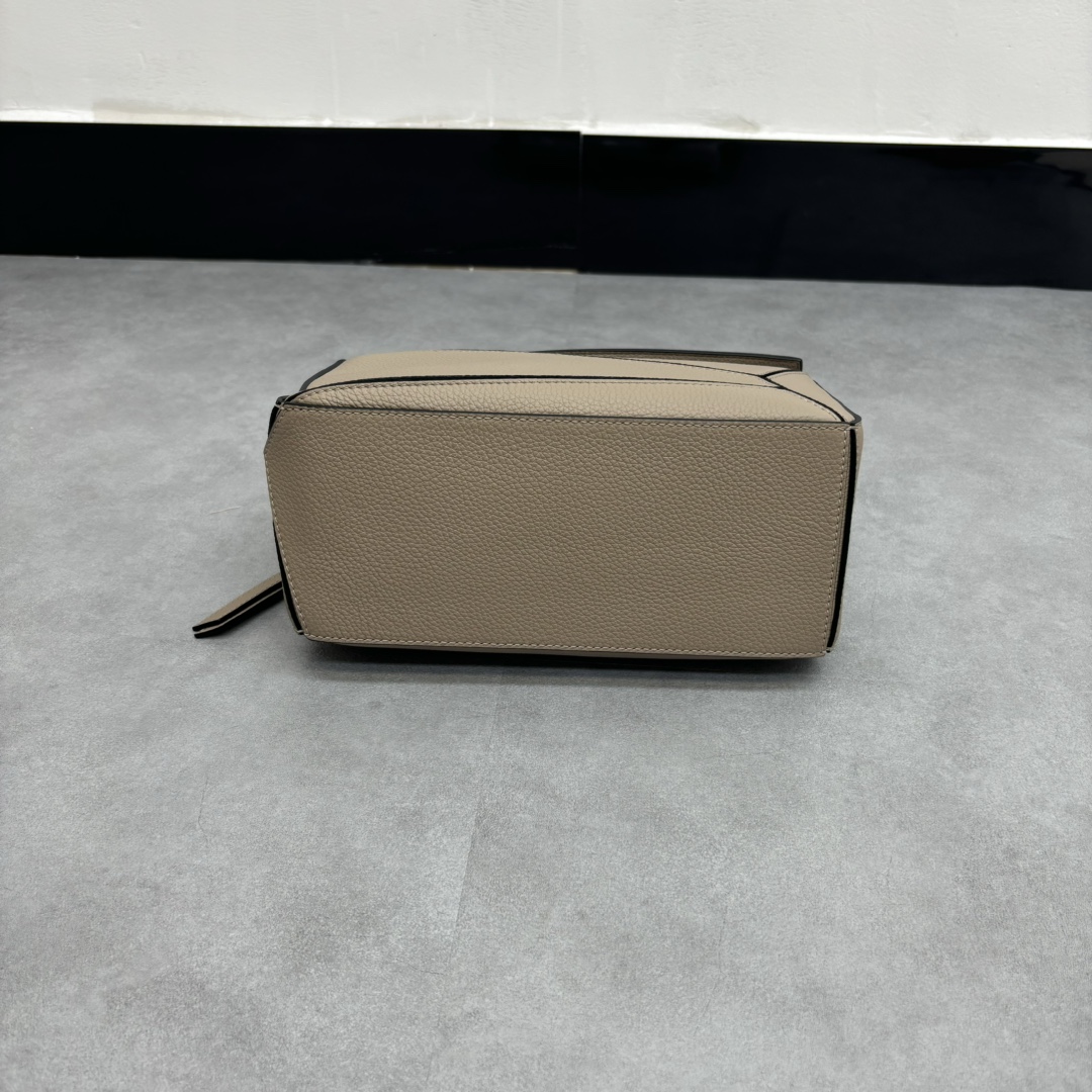 LOEWE Puzzle Small Bag made from sand calfskin leather with geometric design and adjustable strap. Dimensions: 24×10.5×15cm.