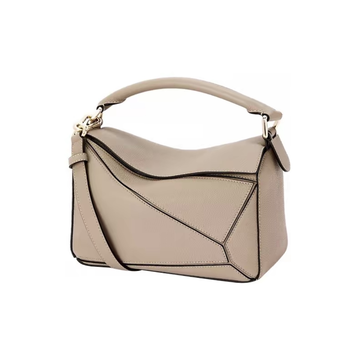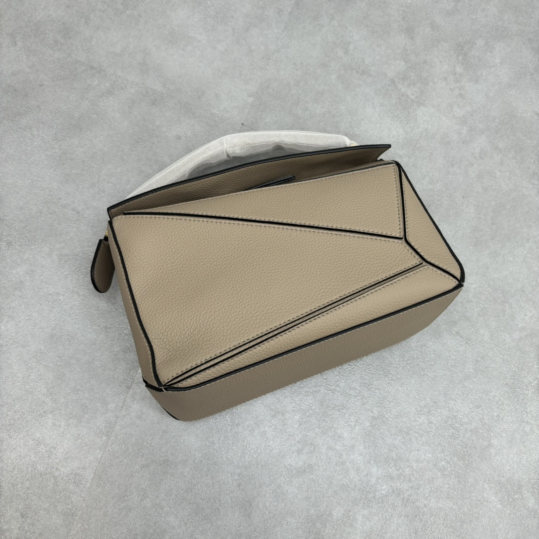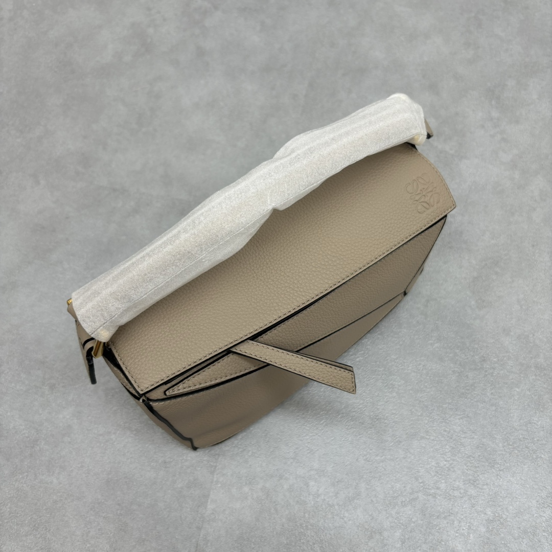 LOEWE Puzzle Small Bag made from sand calfskin leather with geometric design and adjustable strap. Dimensions: 24×10.5×15cm.